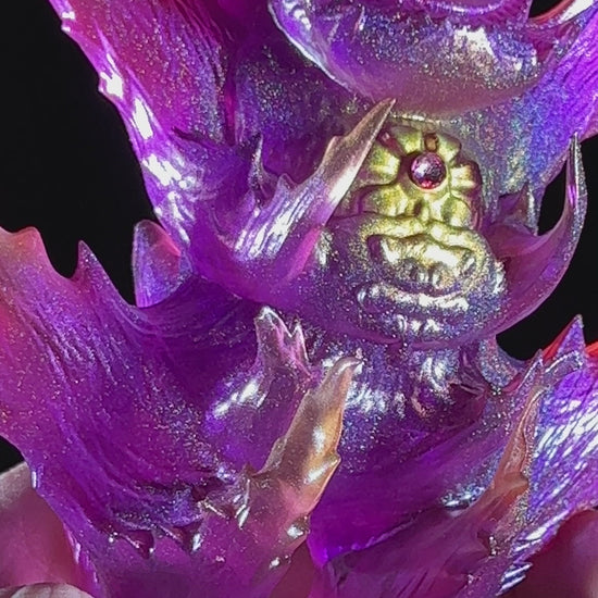 Resin printed, transparent yellow and purple, pearlescent pink and yellow. Covered with holographic glitter flake. About 6 1/2”