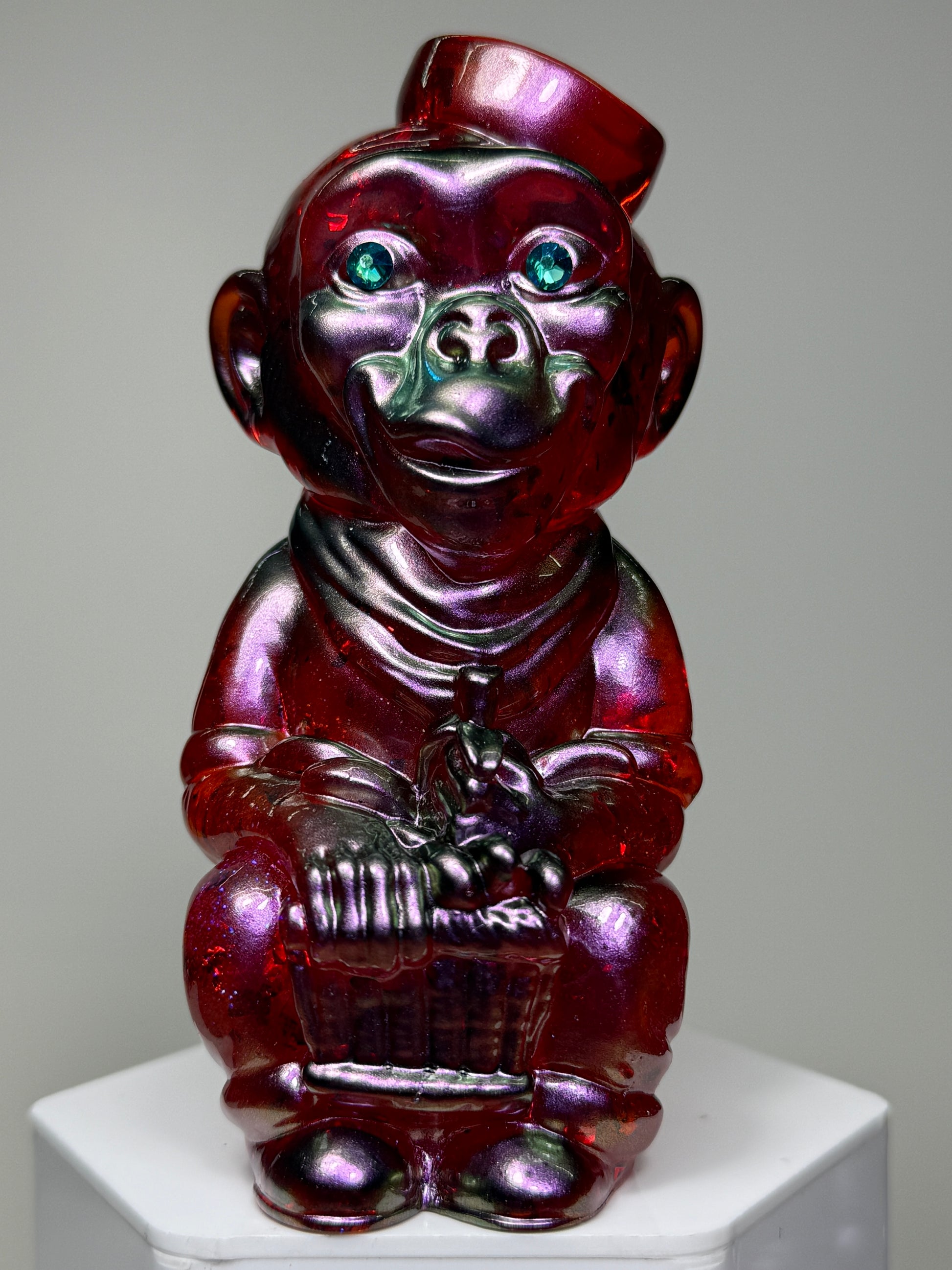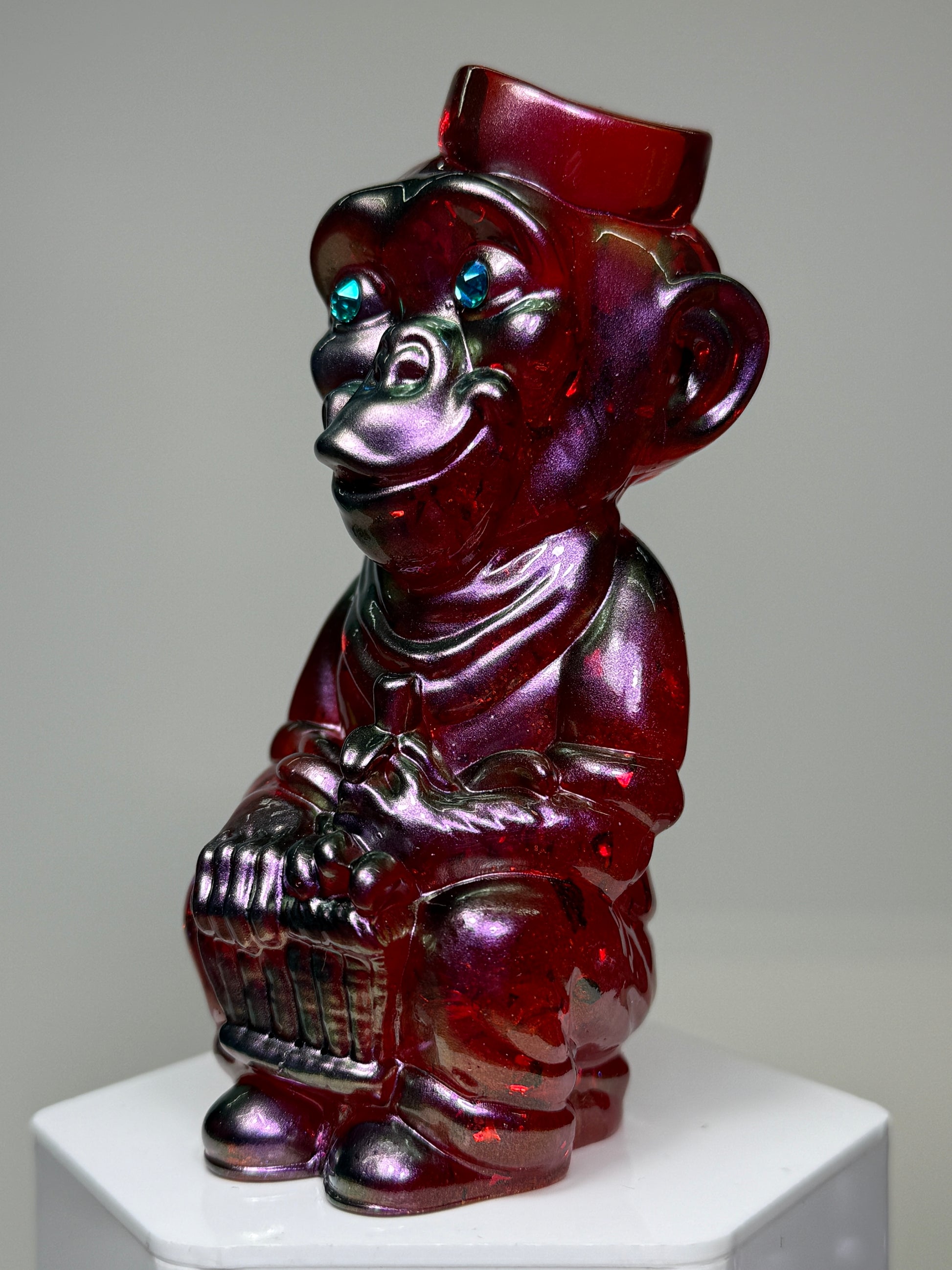 Happy monkey with a basket of bananas based on an old chalkware carnival prize bank from the 30s or 40s