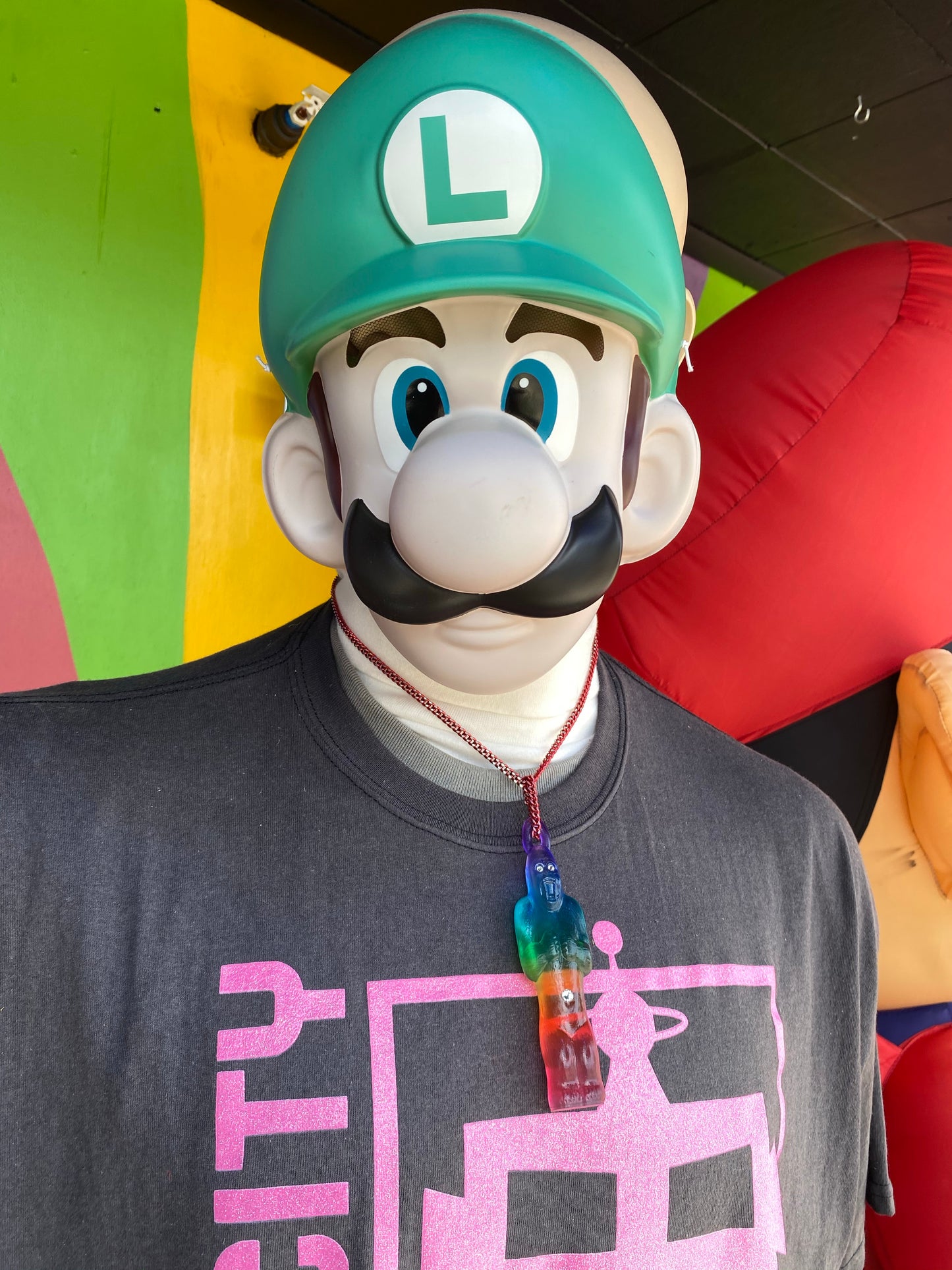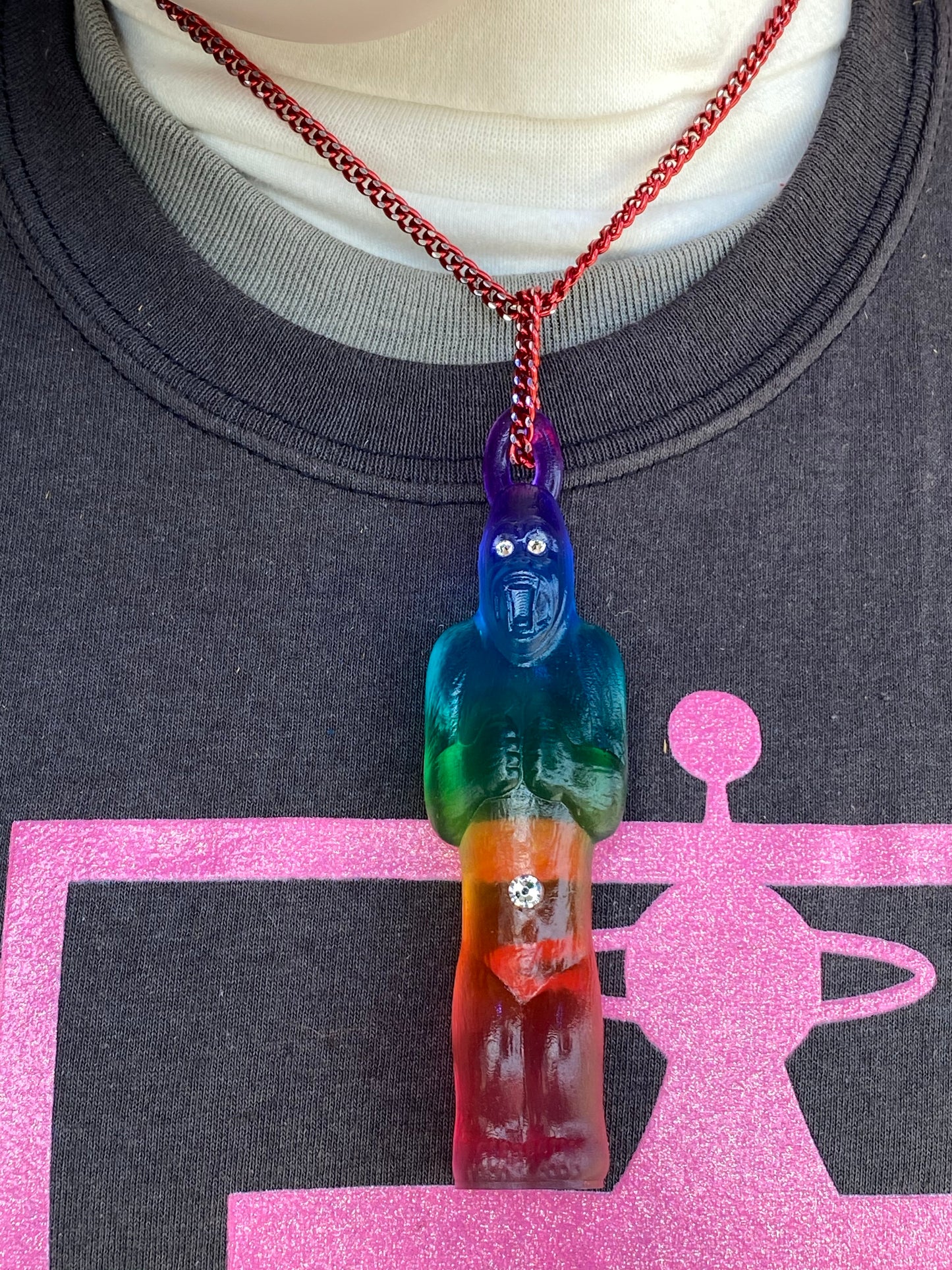 Stretched out and flattened, printed in clear resin and painted rainbow. Colorful chain. Oversized charms are 4 3/4 tall, chains are 18”