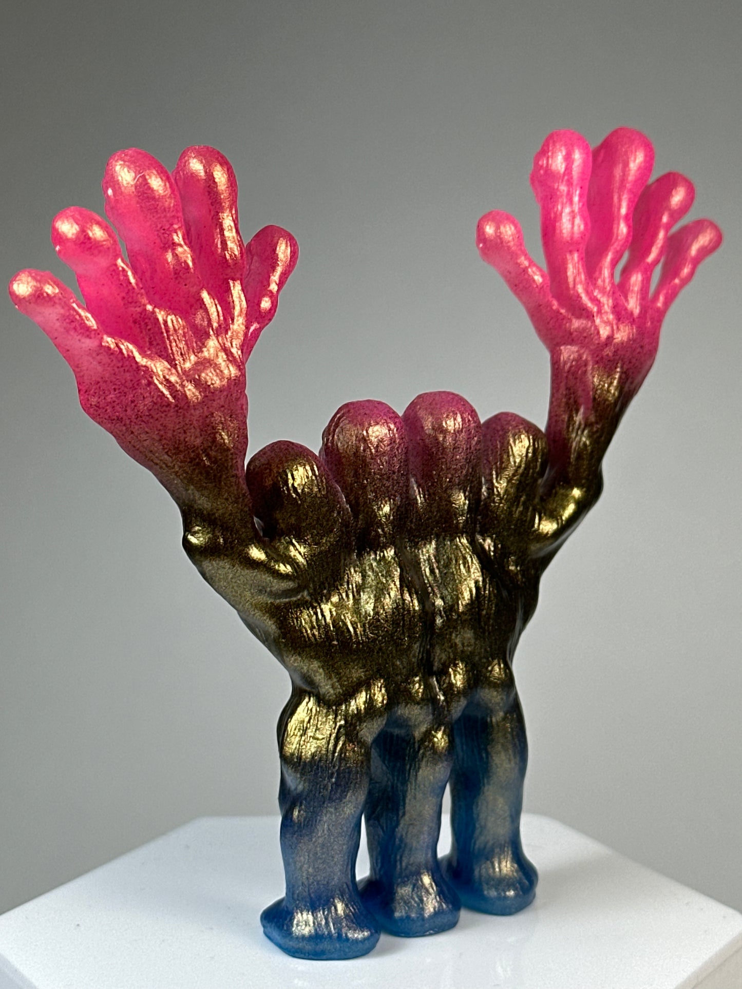 Chrome gold, neon pink and blue. 4”
