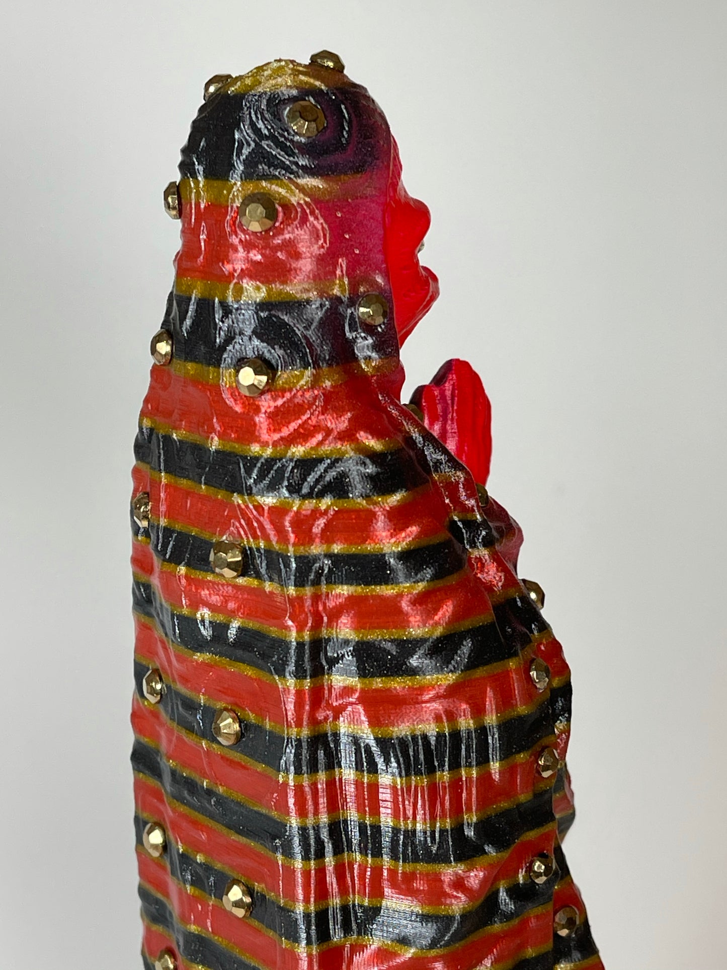 Printed in glitter black, red and gold. Bronze rhinestones. Powerful and serious. About 9 1/2”