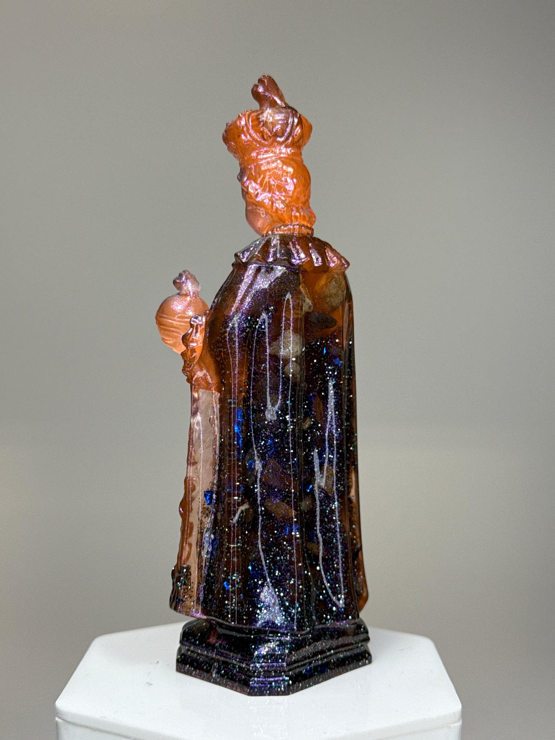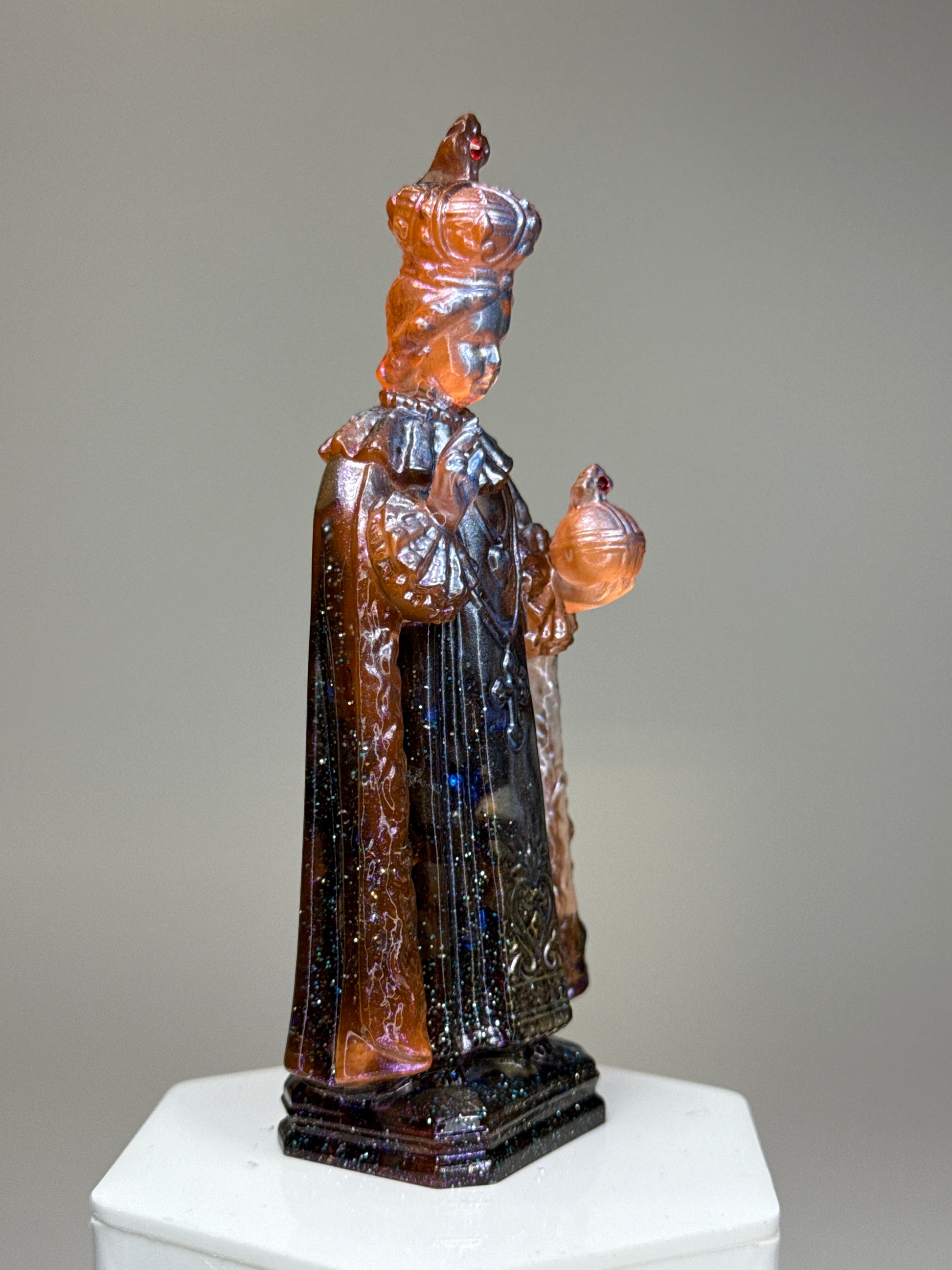 “The left hand encircles a miniature globe, surmounted by a cross, signifying the world-wide kingship of the Christ Child. The right hand is extended in blessing with the first two fingers being upraised to symbolize the two natures of Christ, while the folded thumb and last two fingers touch each other representing the unity of the Father, The Son, and the Holy Spirit in the mystery of the Blessed Trinity.”