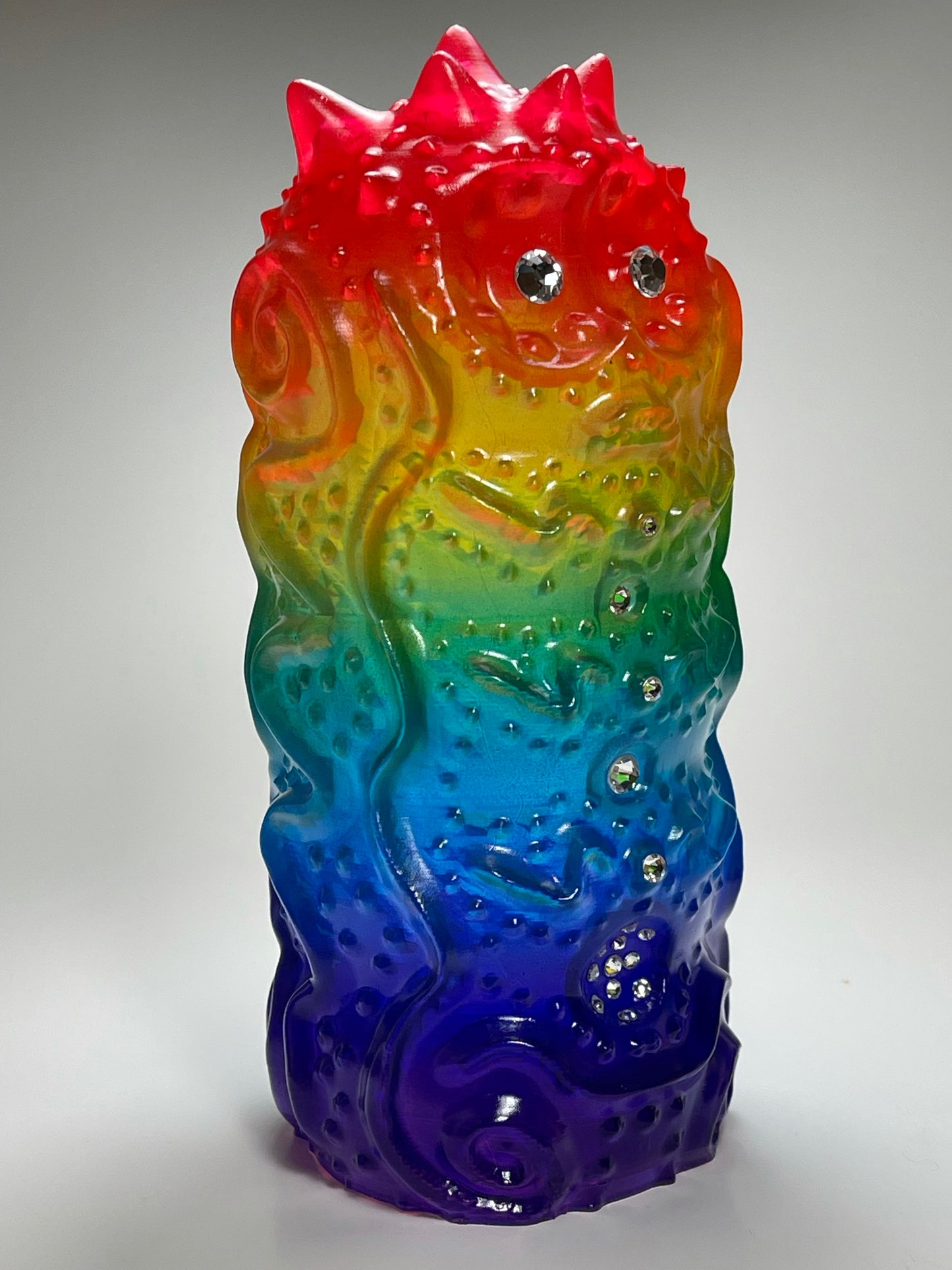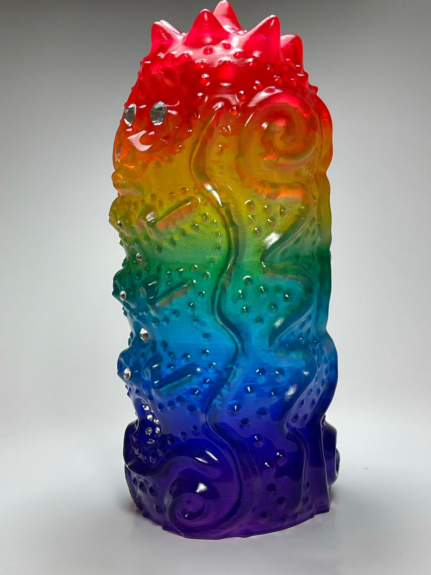 Resin printed 8 1/2” mega sized robot worm painted transparent rainbow.