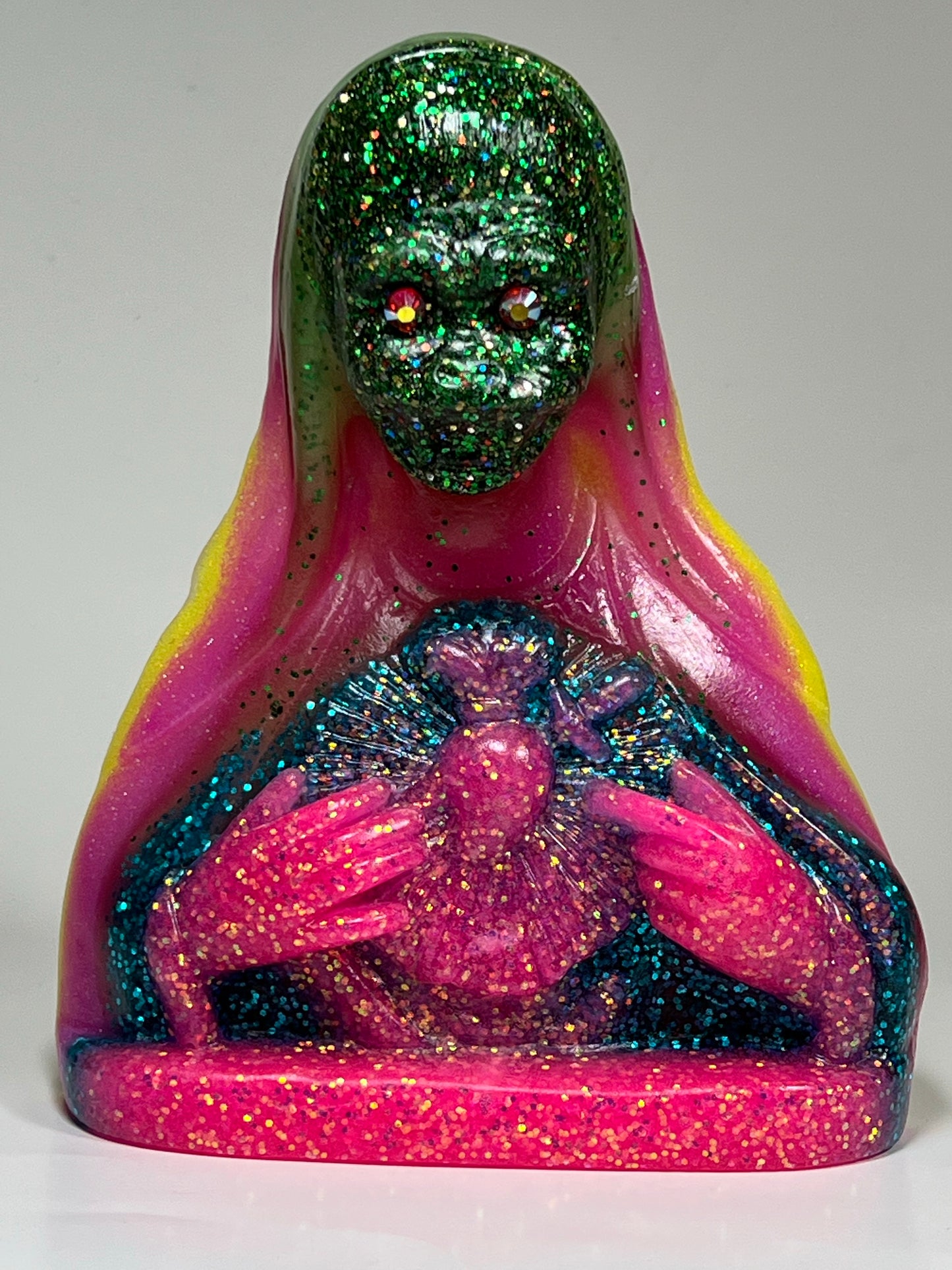 Sacred ape, over a pound of resin in glow in the dark neon and glitter. Very UV light reactive as well. 7x6”