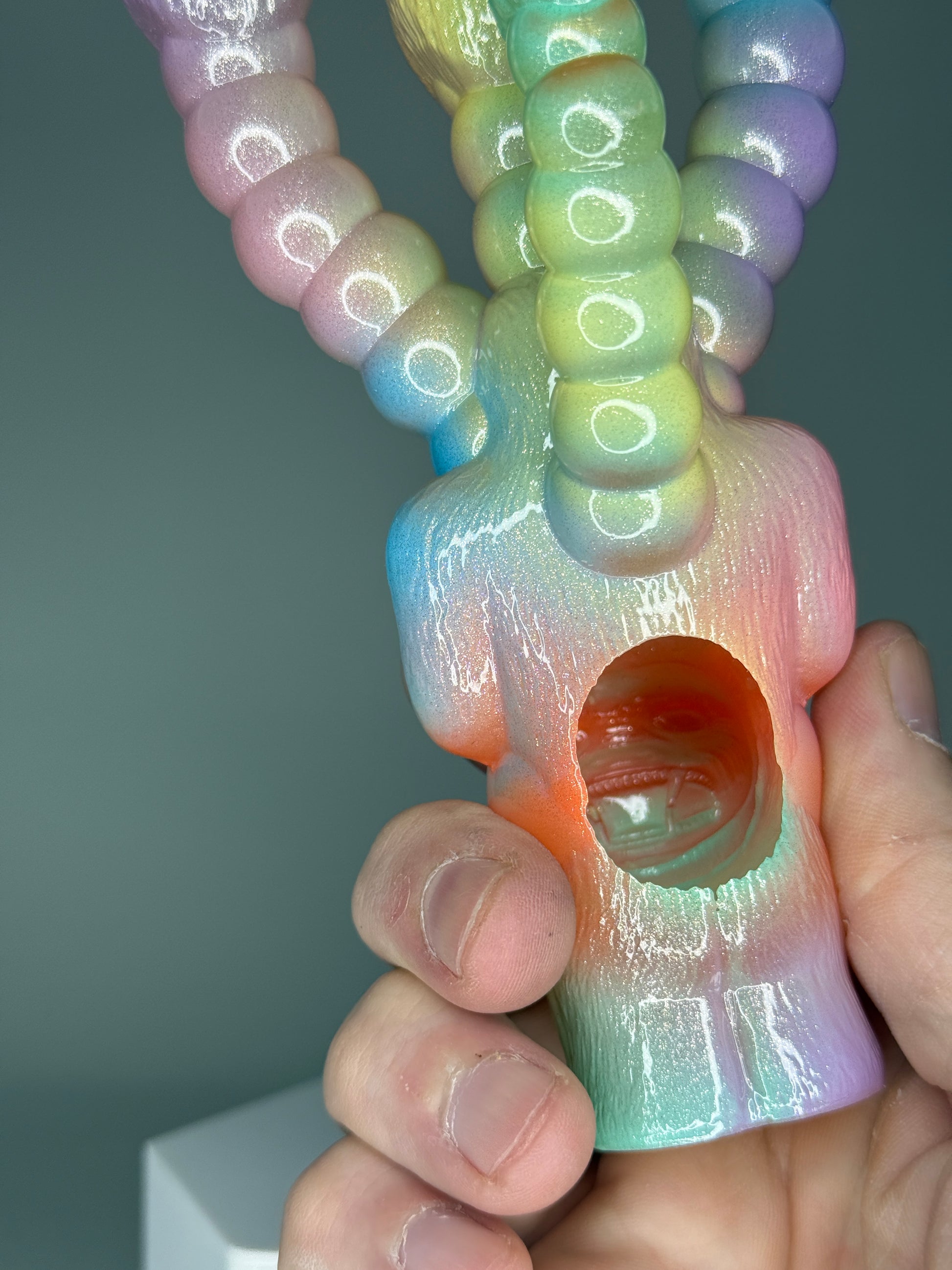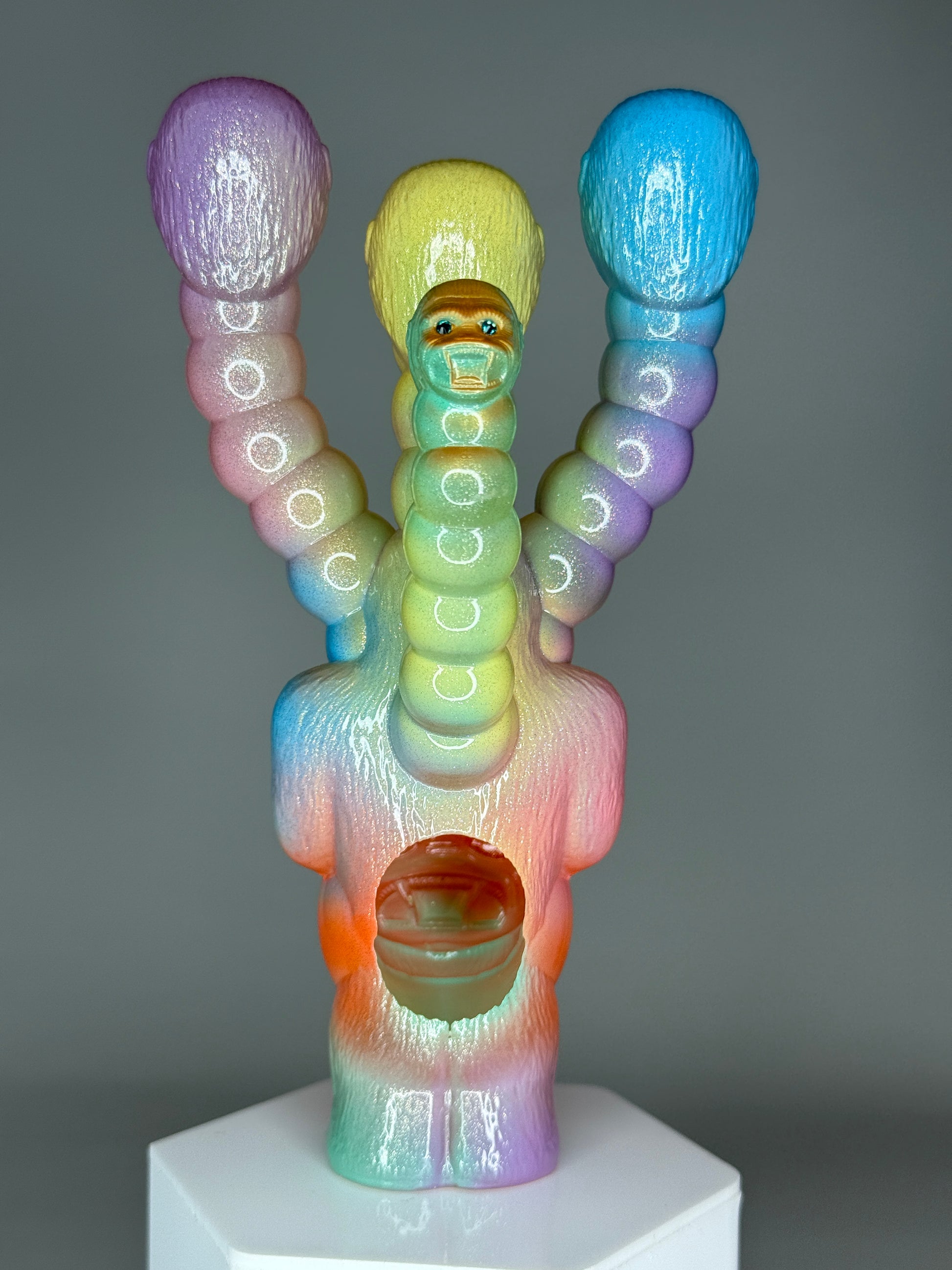 5 headed terror of an unknown planet with a negative image of himself cut into his large stomach.