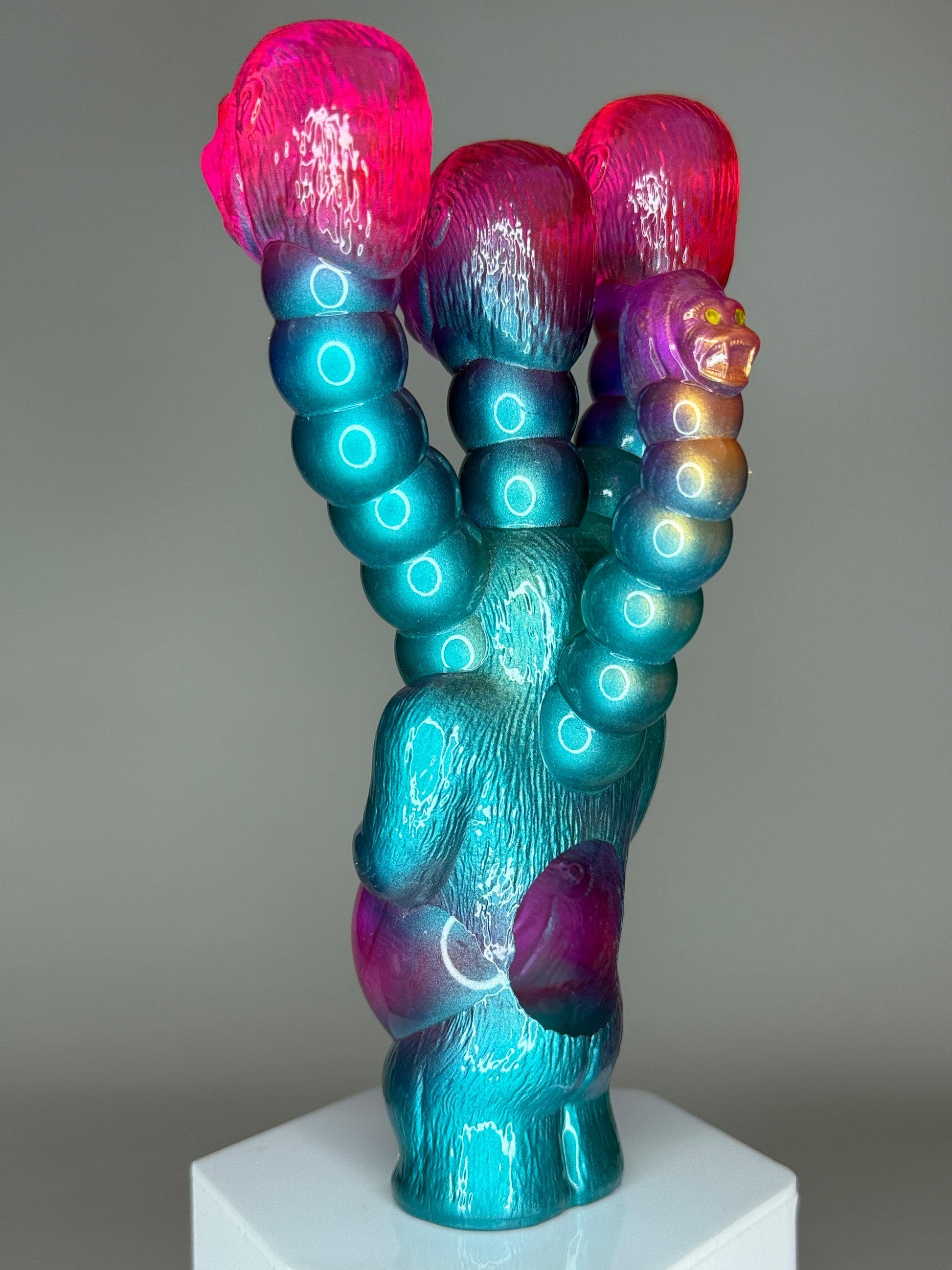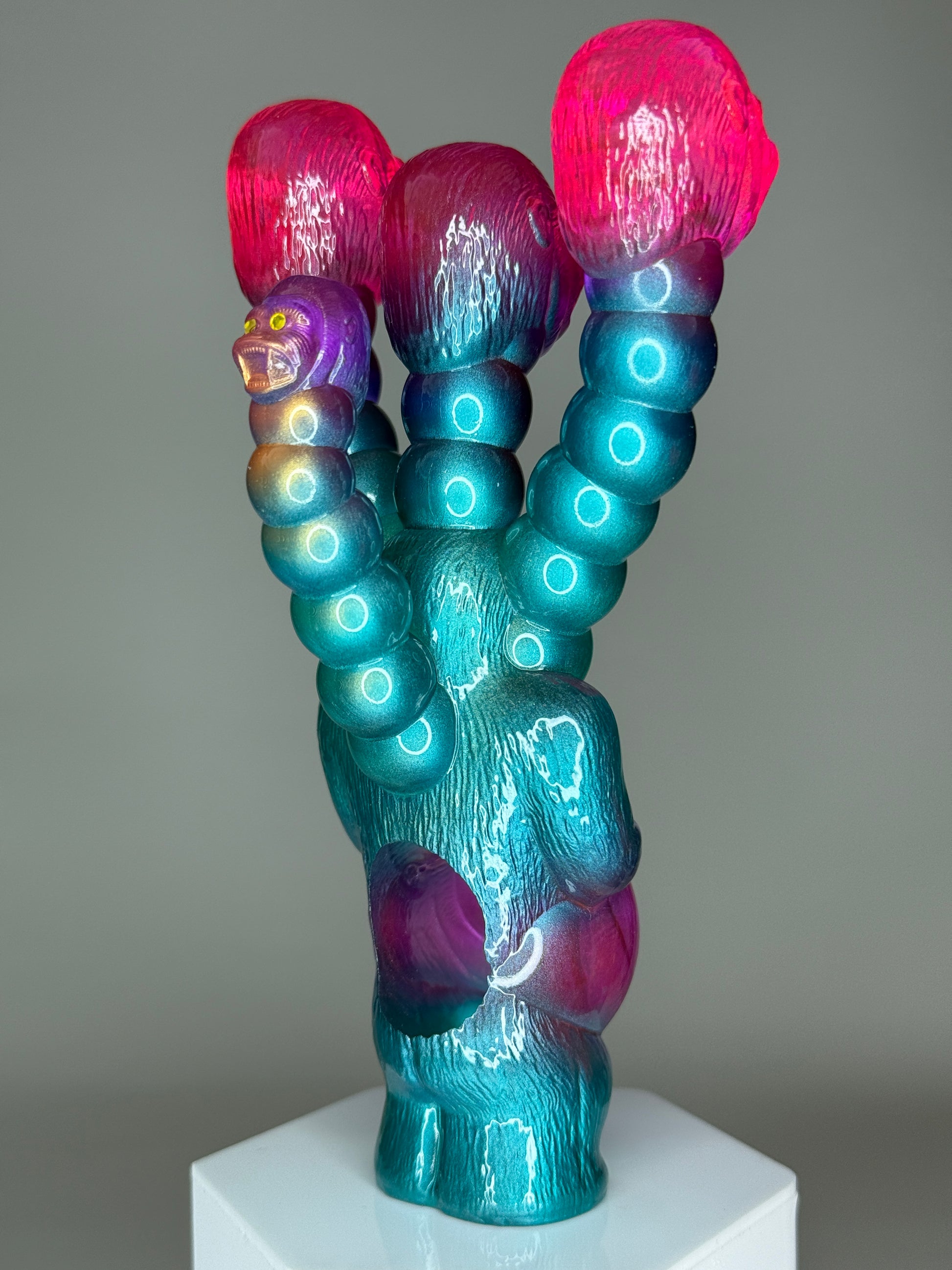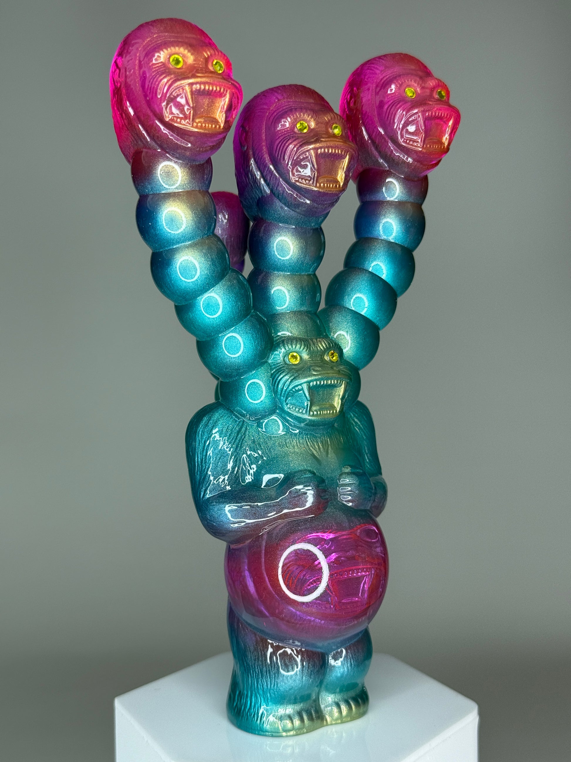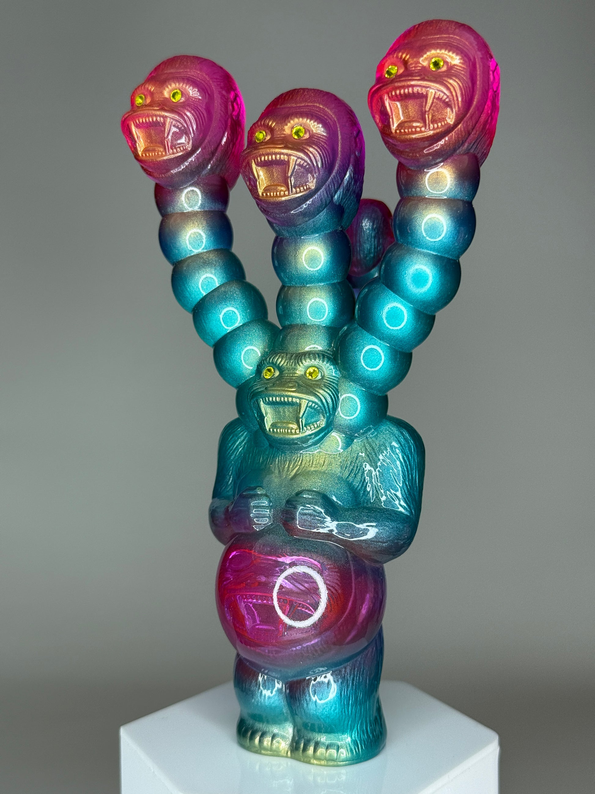 5 headed terror of an unknown planet with a negative image of himself cut into his large stomach.