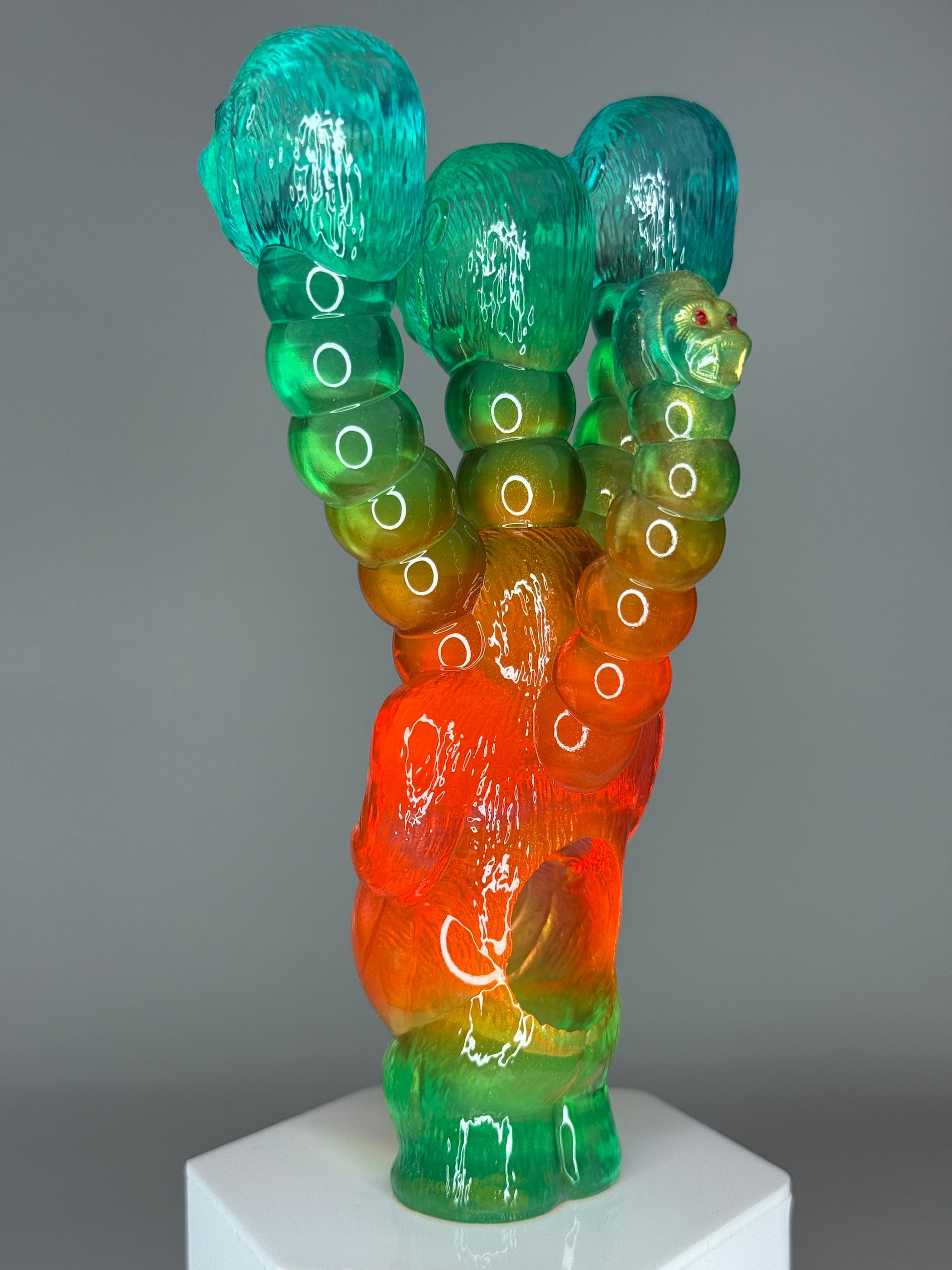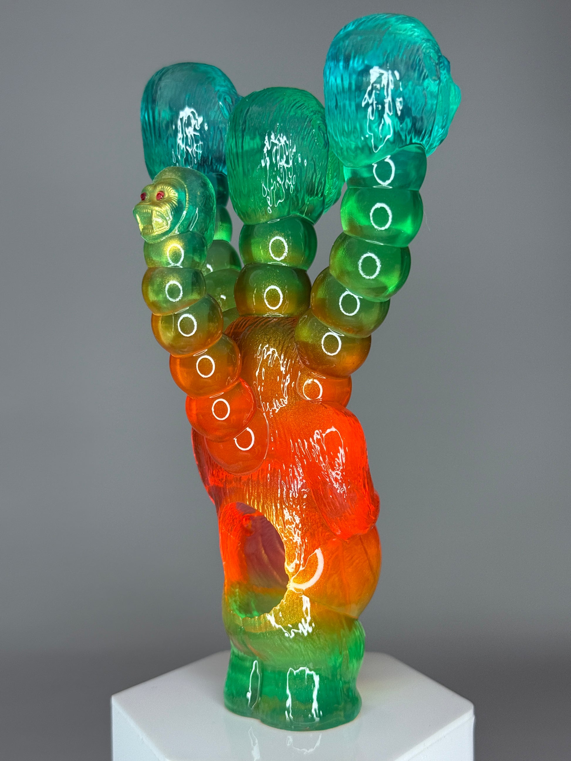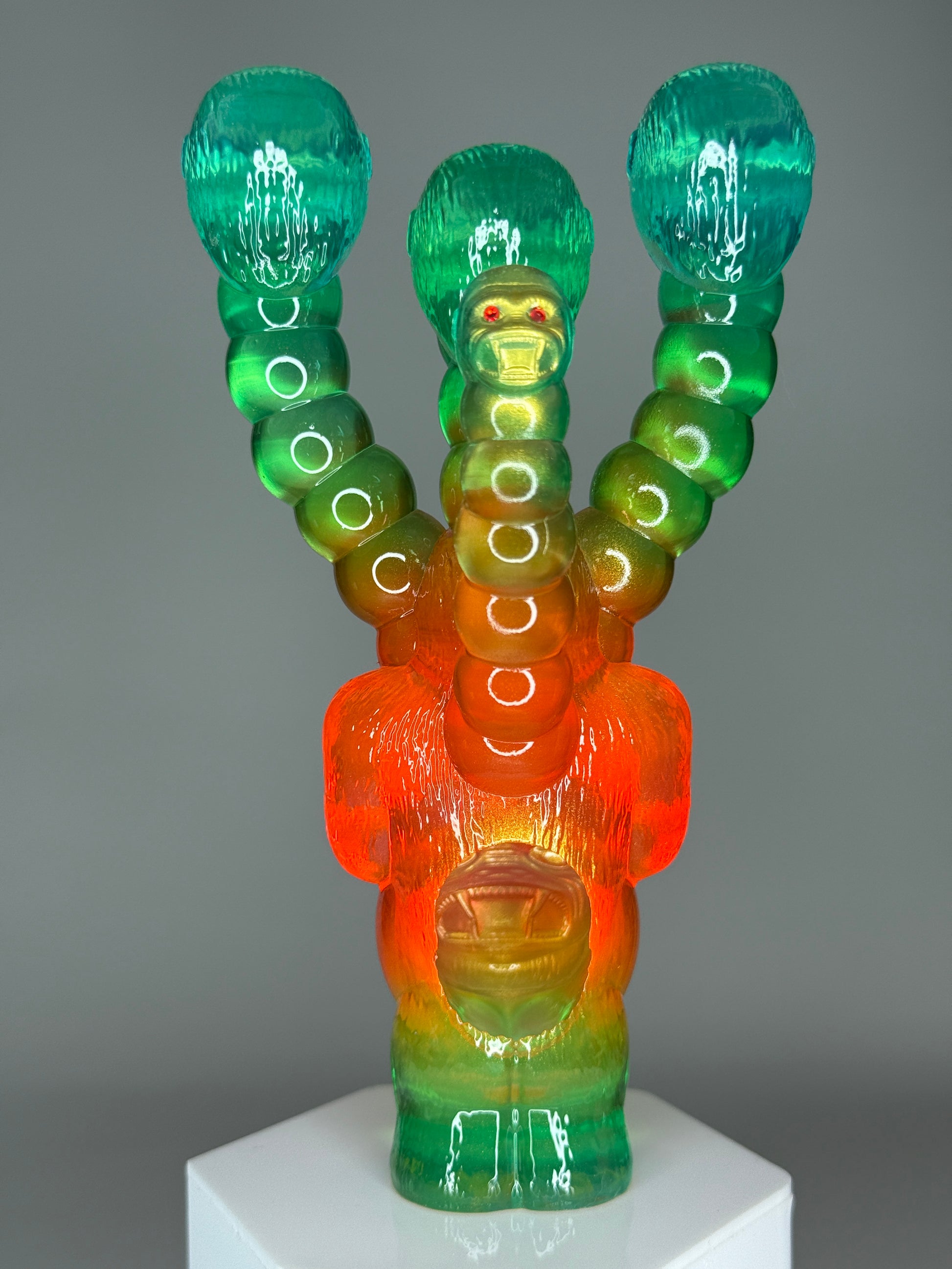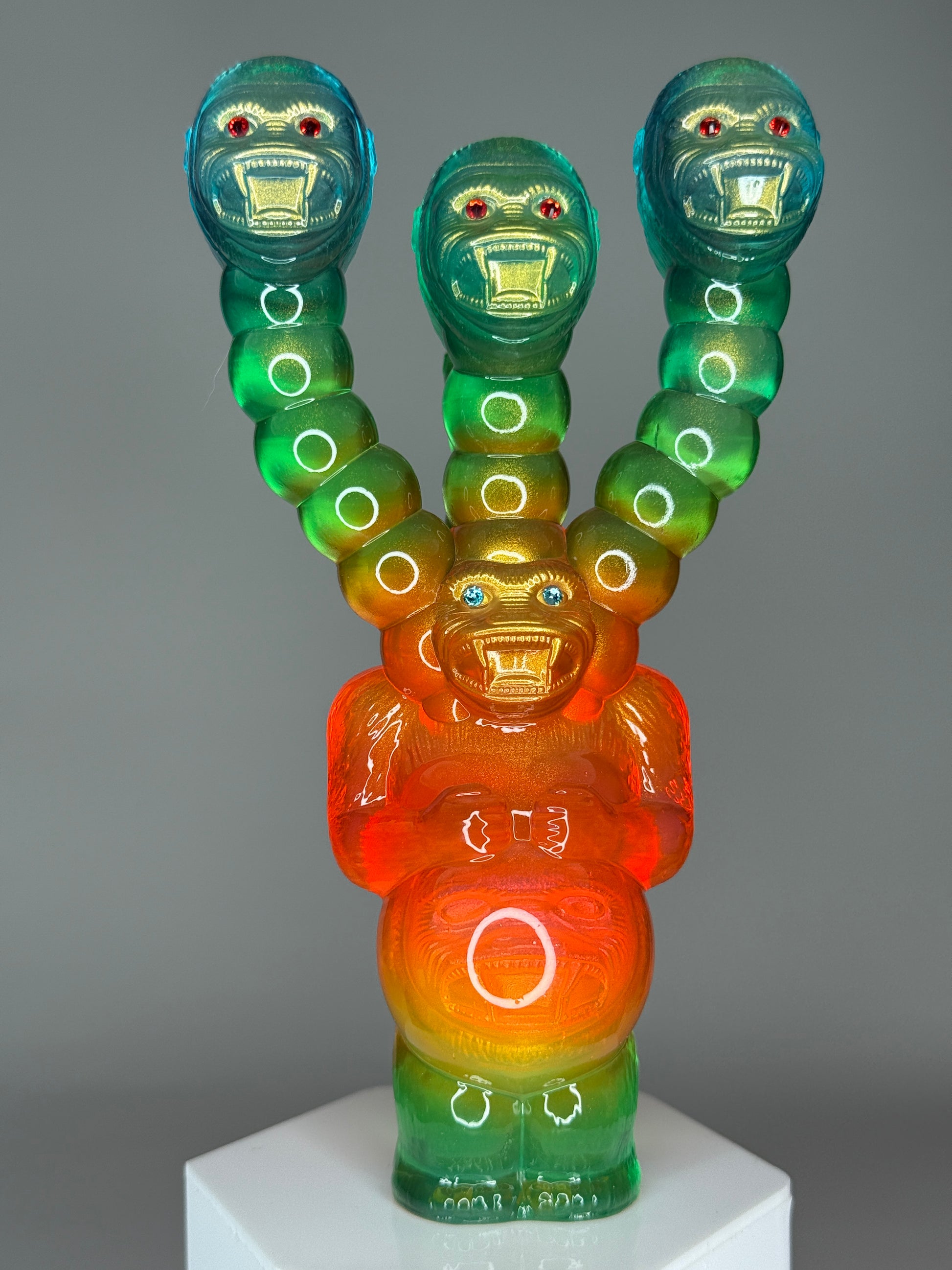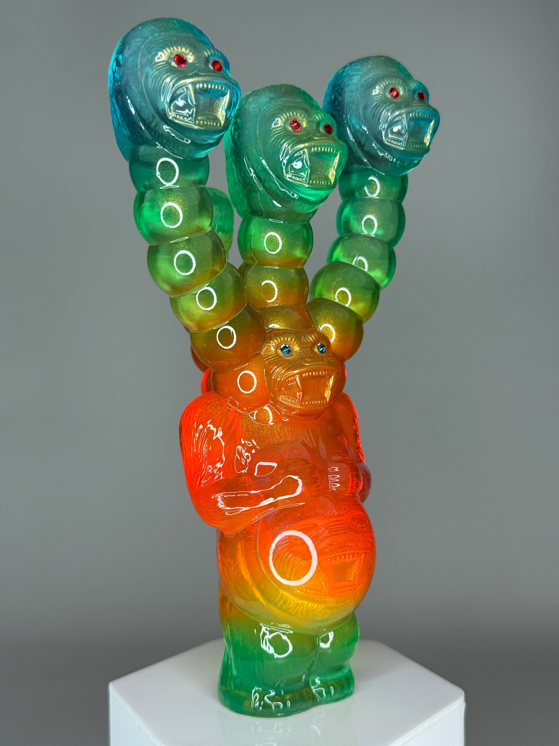 5 headed terror of an unknown planet with a negative image of himself cut into his large stomach.
