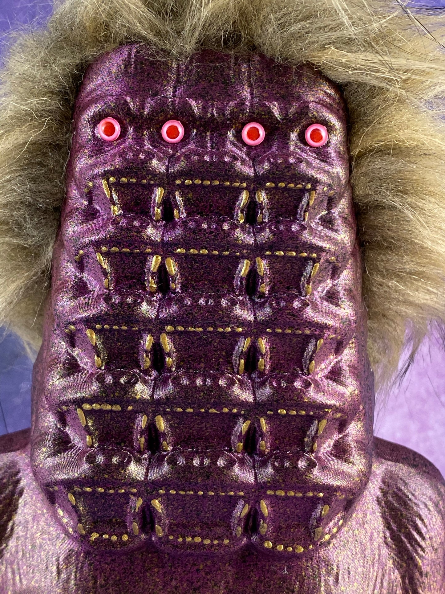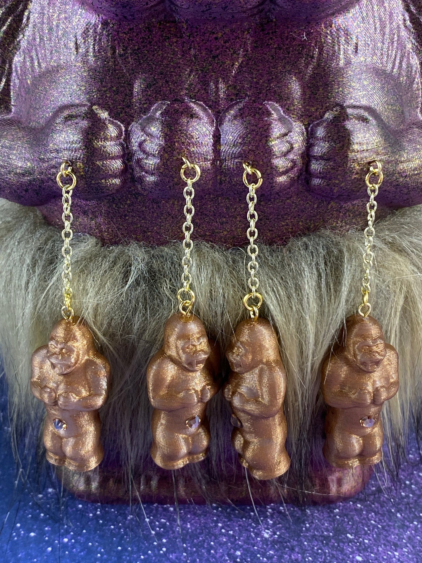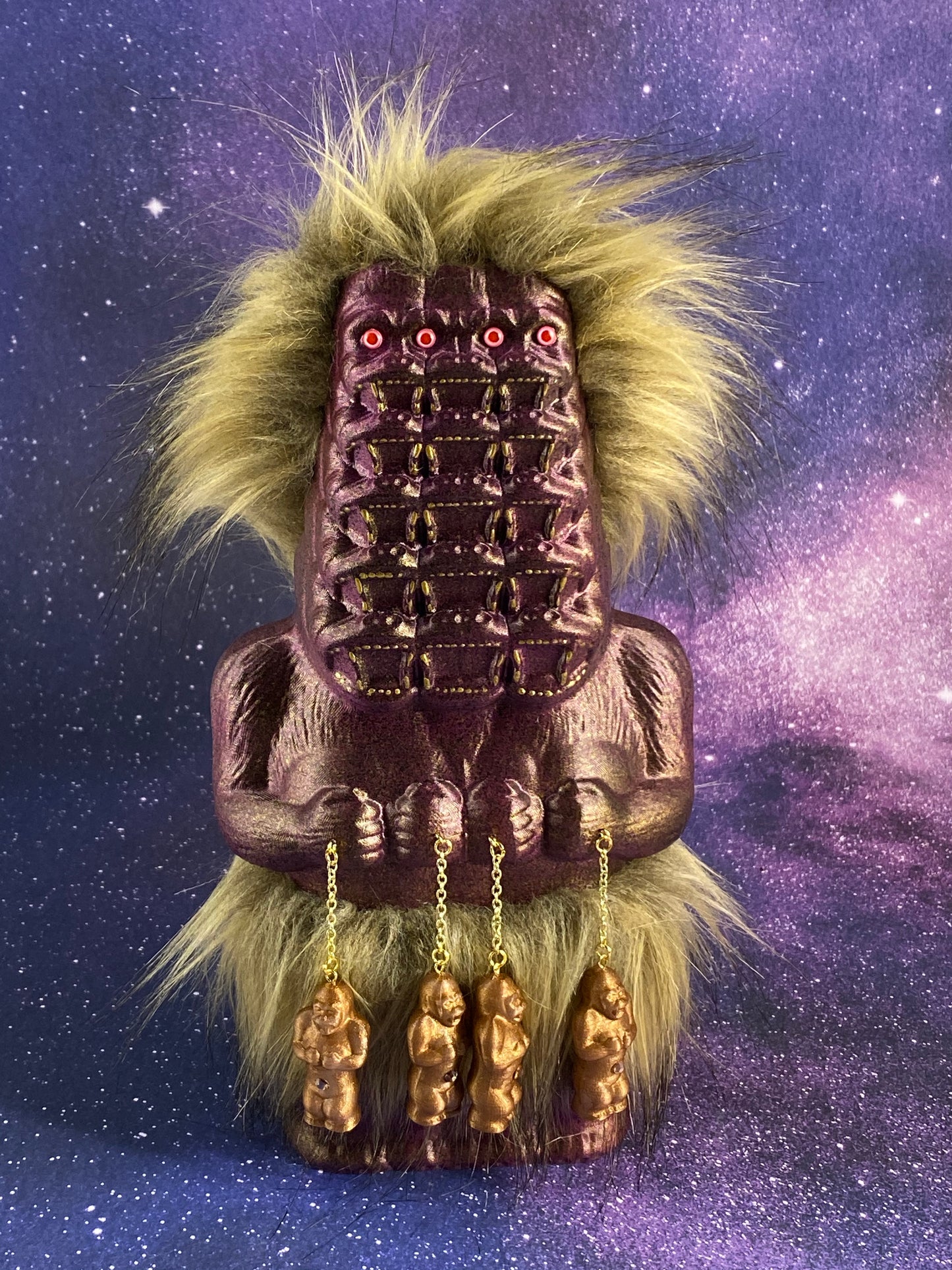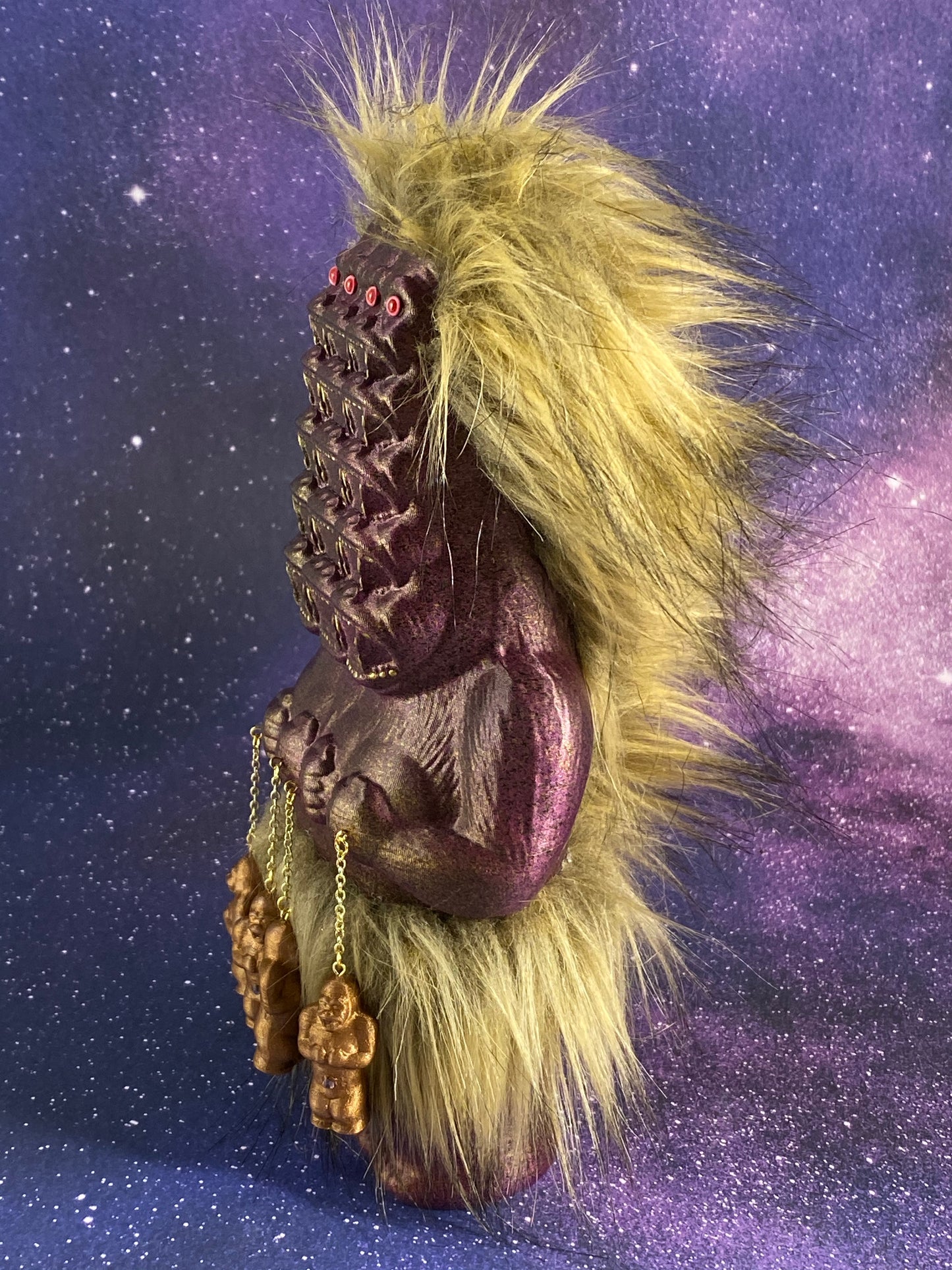 Tall stack ape painted in purple and gold holding 4 small apes. Realistic fake hair. Beady pink eyes.