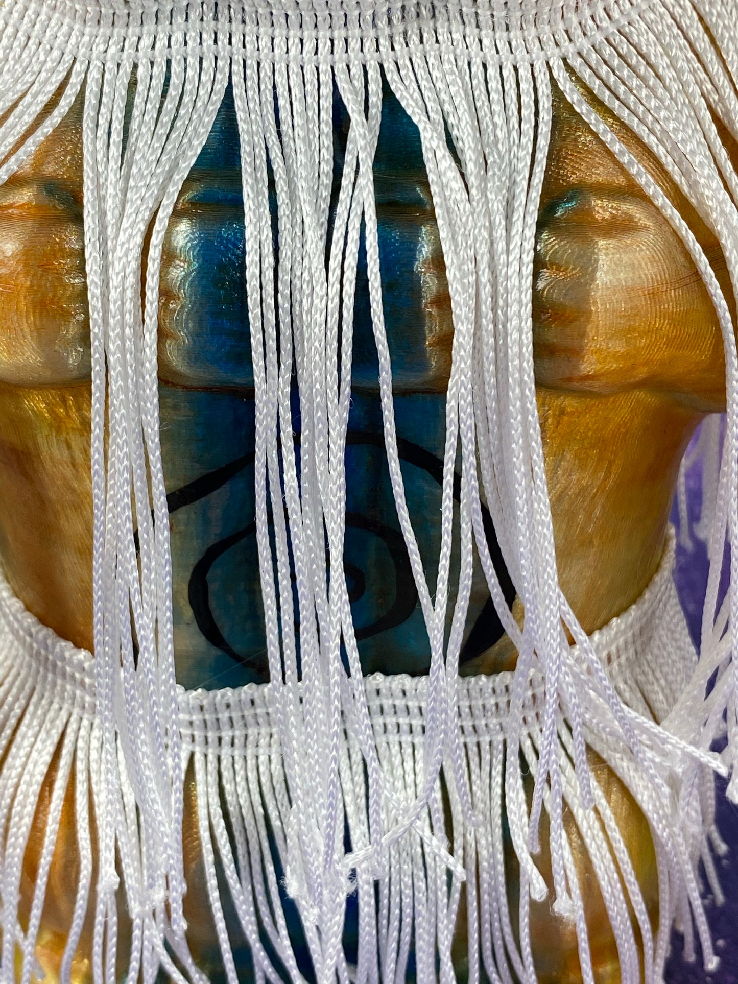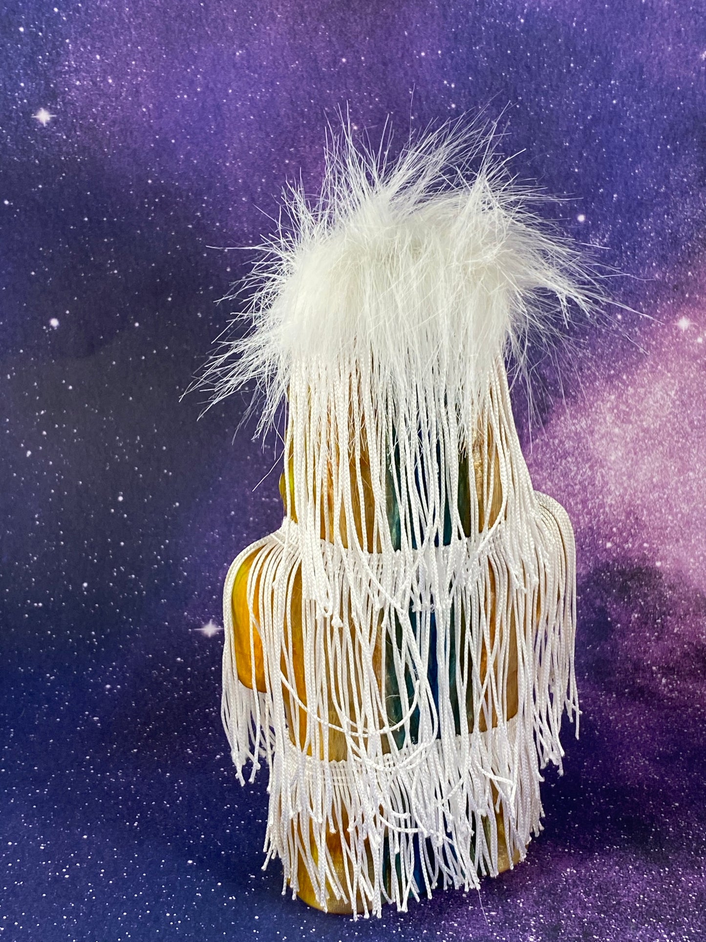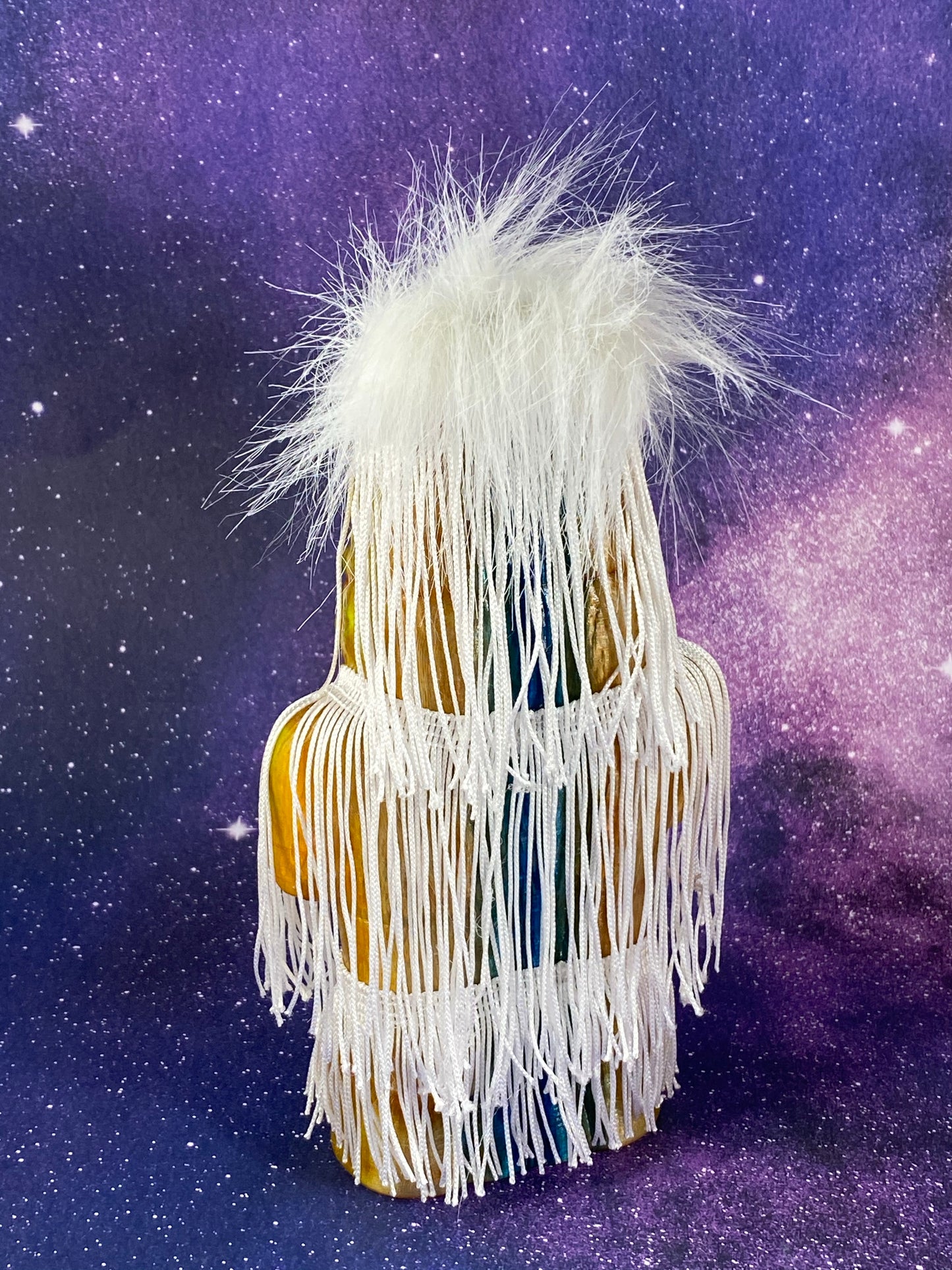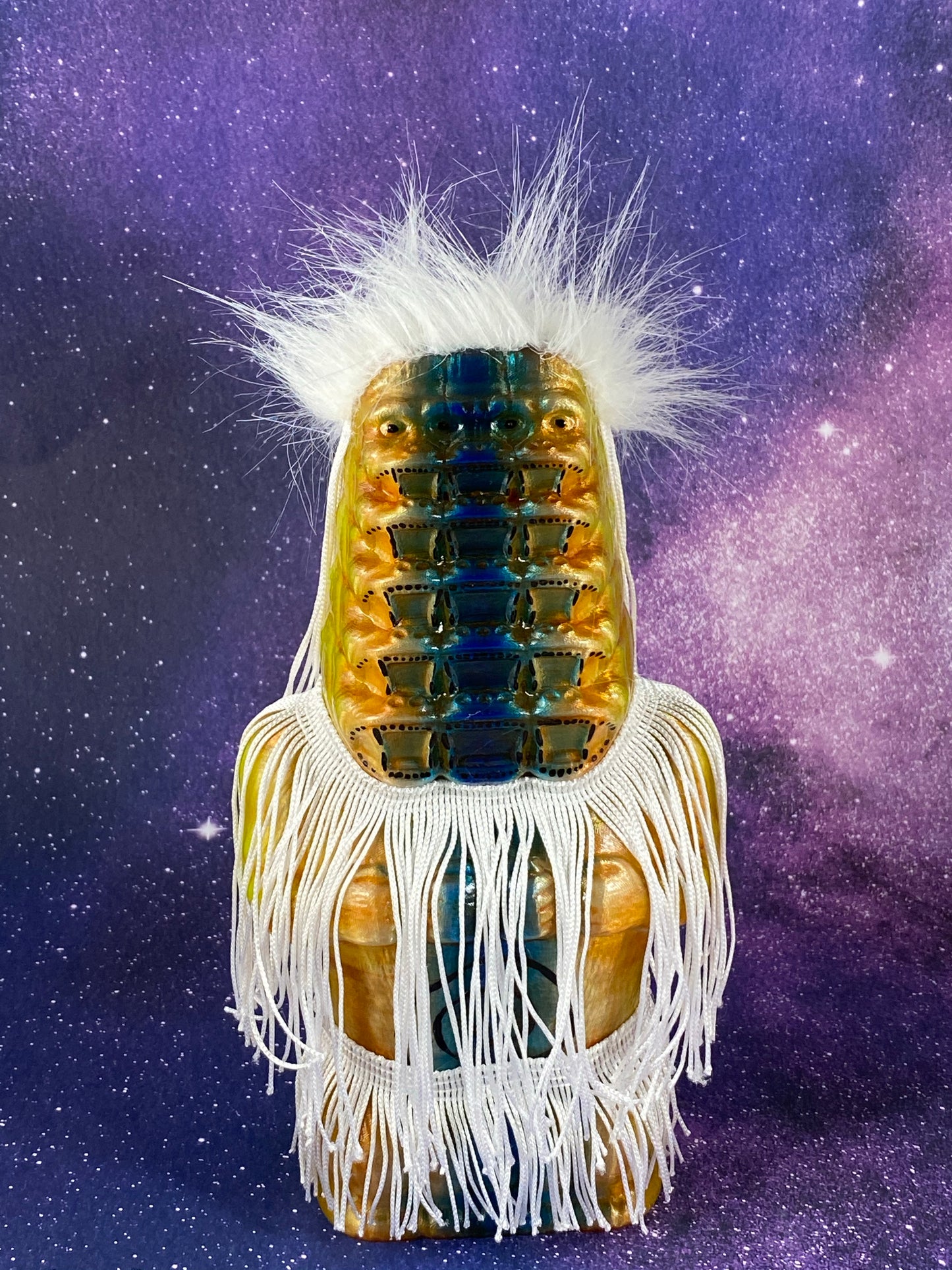 Tall stack ape, transparent with blue and yellow. Hand painted eyes, teeth and swirl. Three layers of white stuff as well as white hair.
