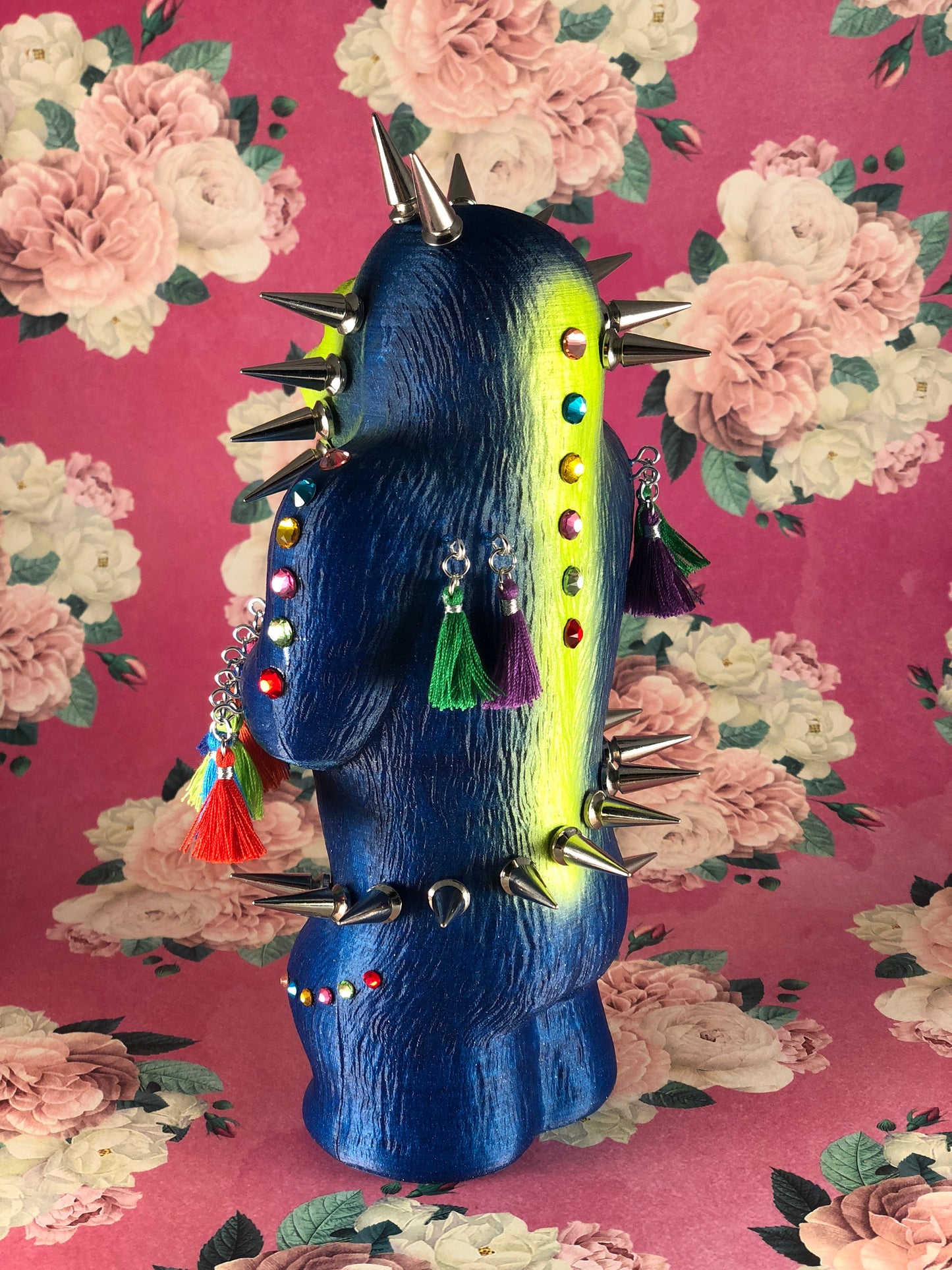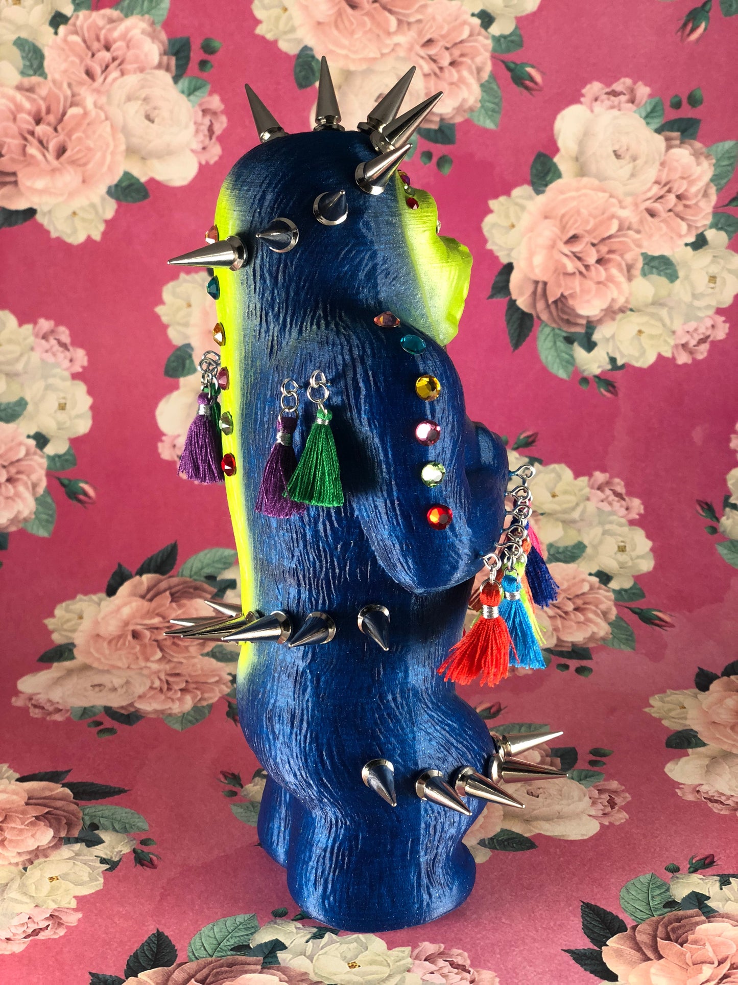 This here Ape has tassels, rhinestones and spikes. Printed in blue that was infused with multi color glitter. About 10” tall.