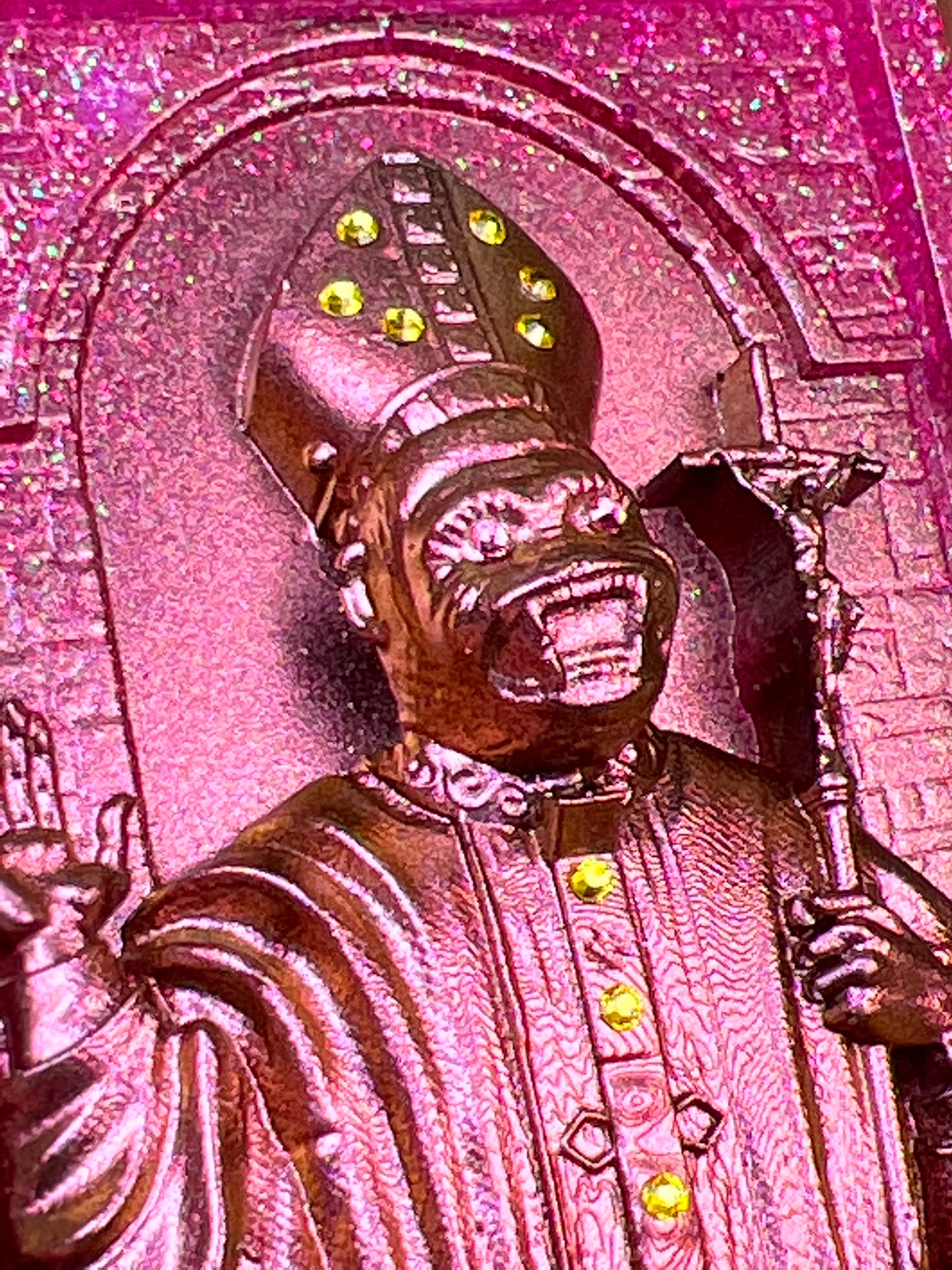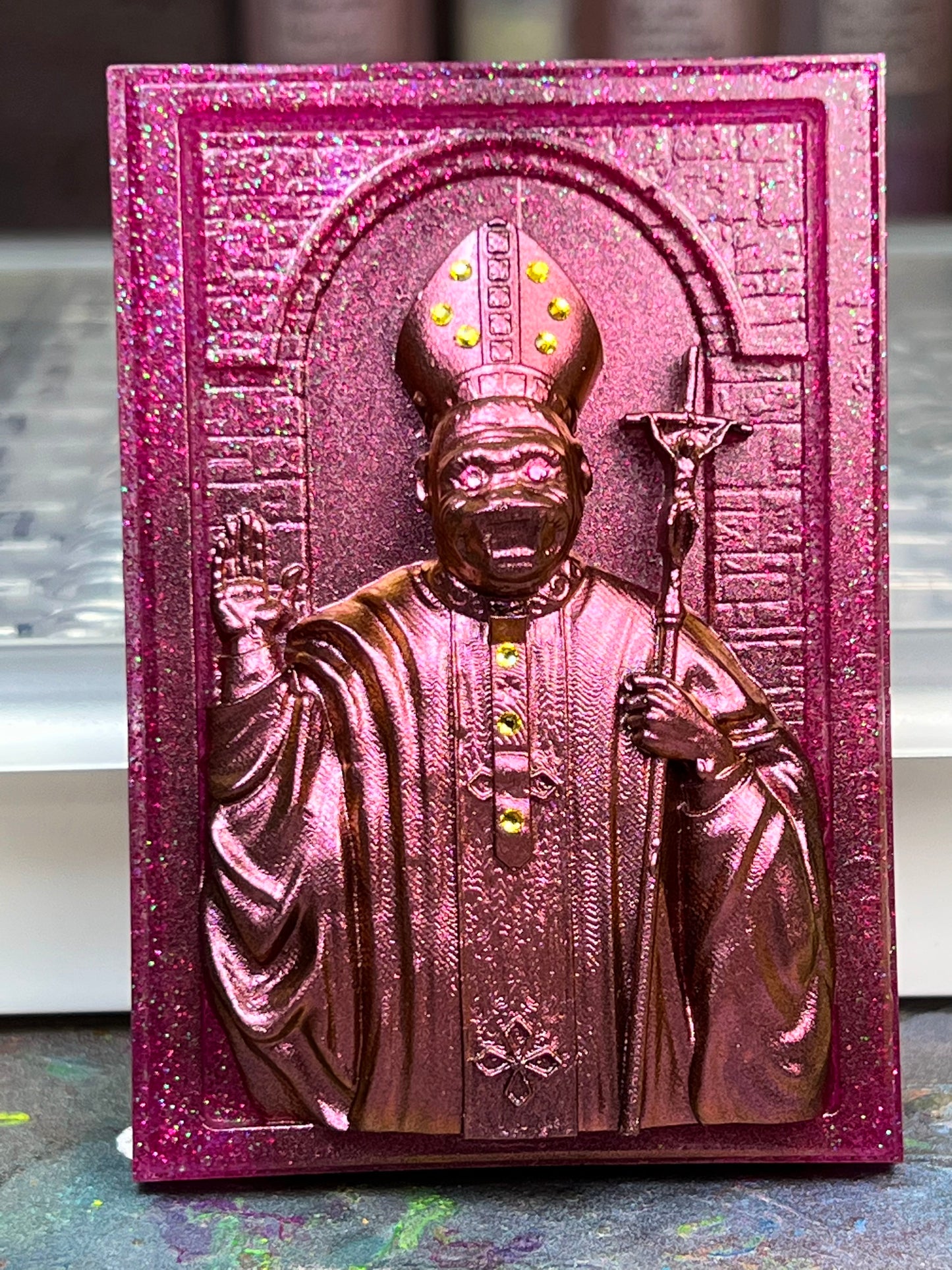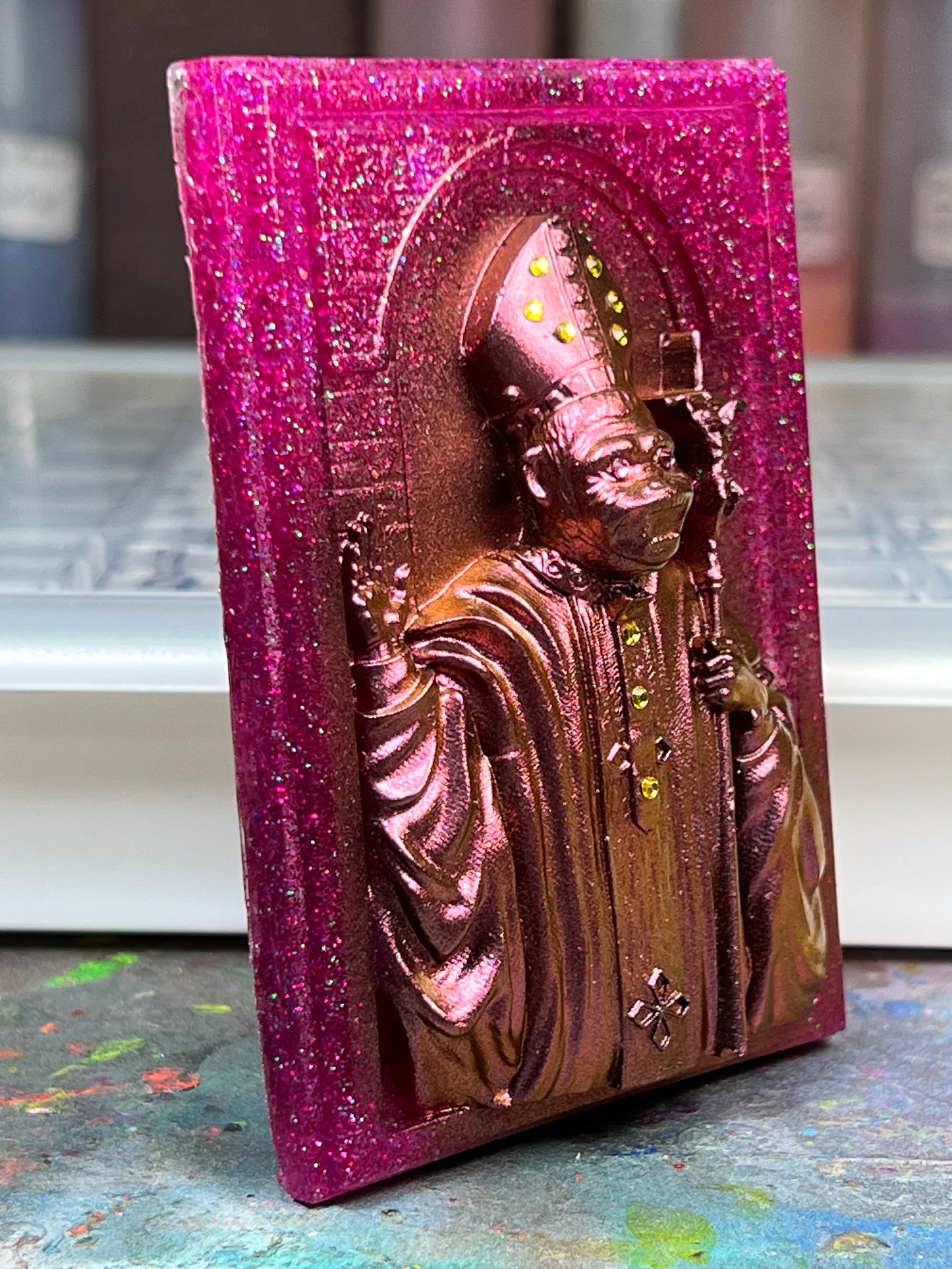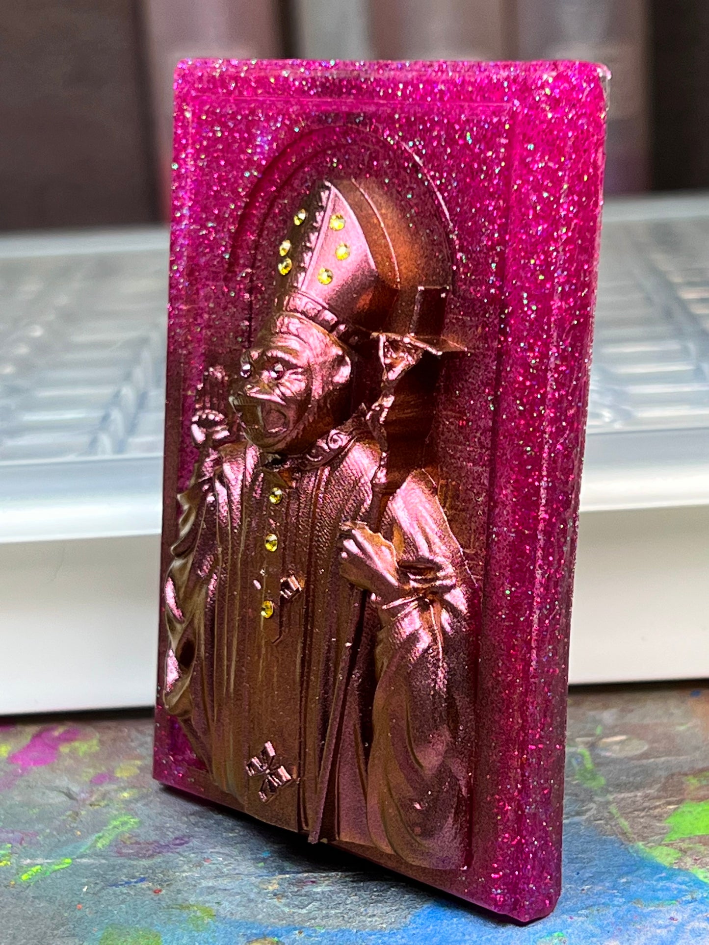 Resin cast in pink and green glitters, painted in color shifting paint and embellished with blessed rhinestones.