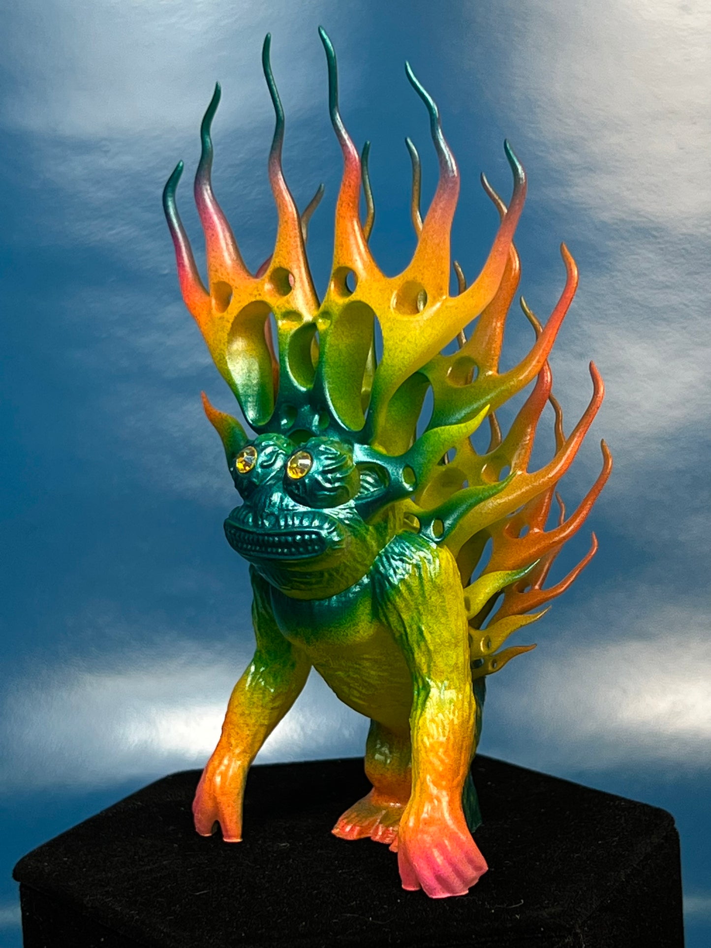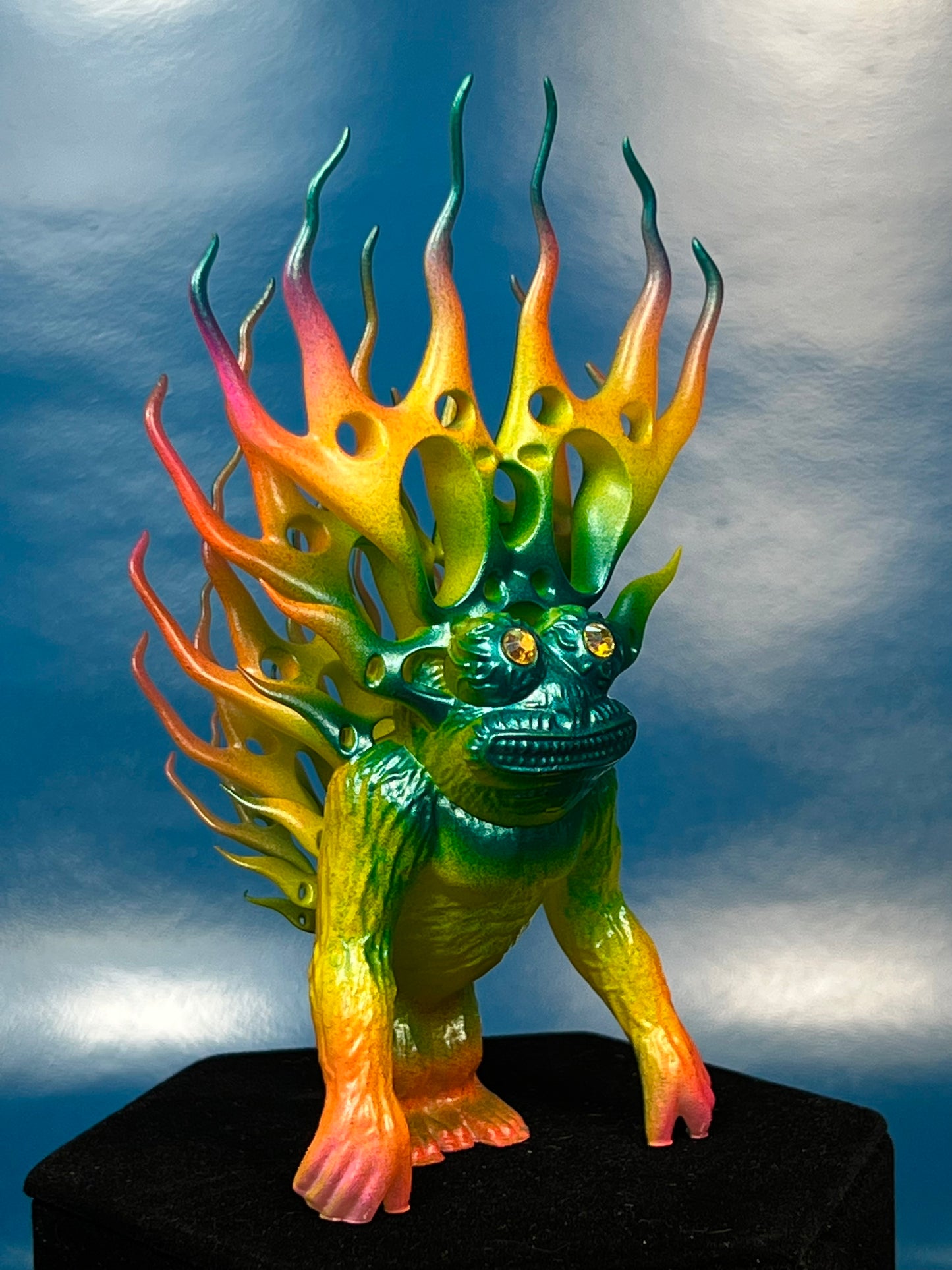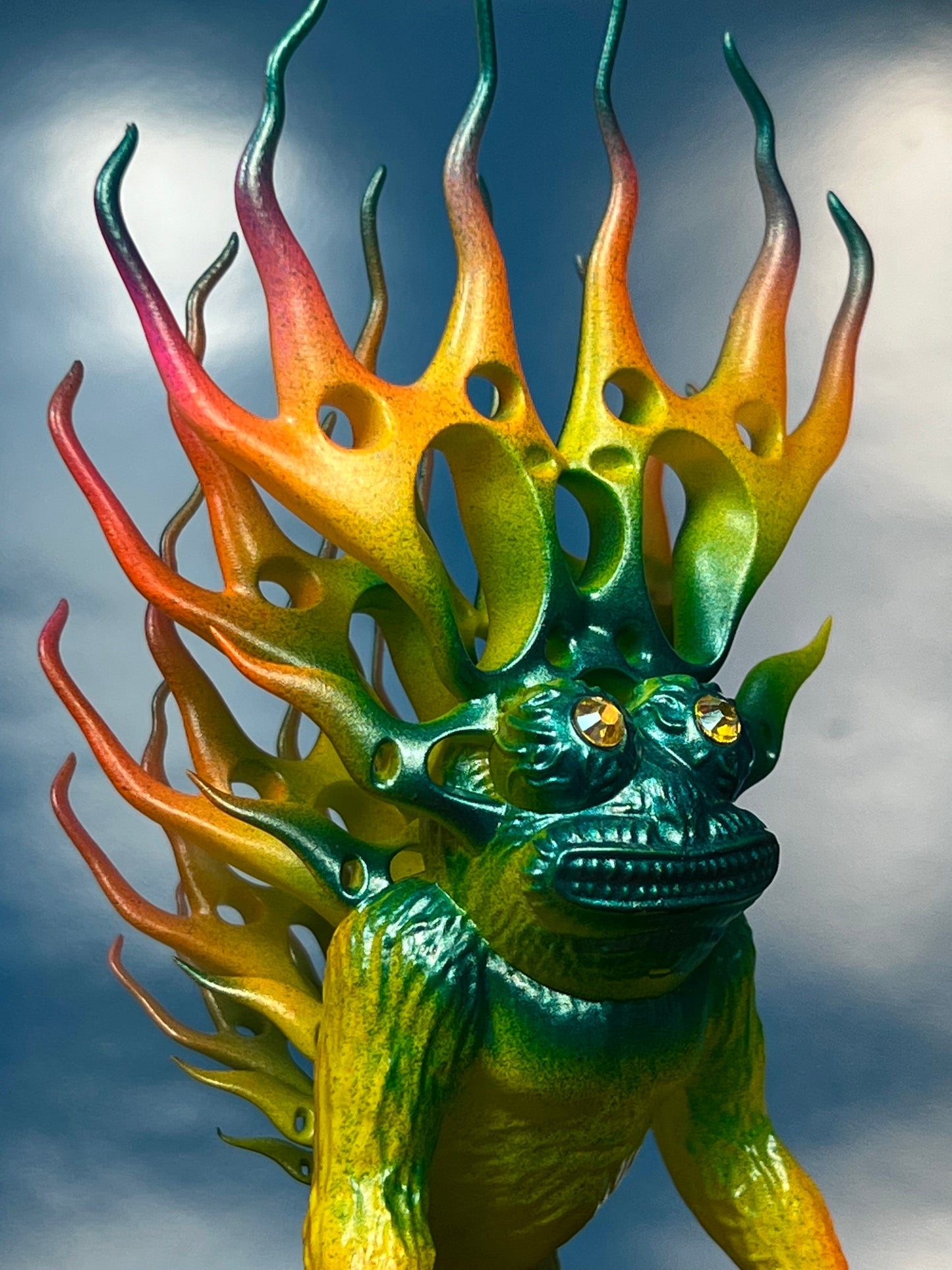 Resin printed. Painted in neon and metallic colors. About 5”