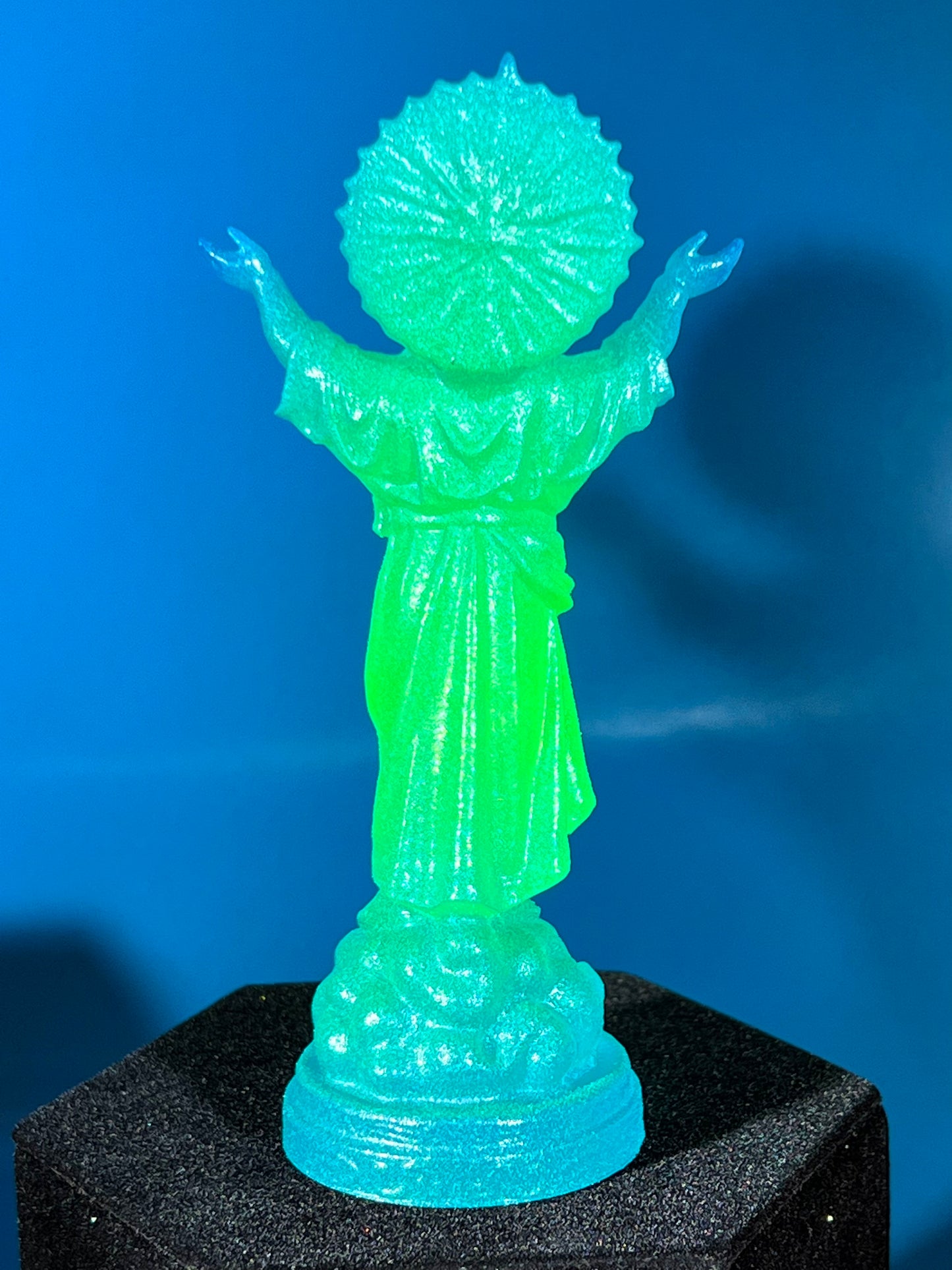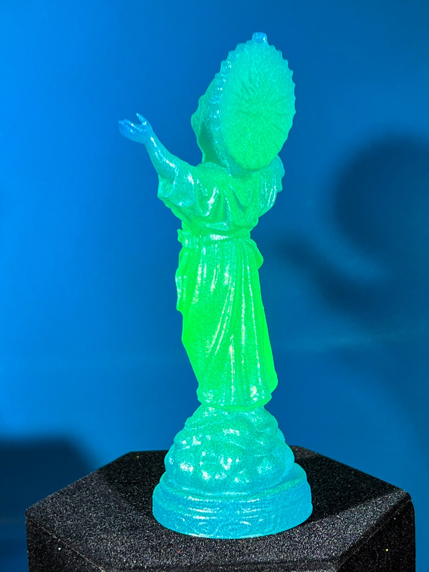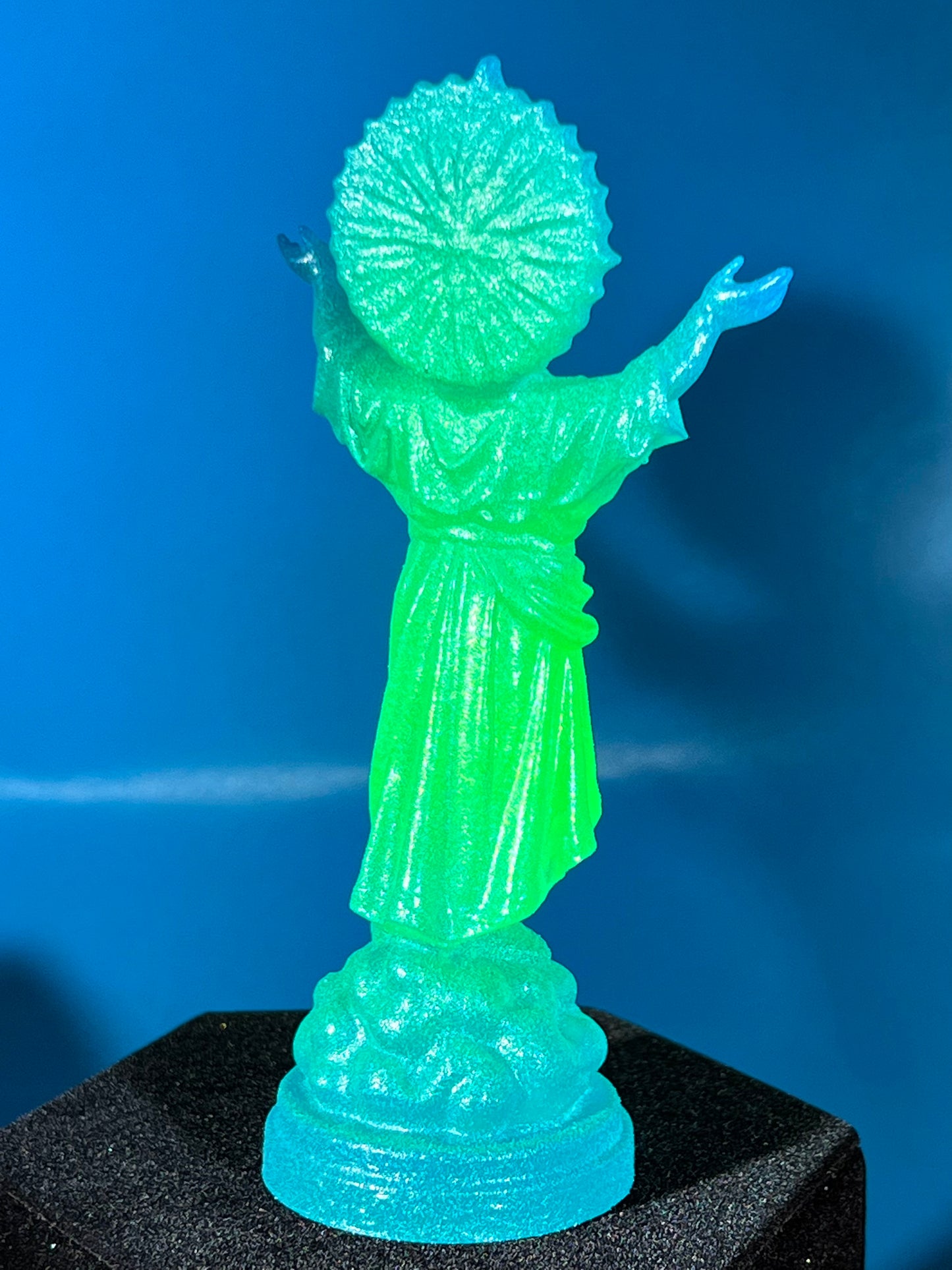 Resin printed, painted green and blue and coated with glow. 5”