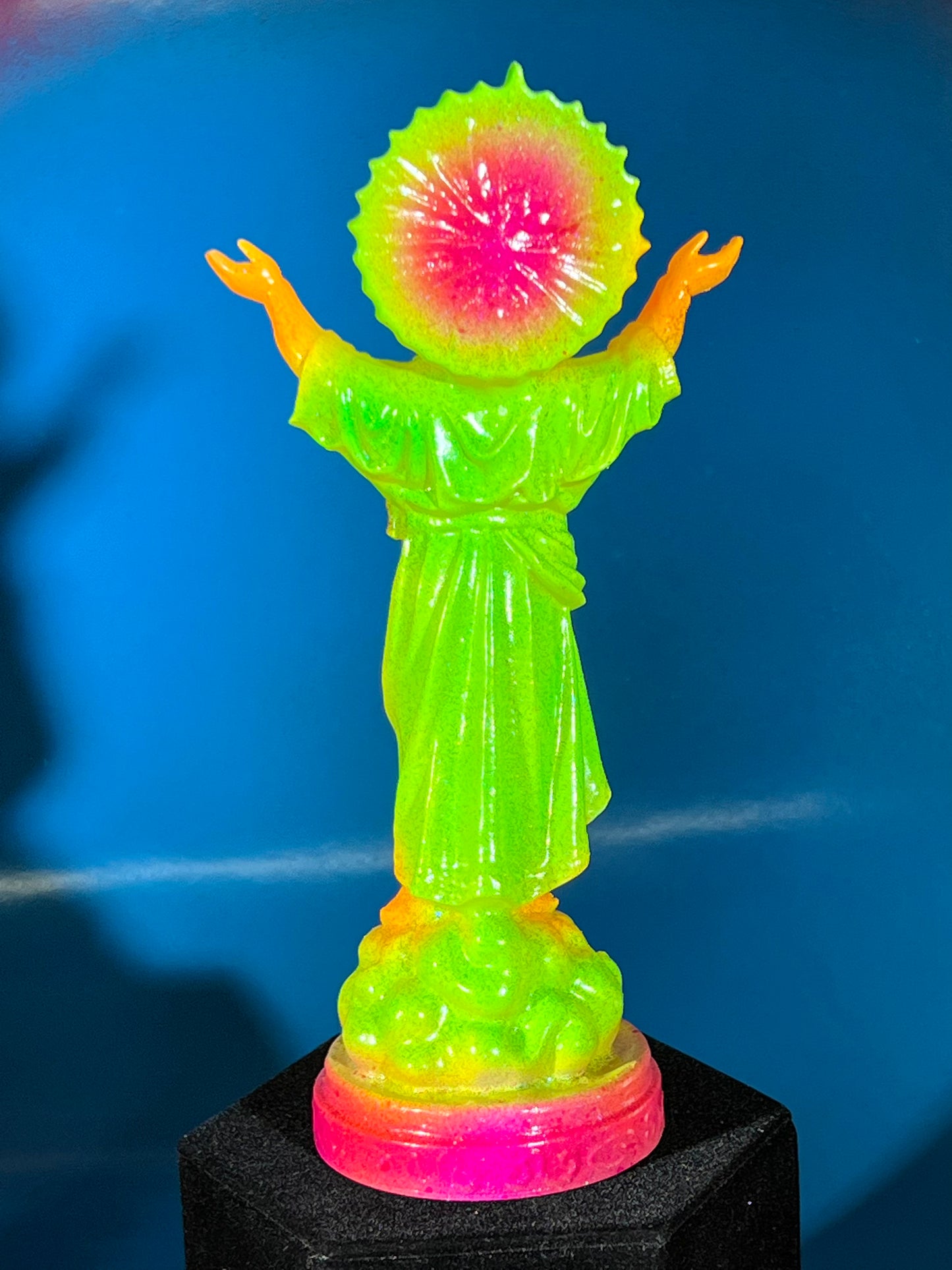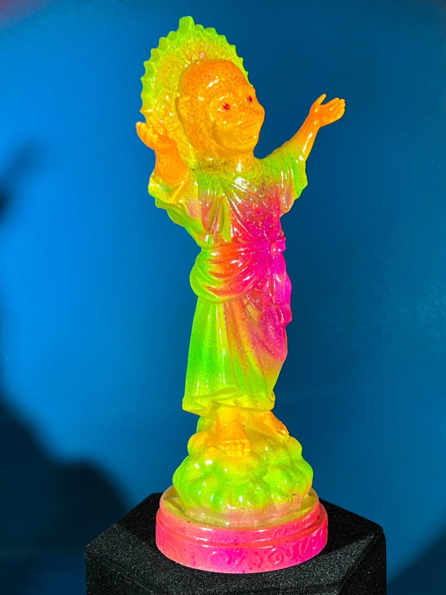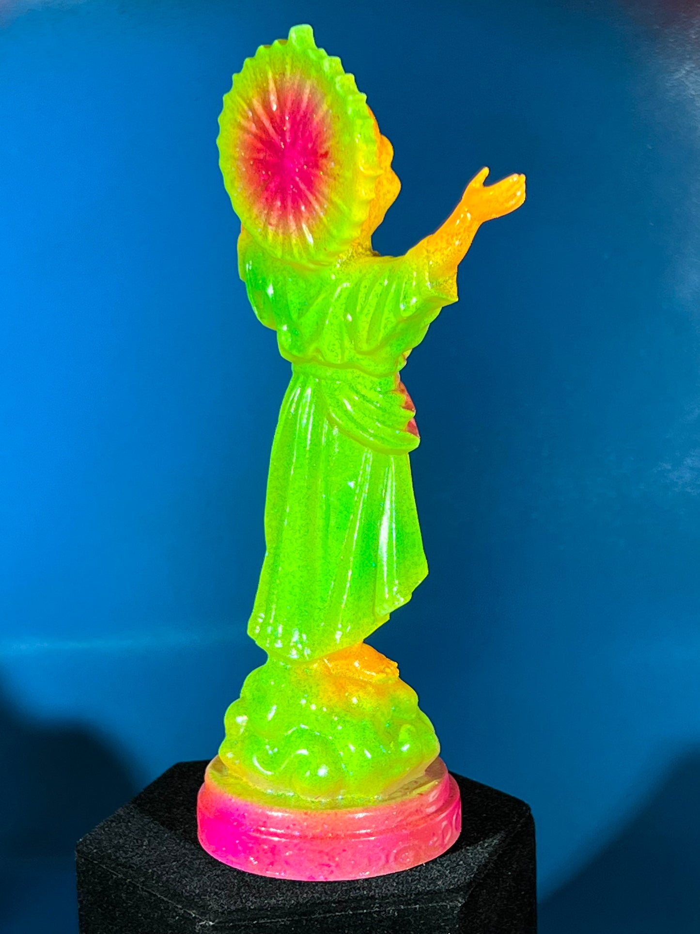 Resin printed, painted in neon colors with blue and black holographic glitter. 7”