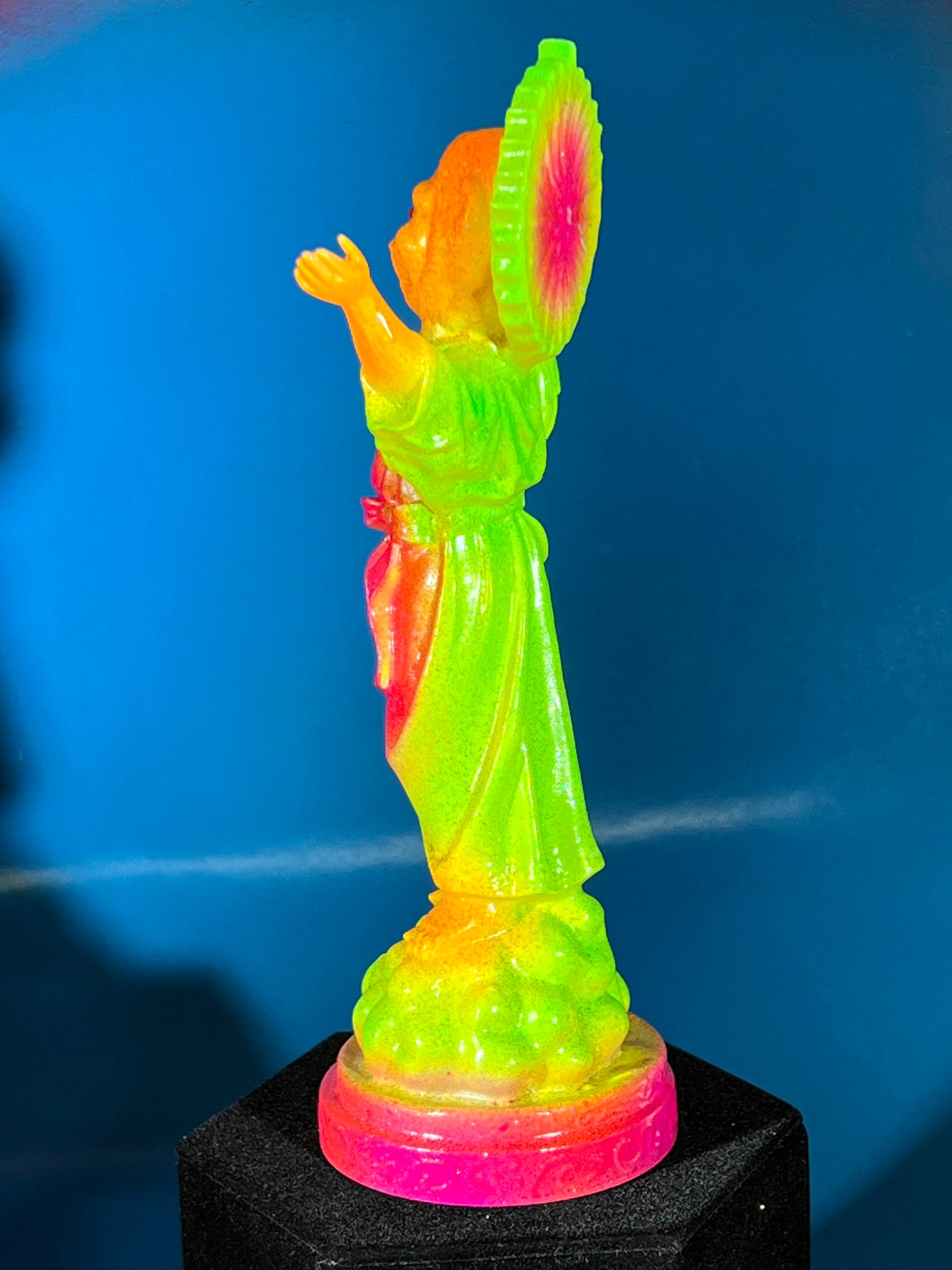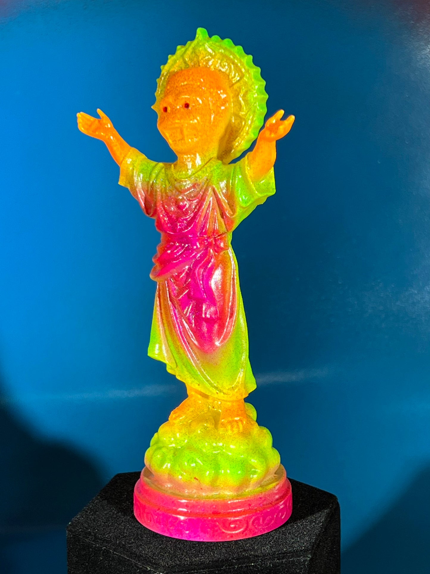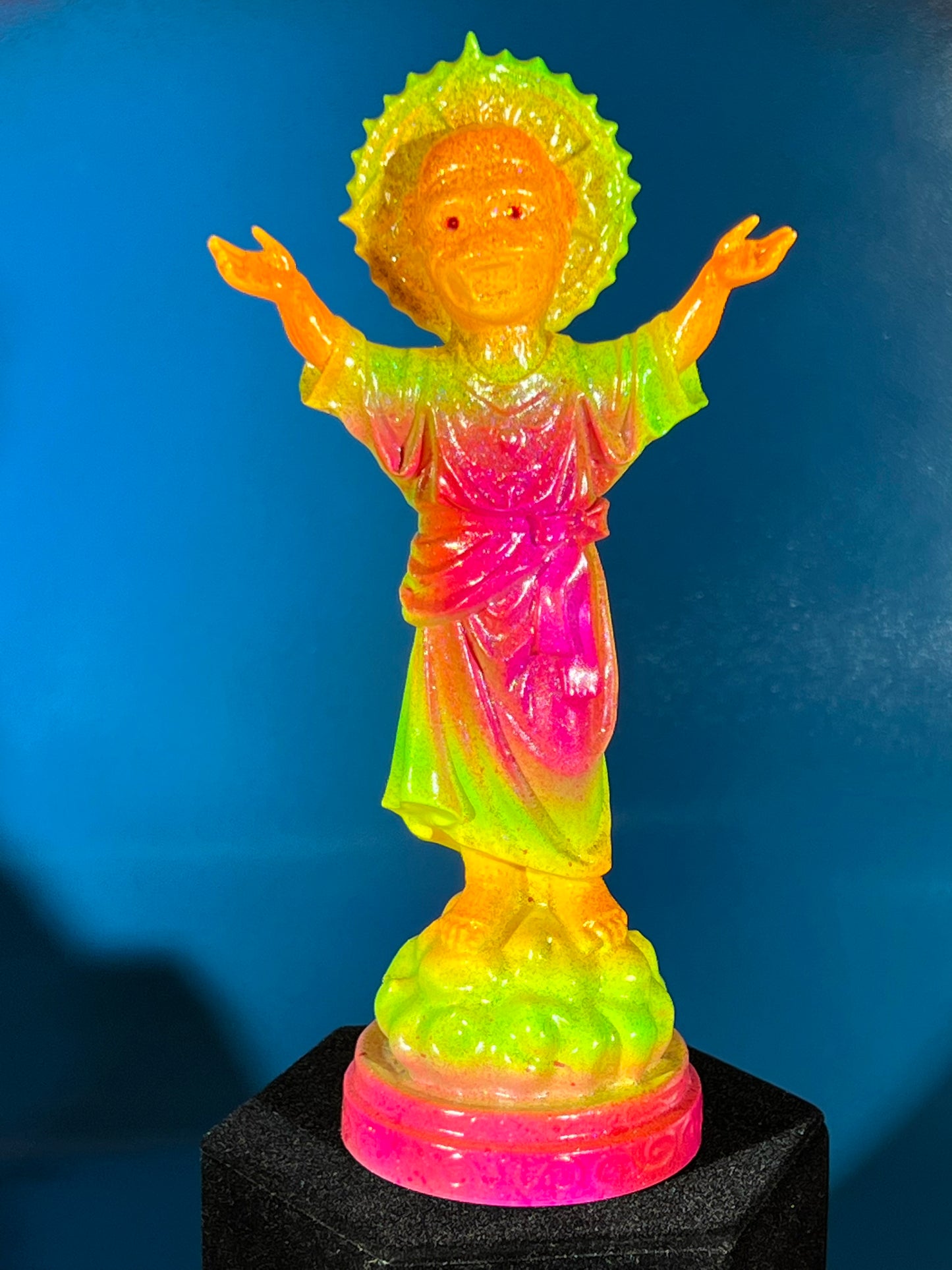 Resin printed, painted in neon colors with blue and black holographic glitter. 7”