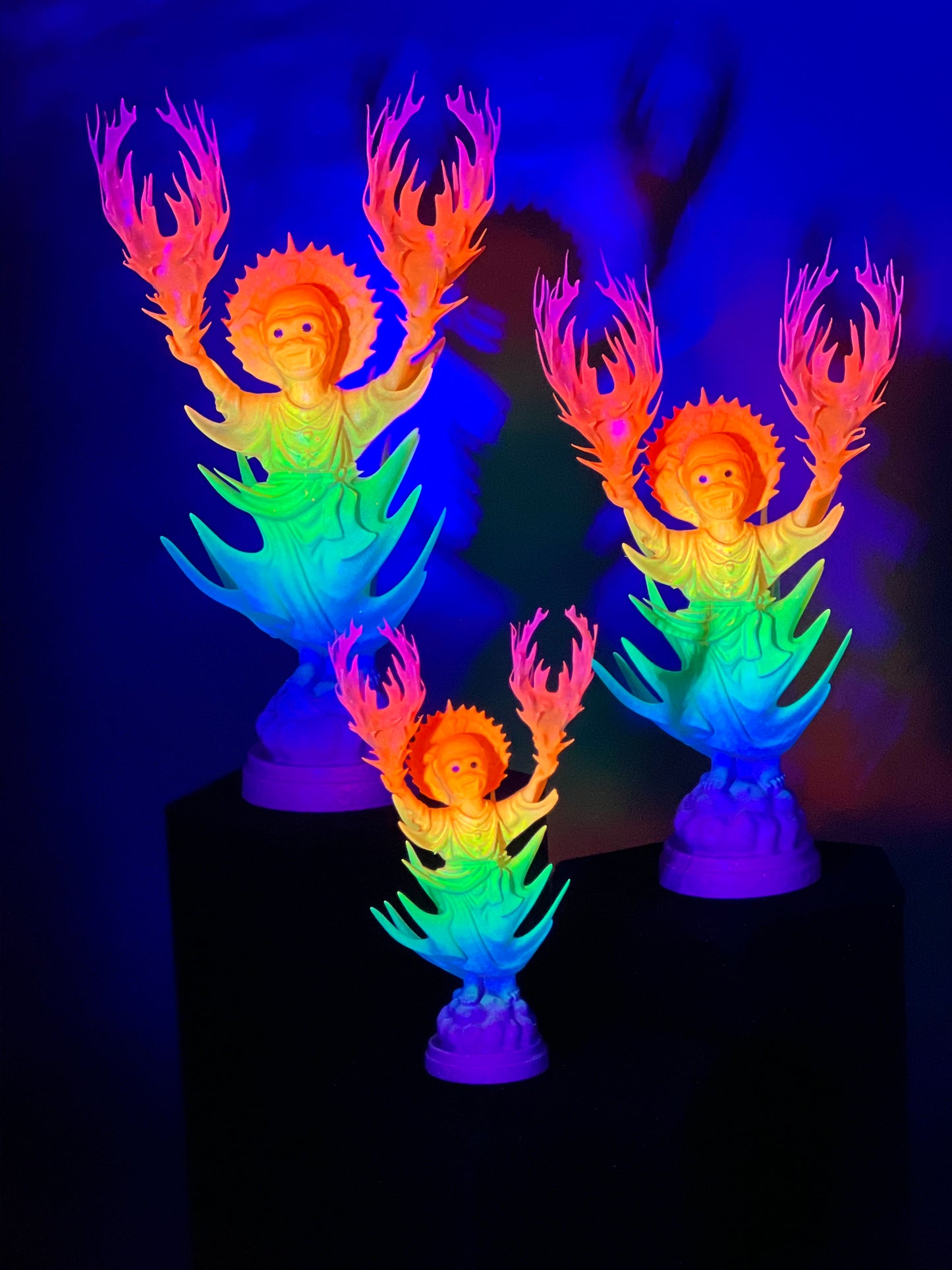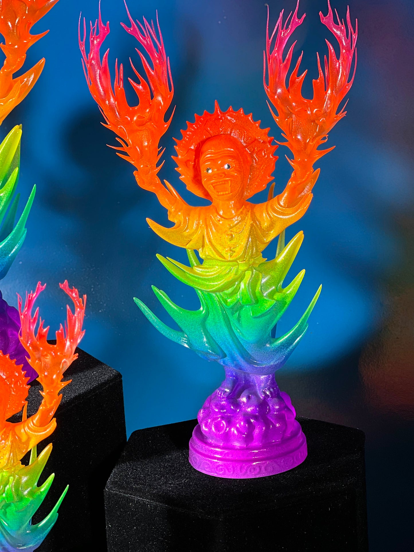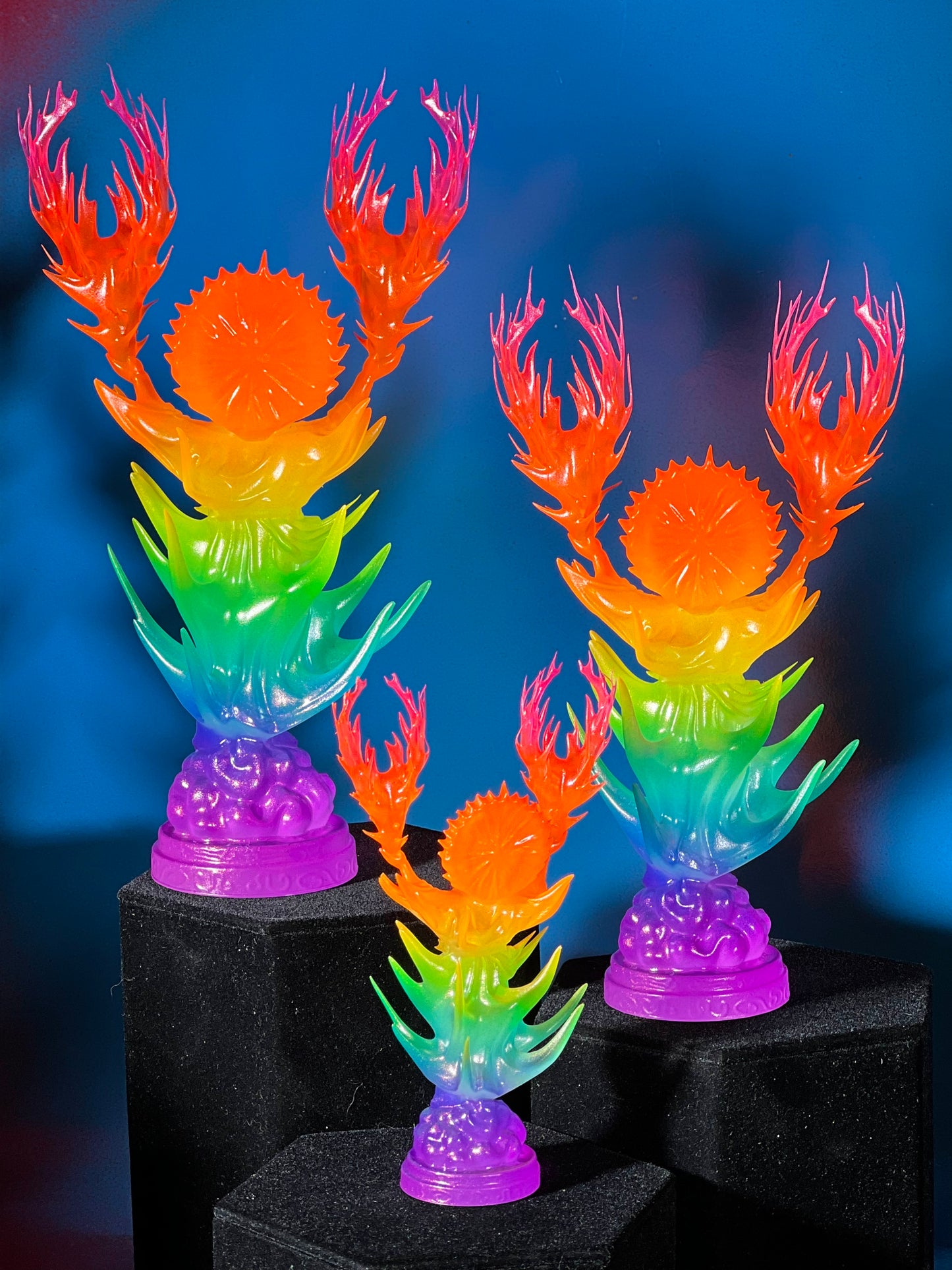 Resin printed, painted in transparent and opaque neon rainbow. UV reactive.