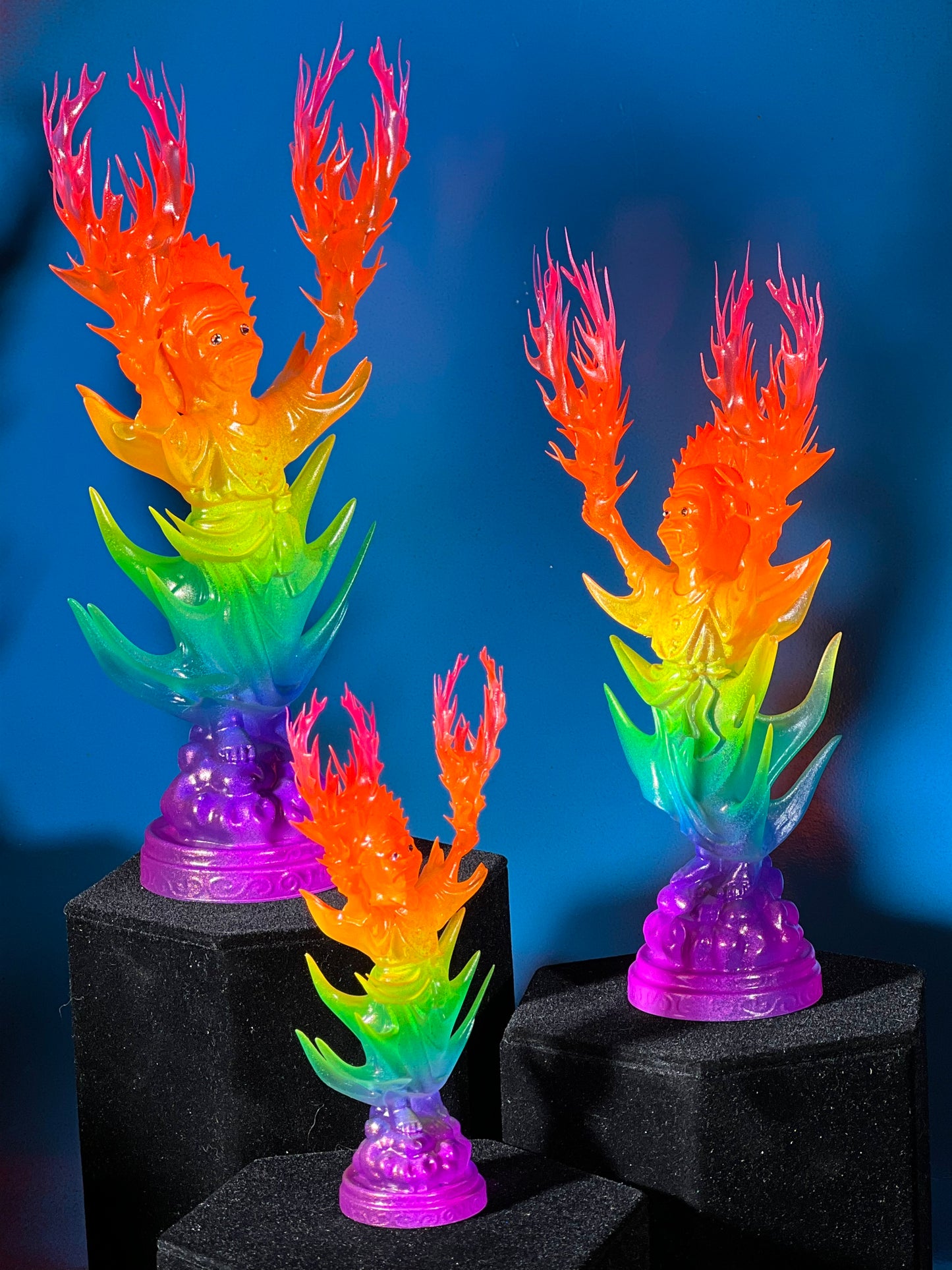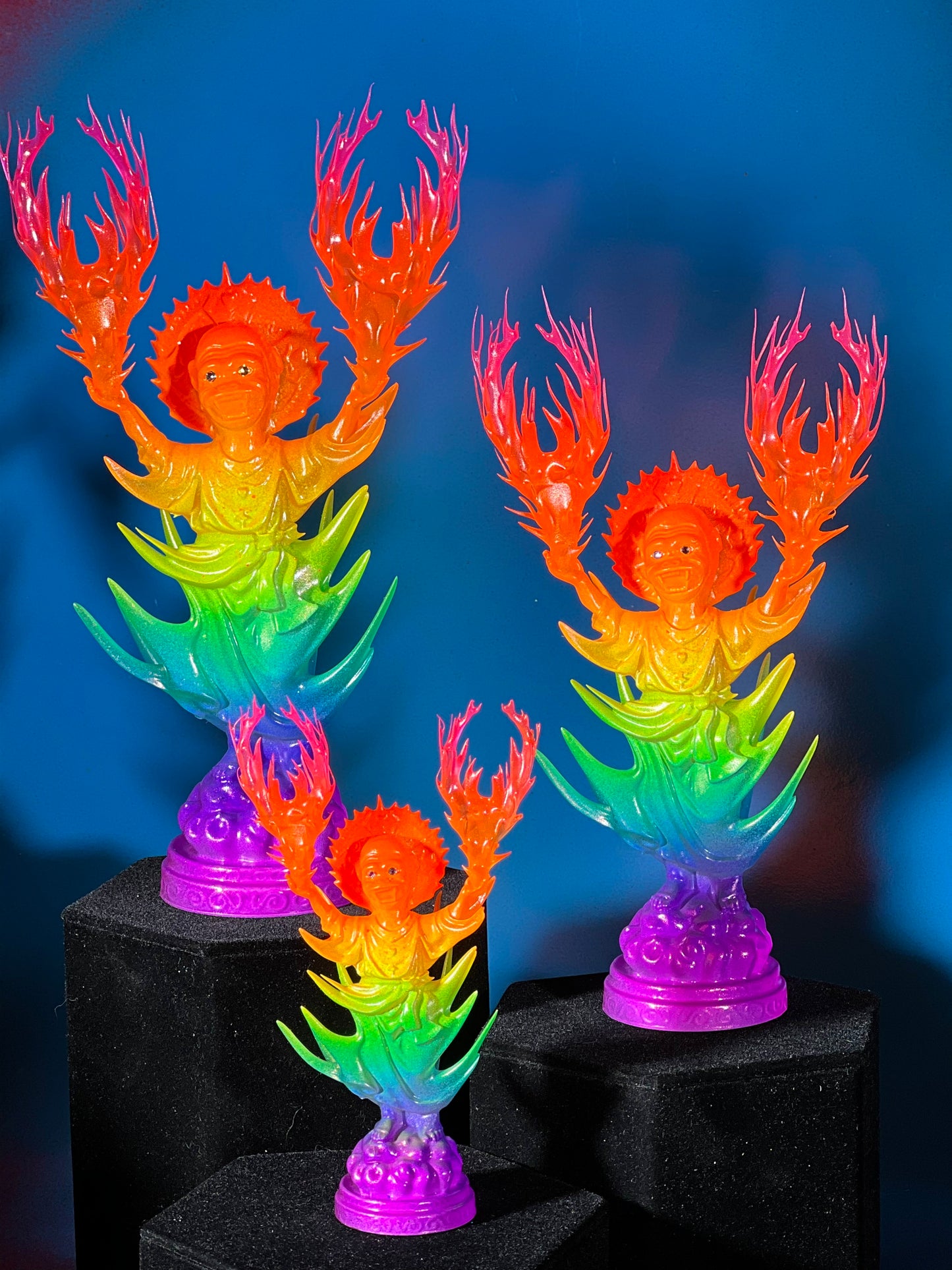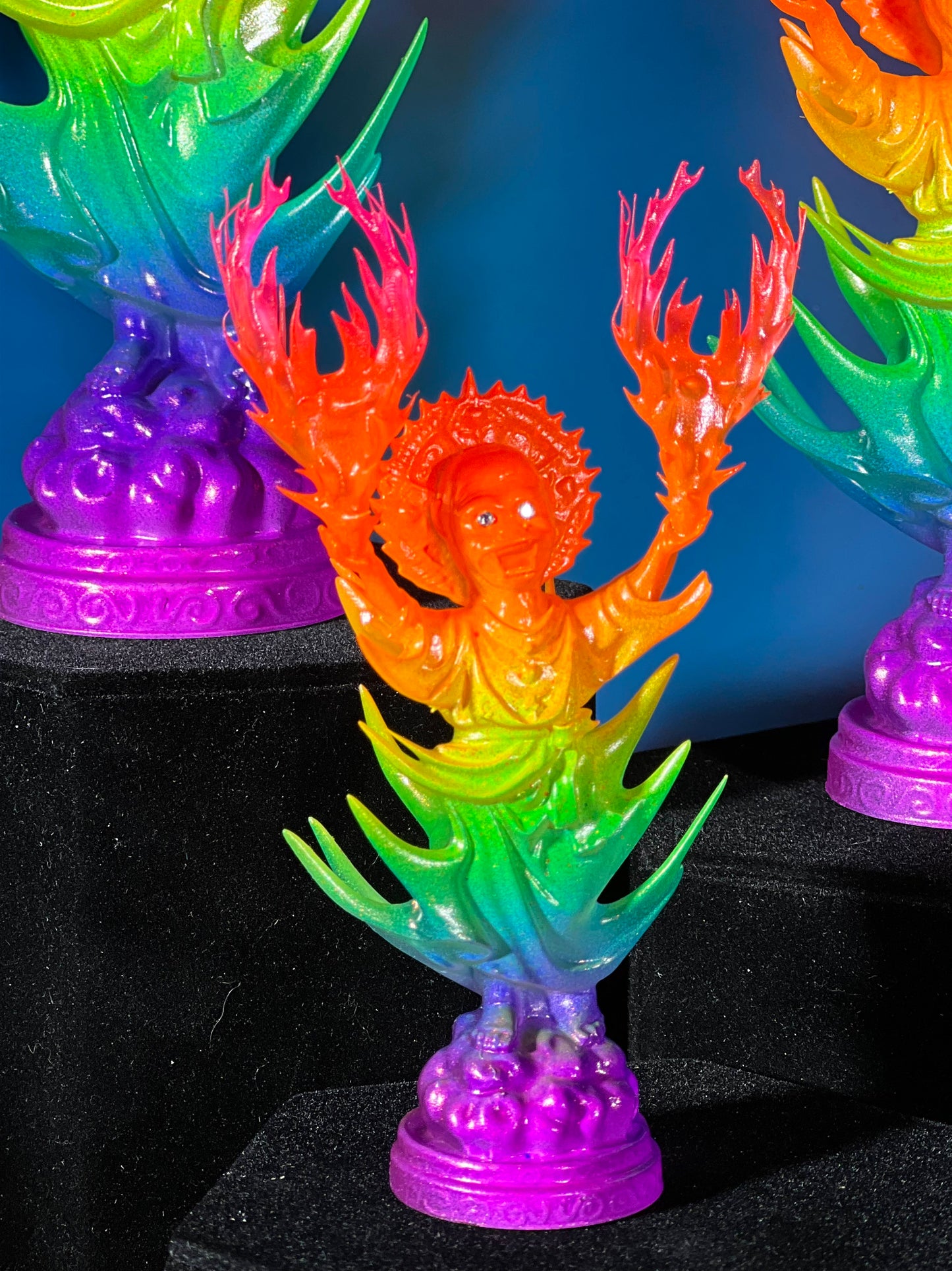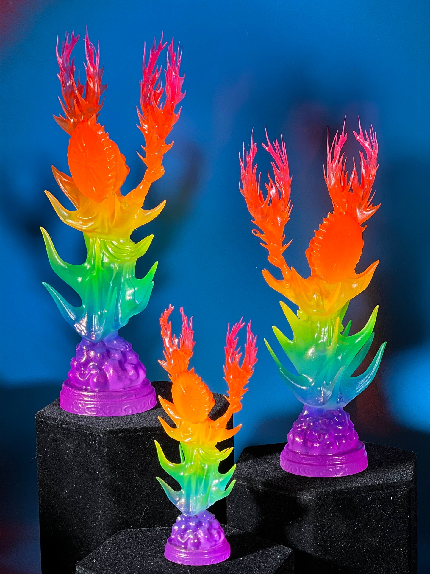 Resin printed, painted in transparent and opaque neon rainbow. UV reactive.