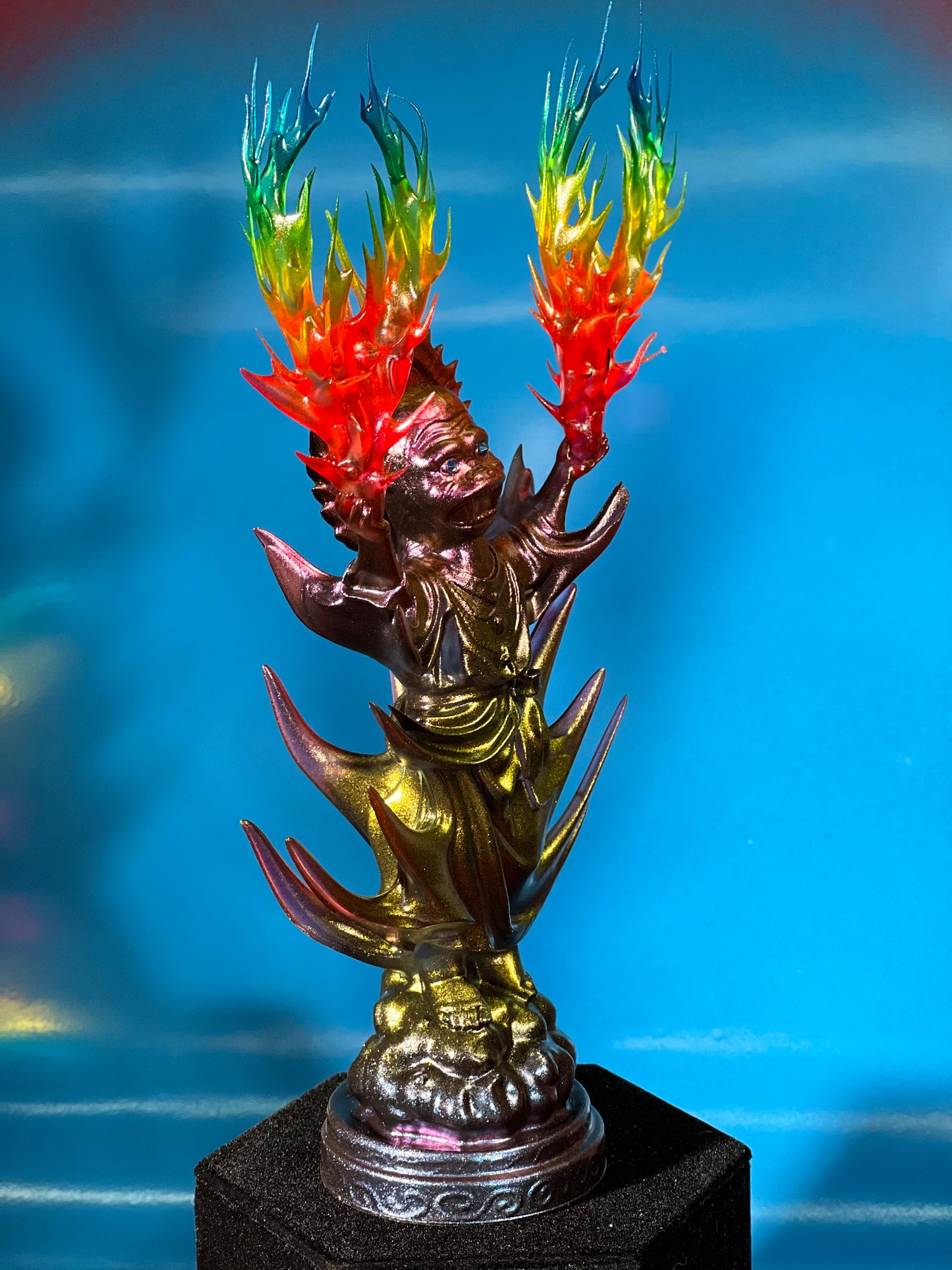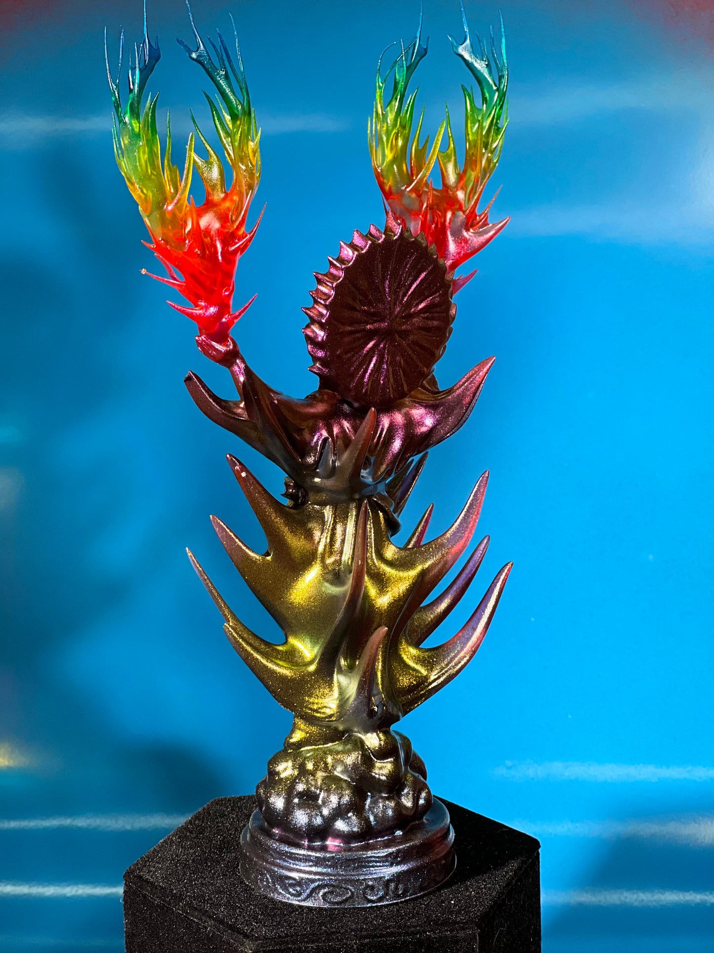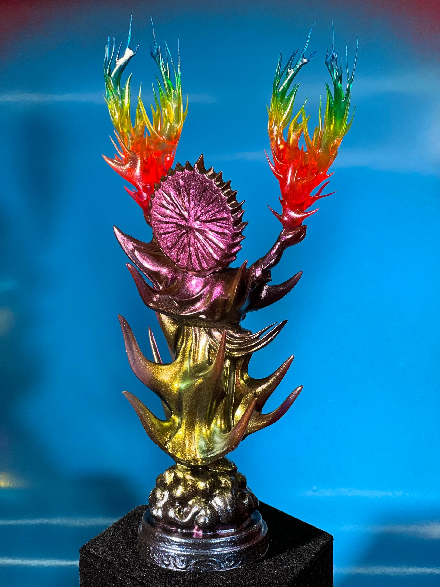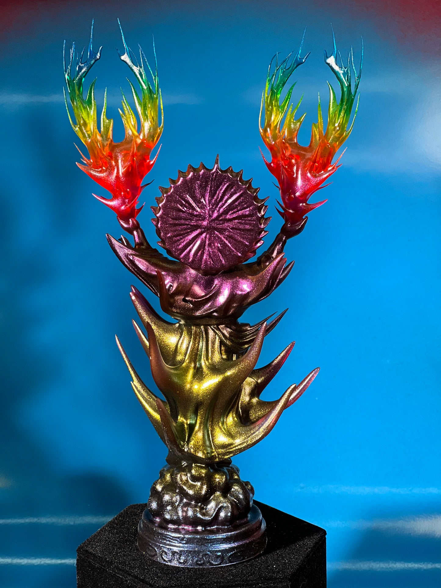 Resin printed, painted in transparent and color shifting glitter colors. 8 1/4”