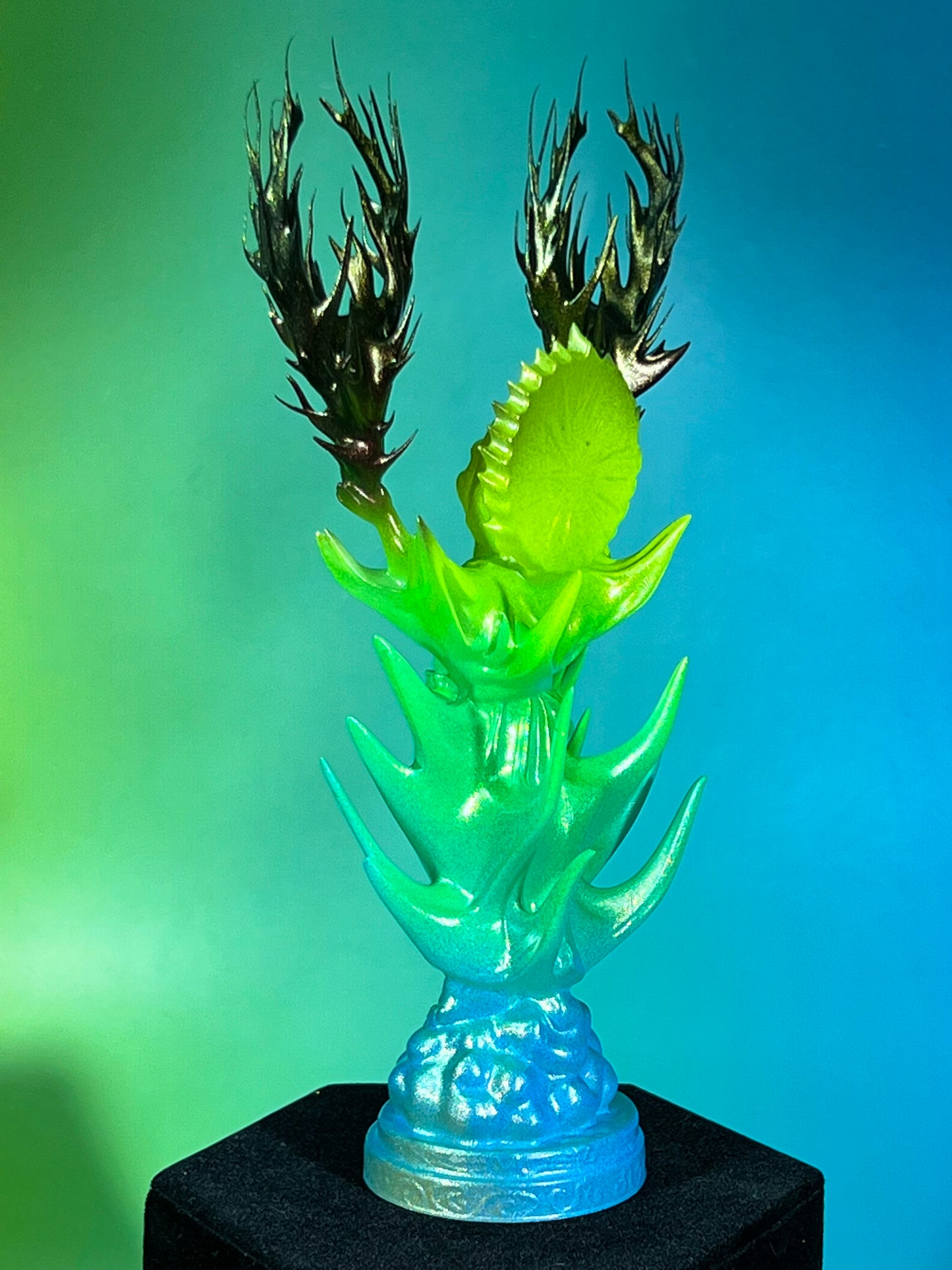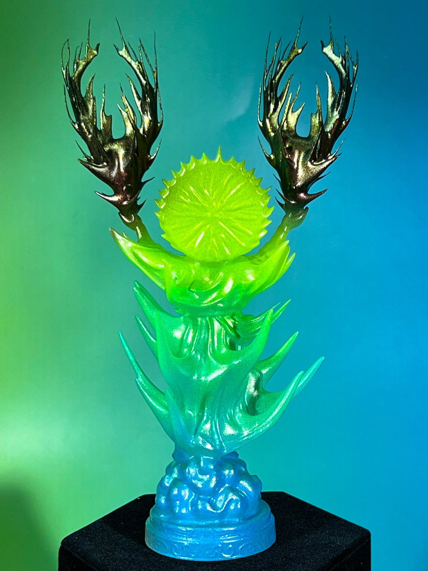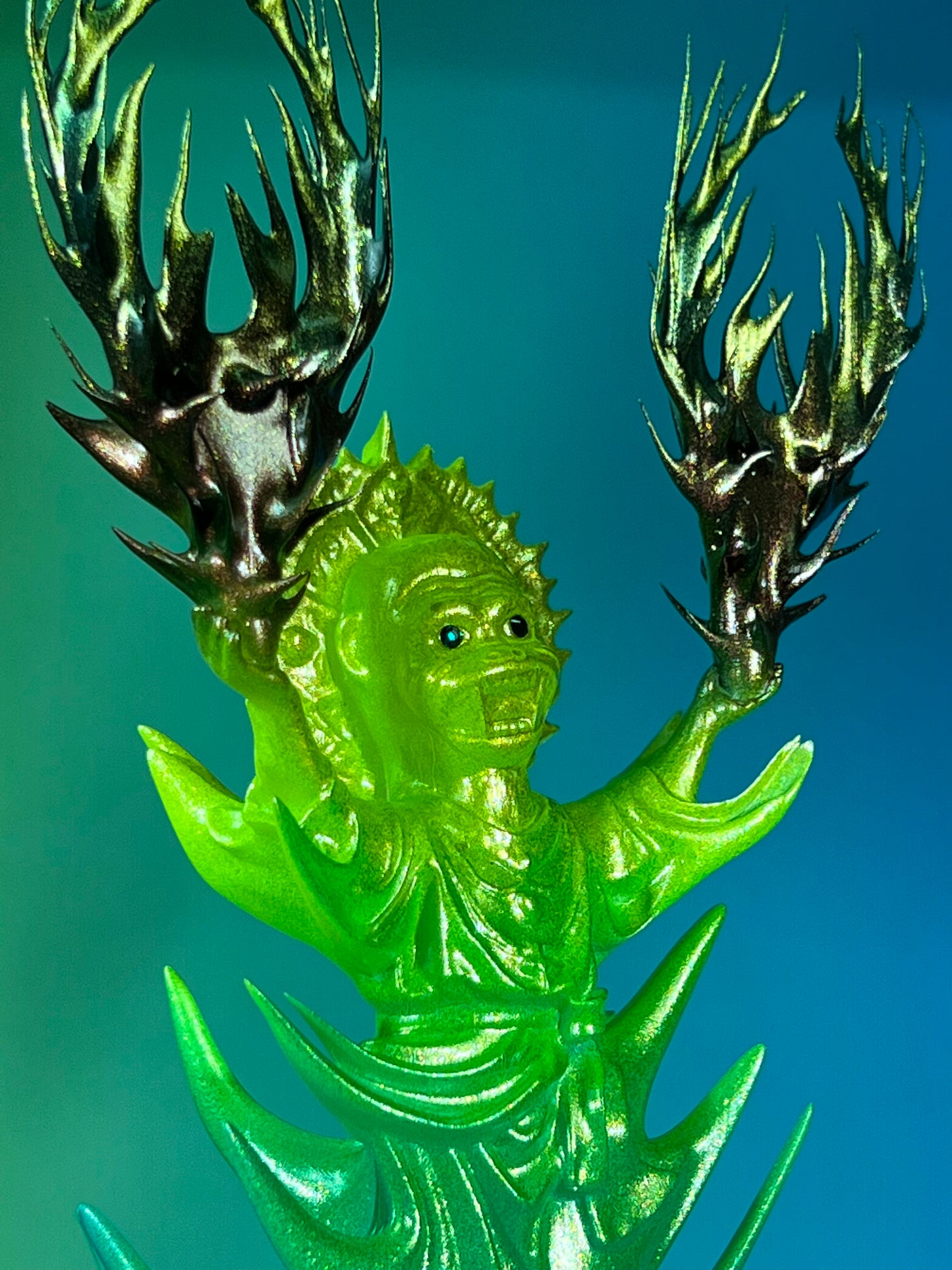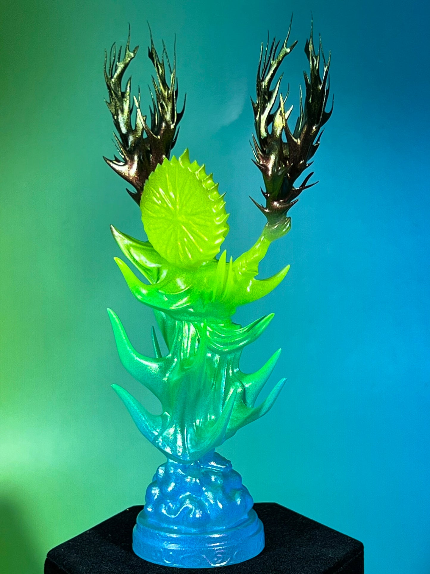 Resin printed, painted in color shifting and UV reactive neon colors. 7”