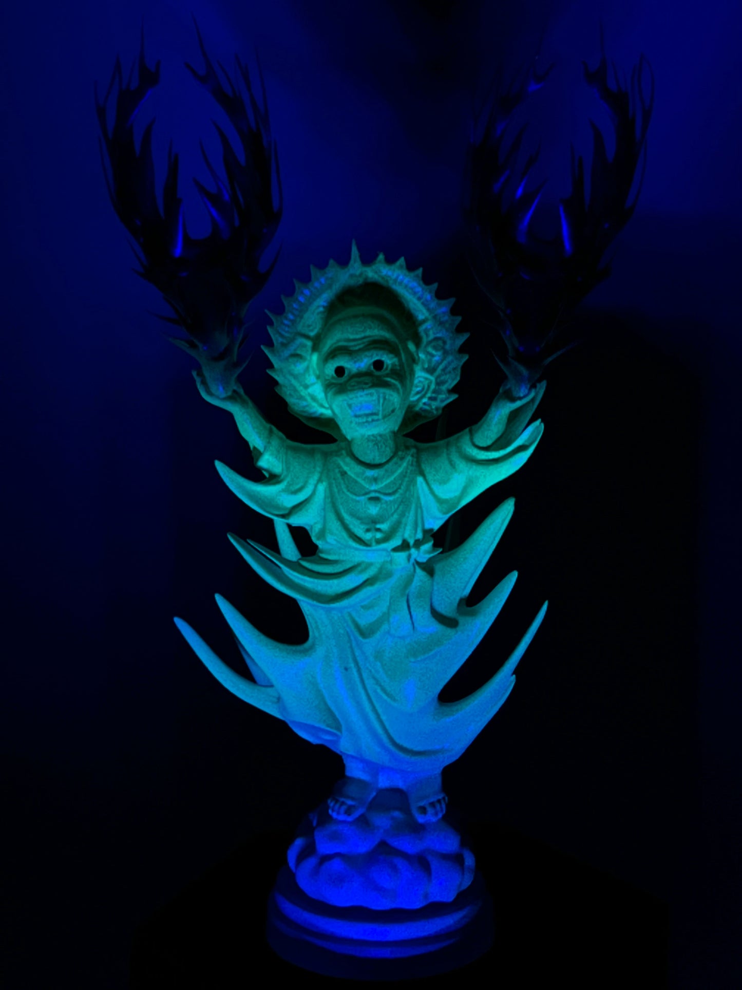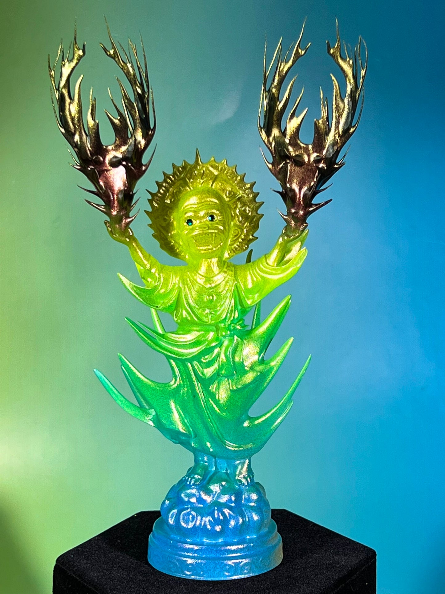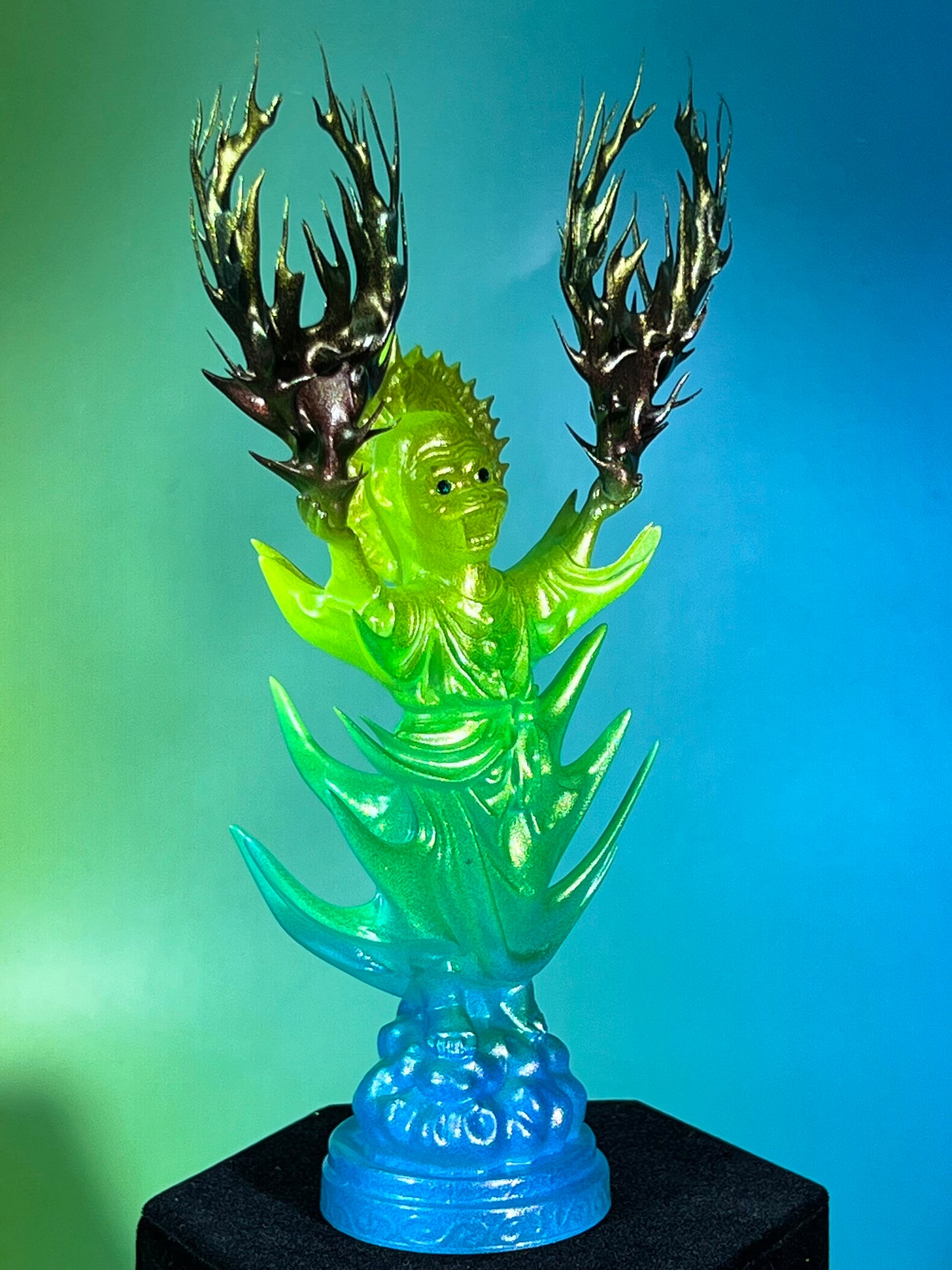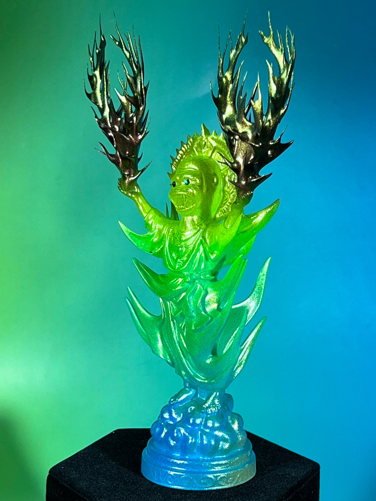 Resin printed, painted in color shifting and UV reactive neon colors. 7”