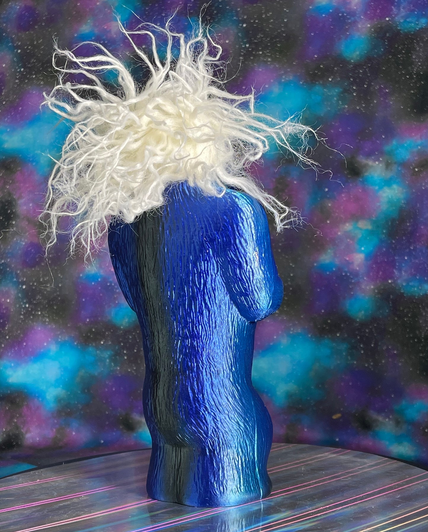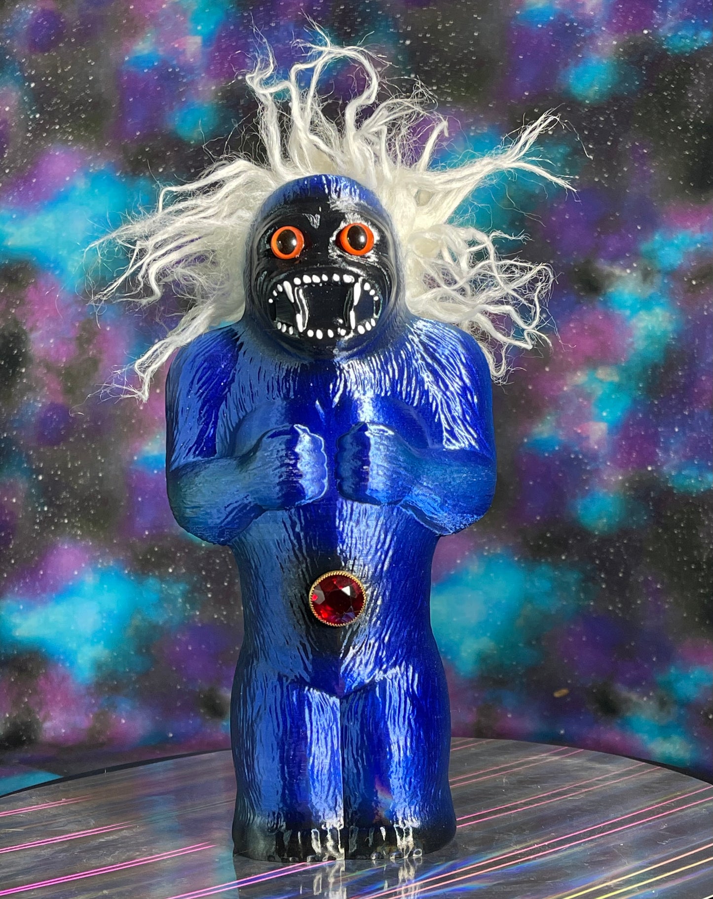 Ape printed in shiny blue, painted in pearlescent teal and black. White hair. About 11”