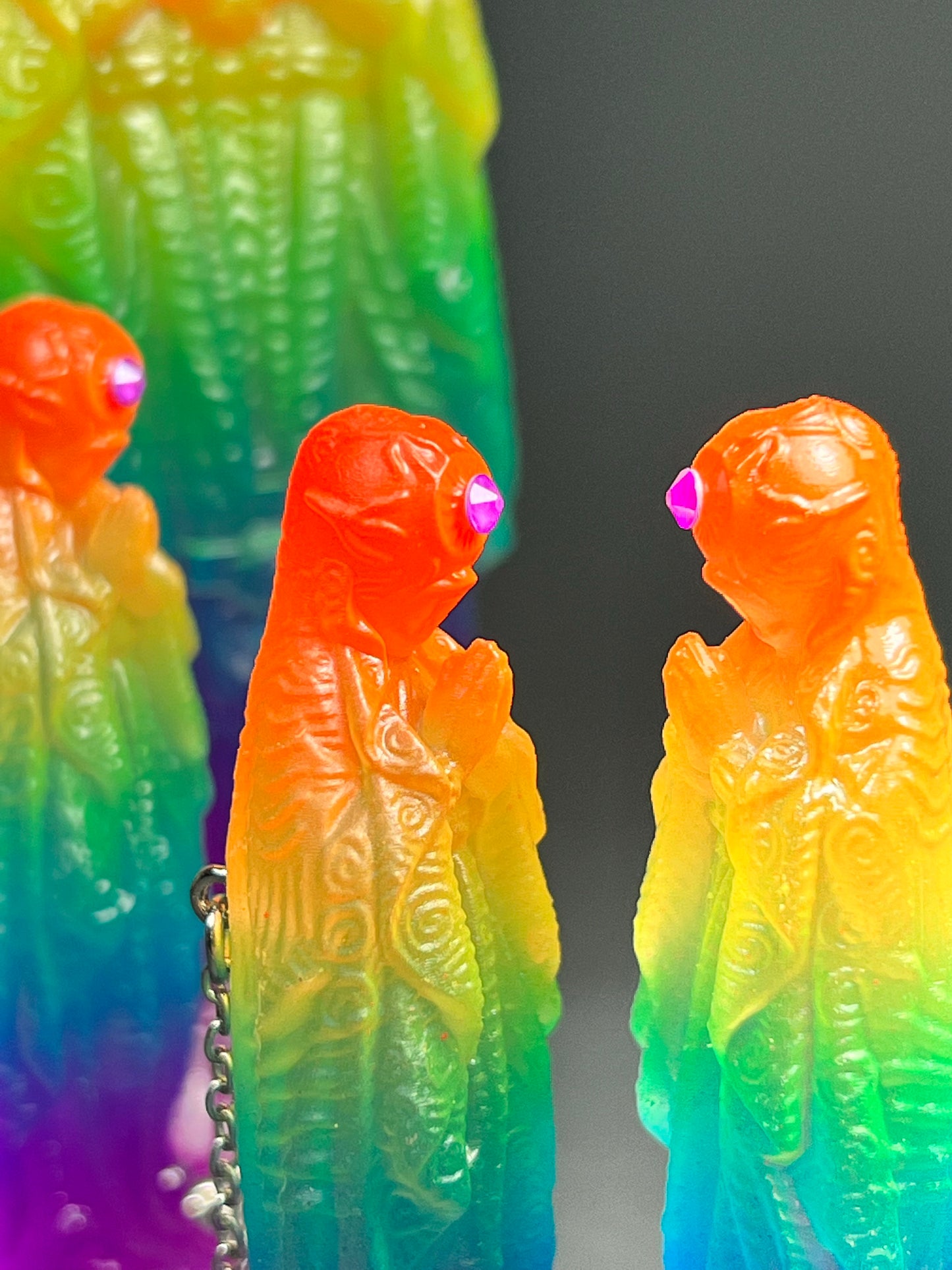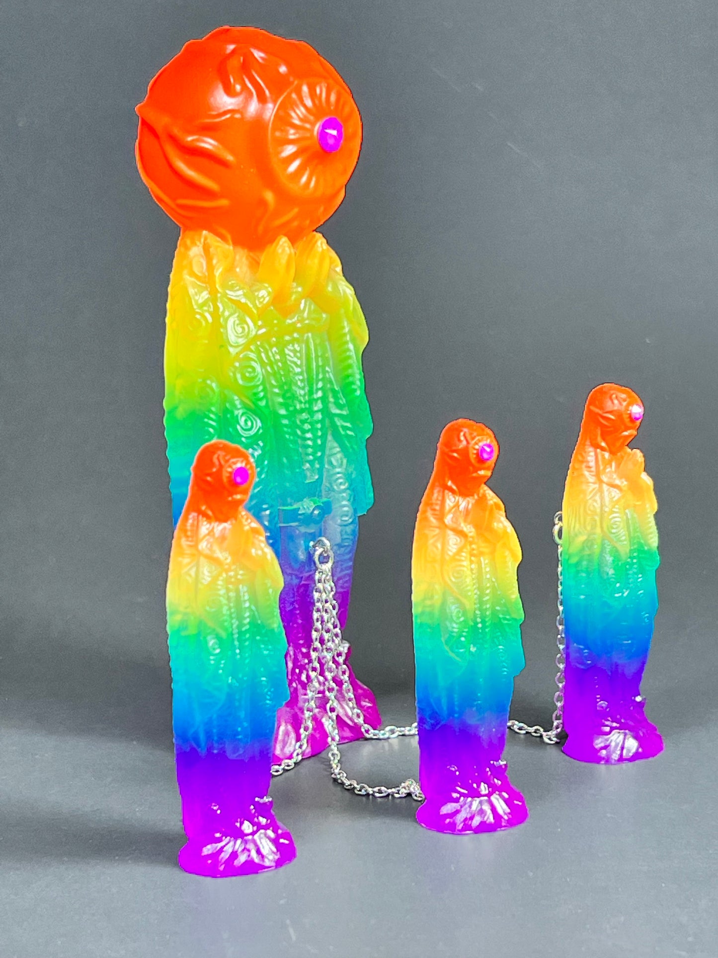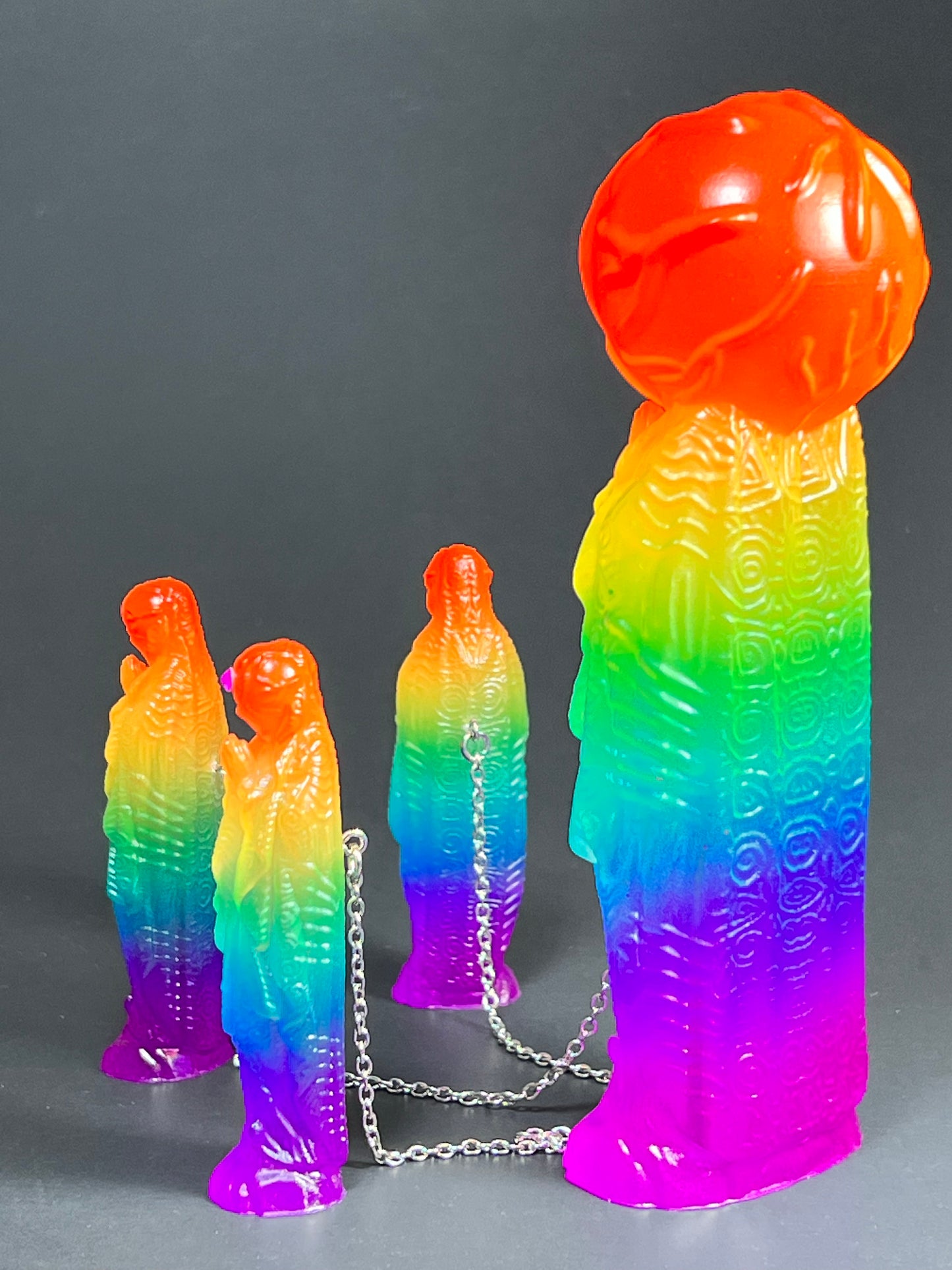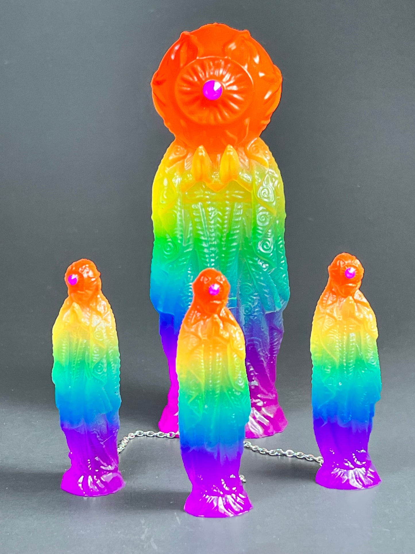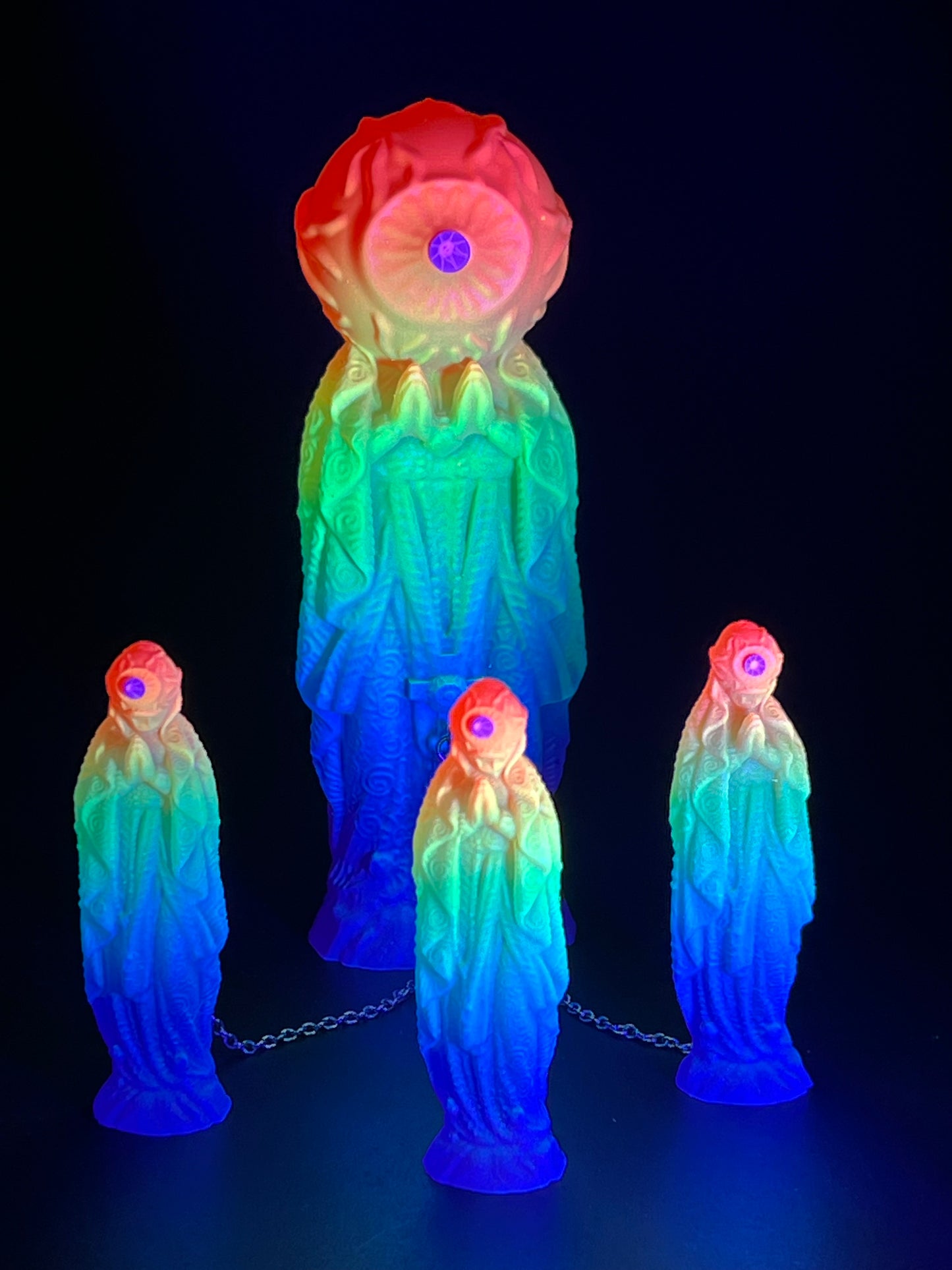 Neon Gods of the bitter night in space. Resin printed and painted fluorescent rainbow, semi-transparent colors. 6” and 3” x3, UV reactive