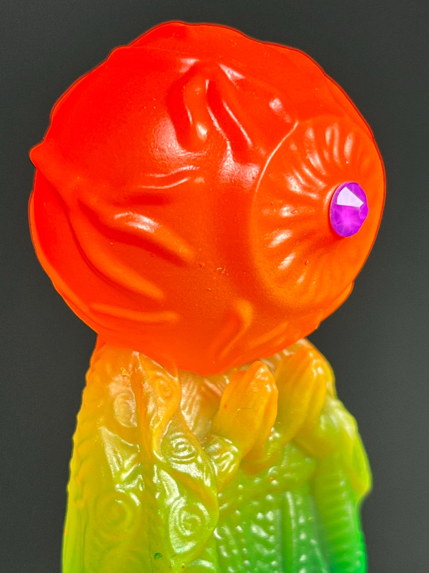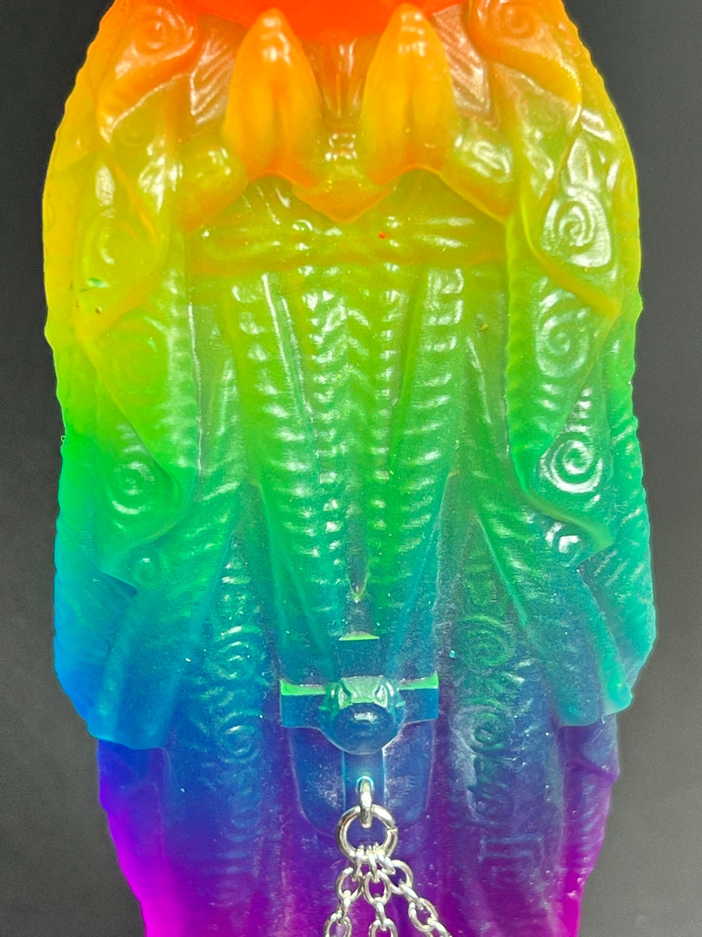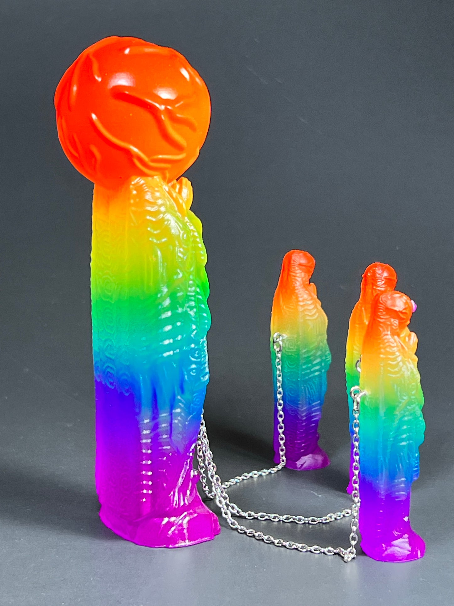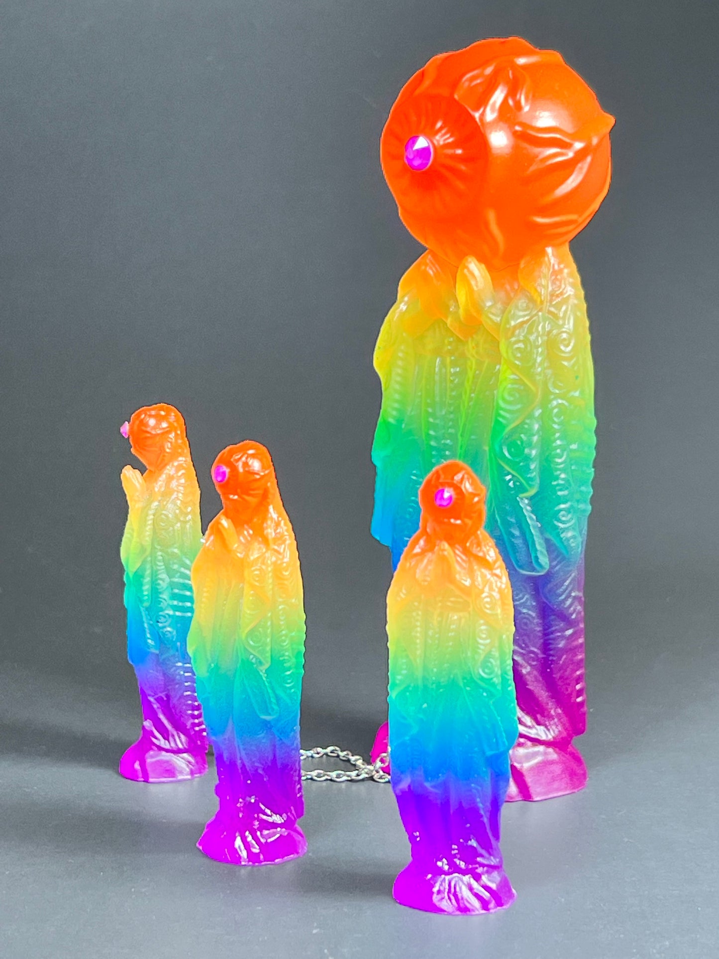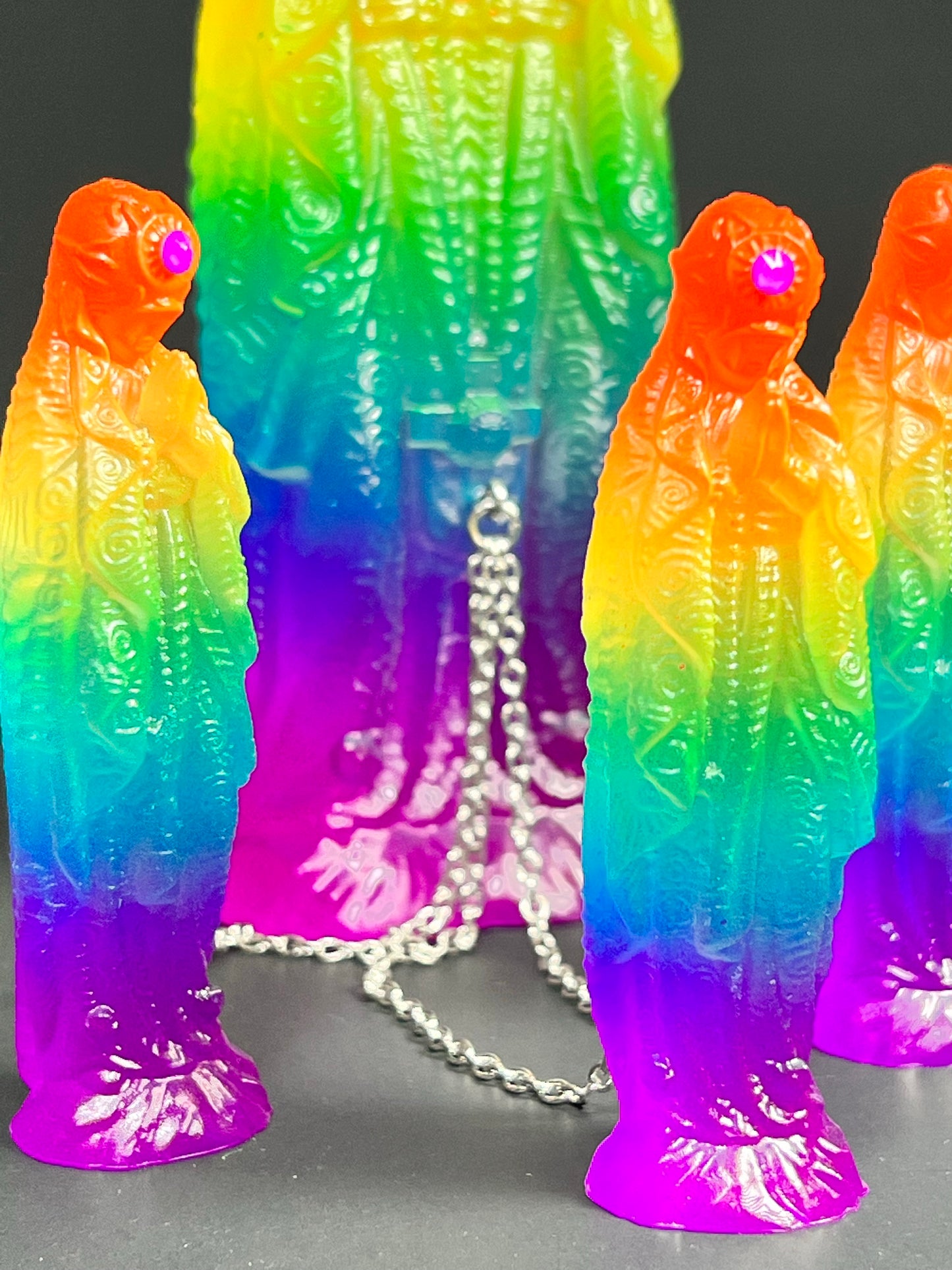 Neon Gods of the bitter night in space. Resin printed and painted fluorescent rainbow, semi-transparent colors. 6” and 3” x3, UV reactive