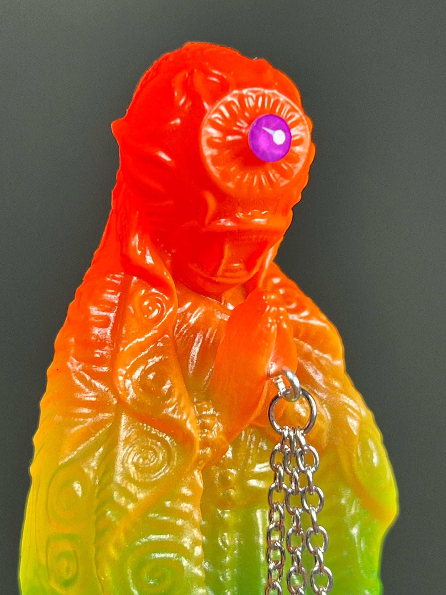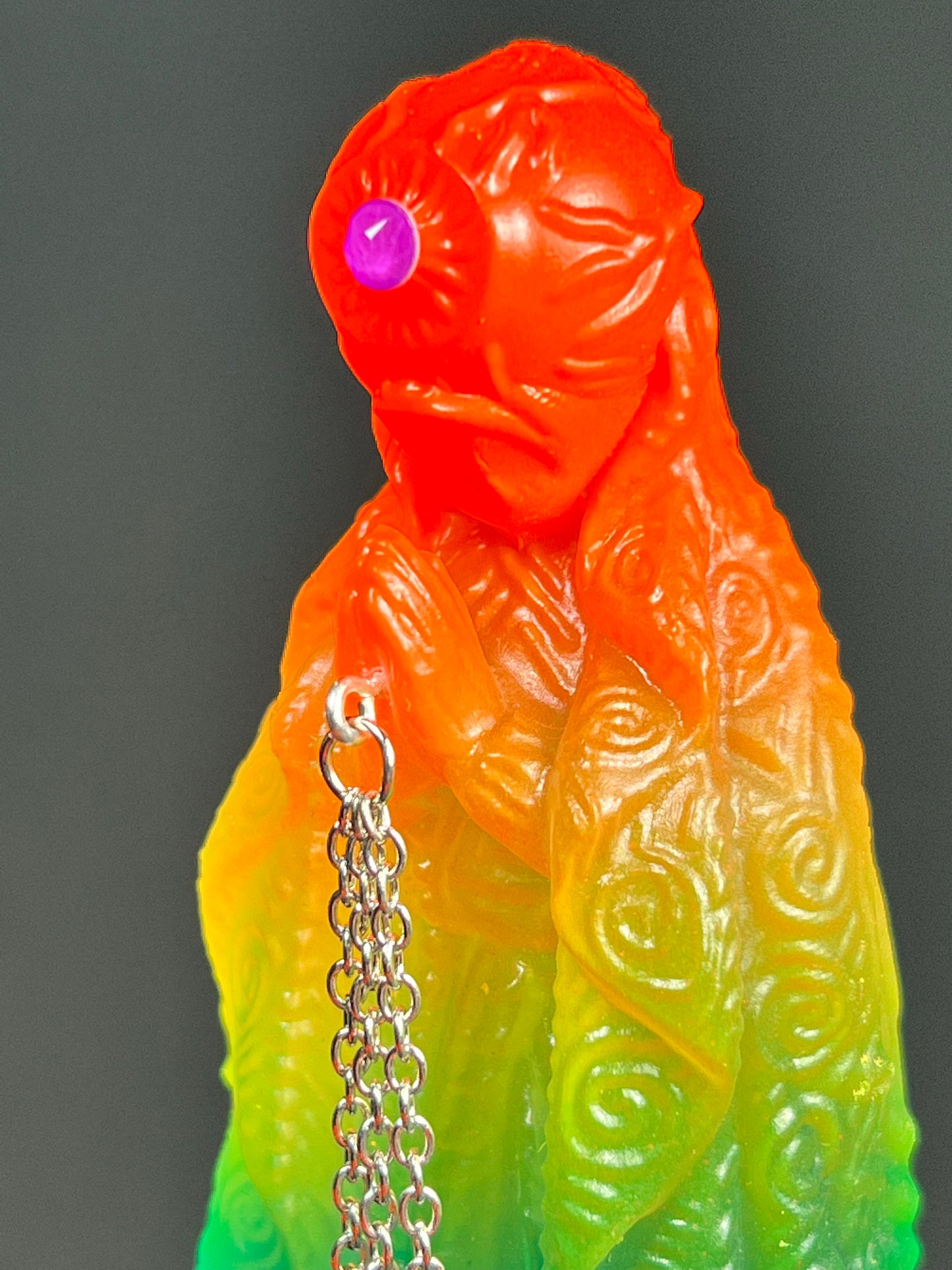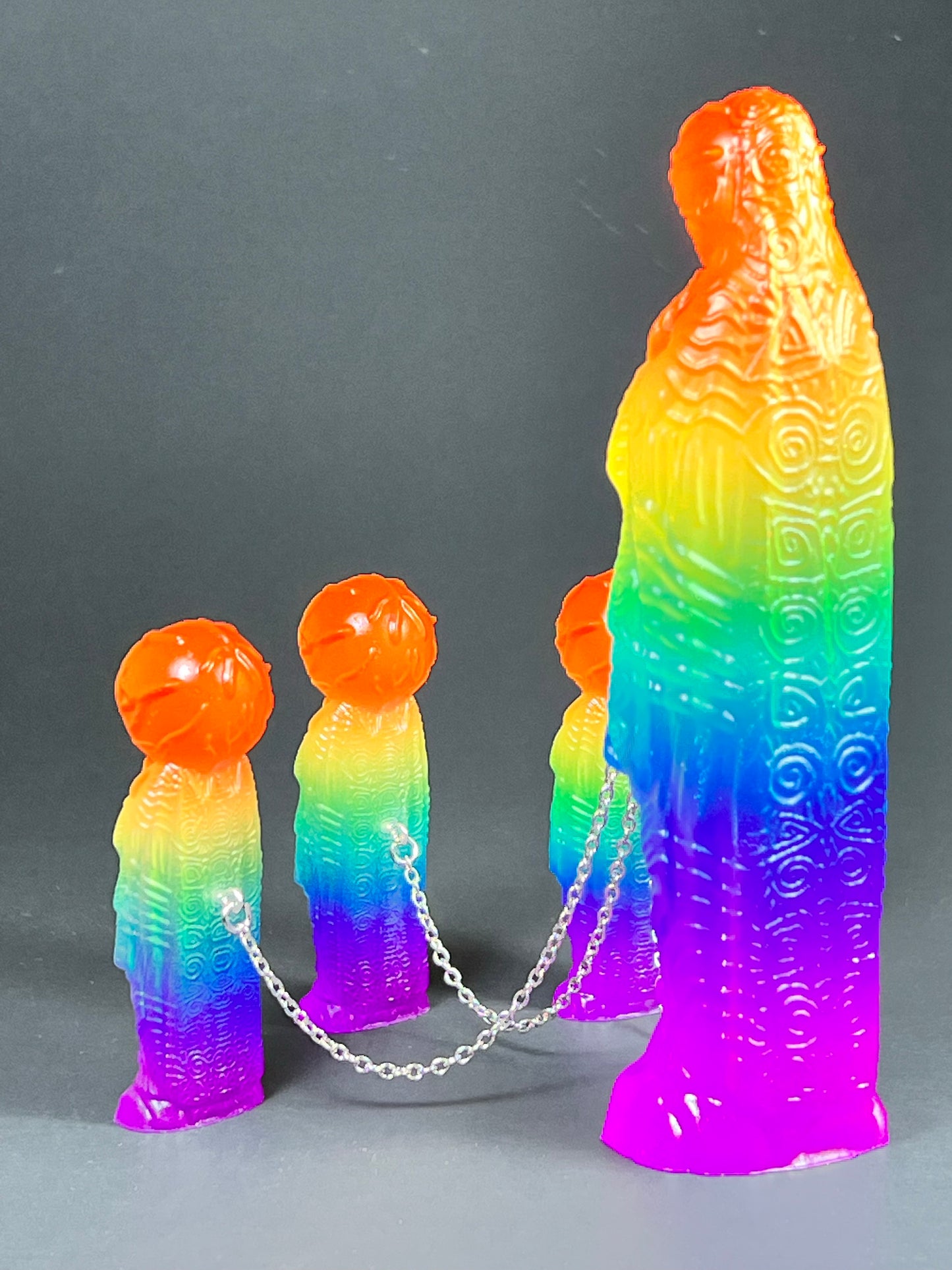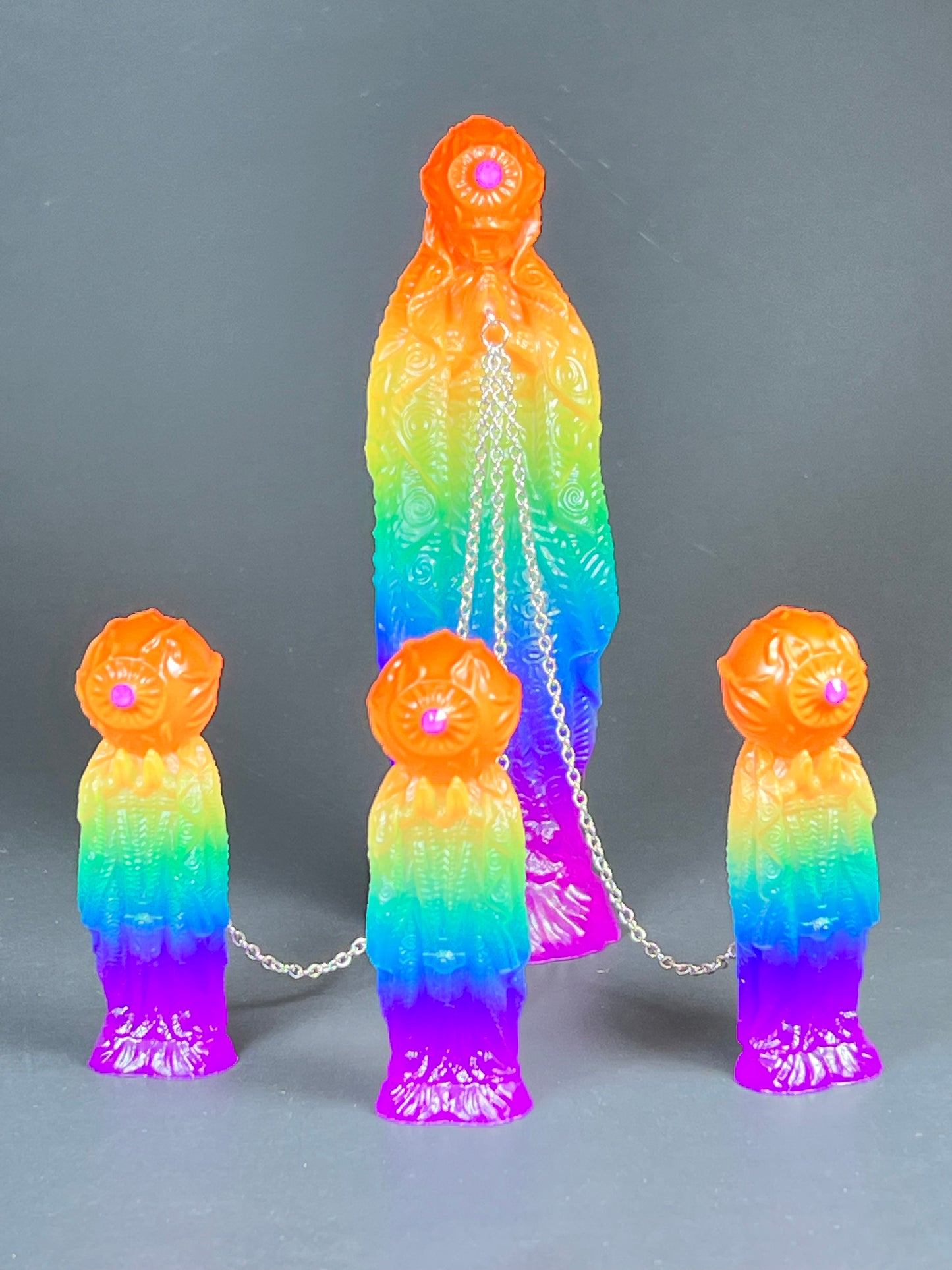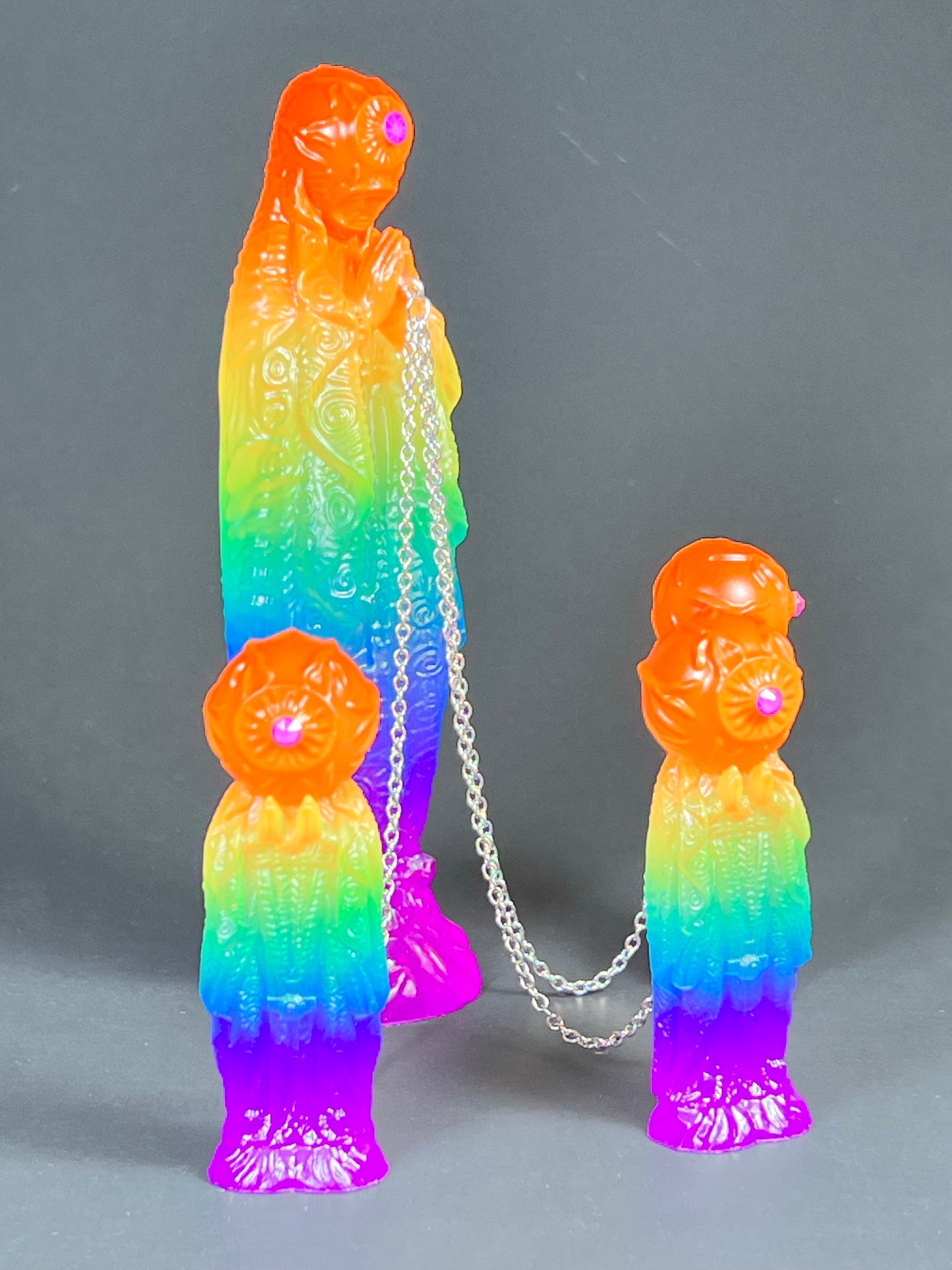 Neon Gods of the bitter night in space. Resin printed and painted fluorescent rainbow, semi-transparent colors. 6” and 3” x3, UV reactive
