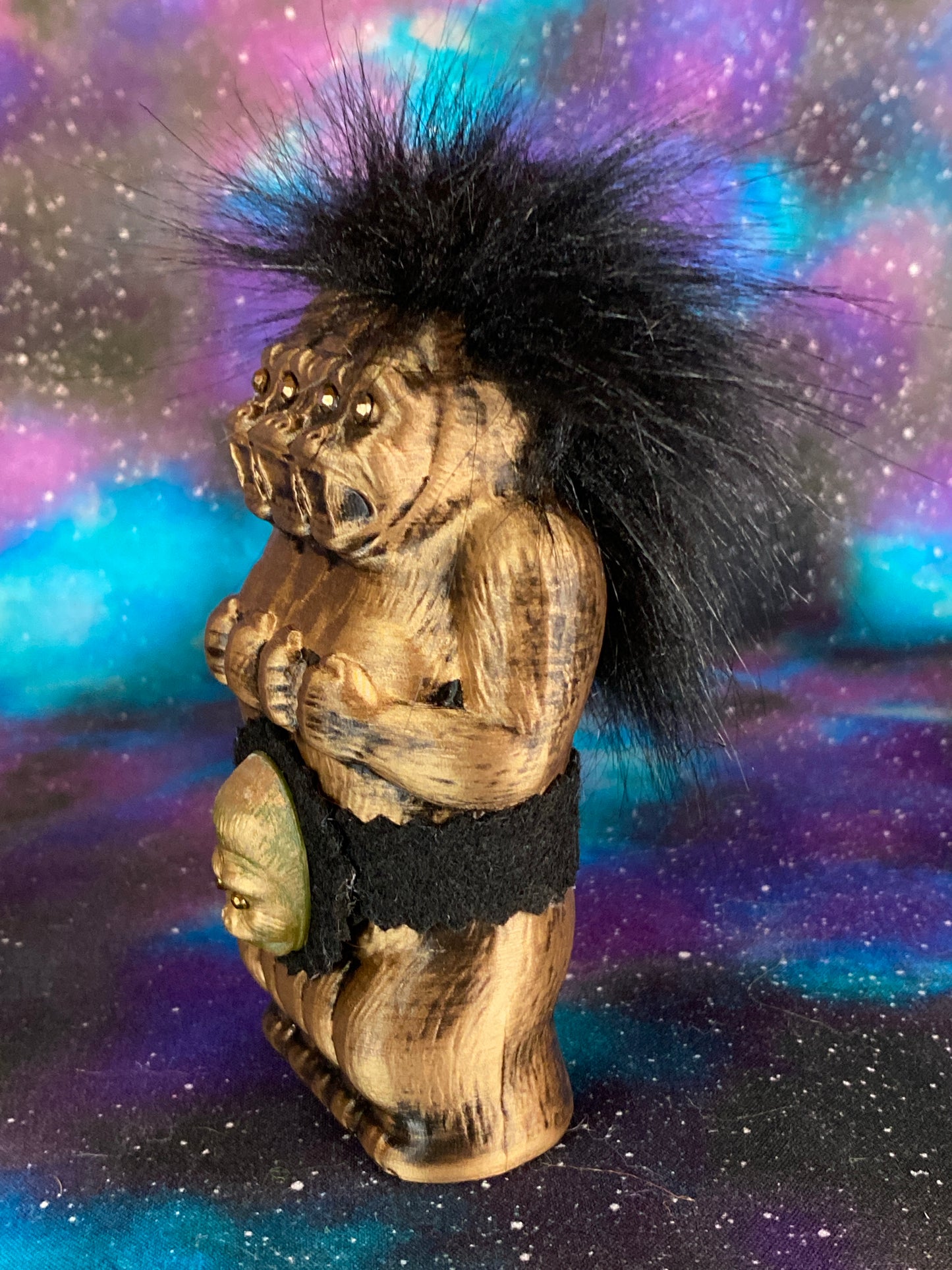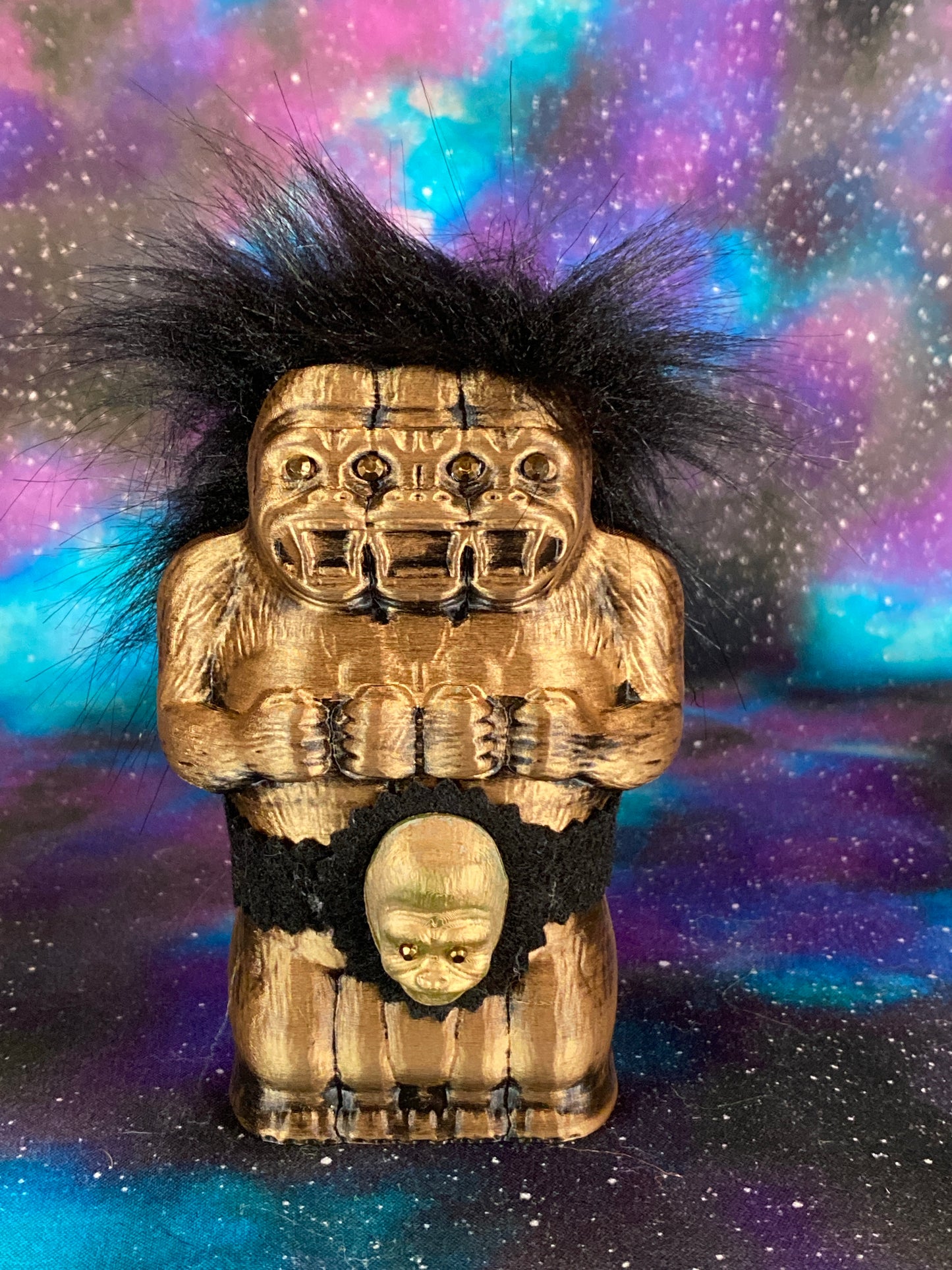 Golden Freak Ape with a Golden Ape belt. Three heads + one. Bronze rhinestone eyes.