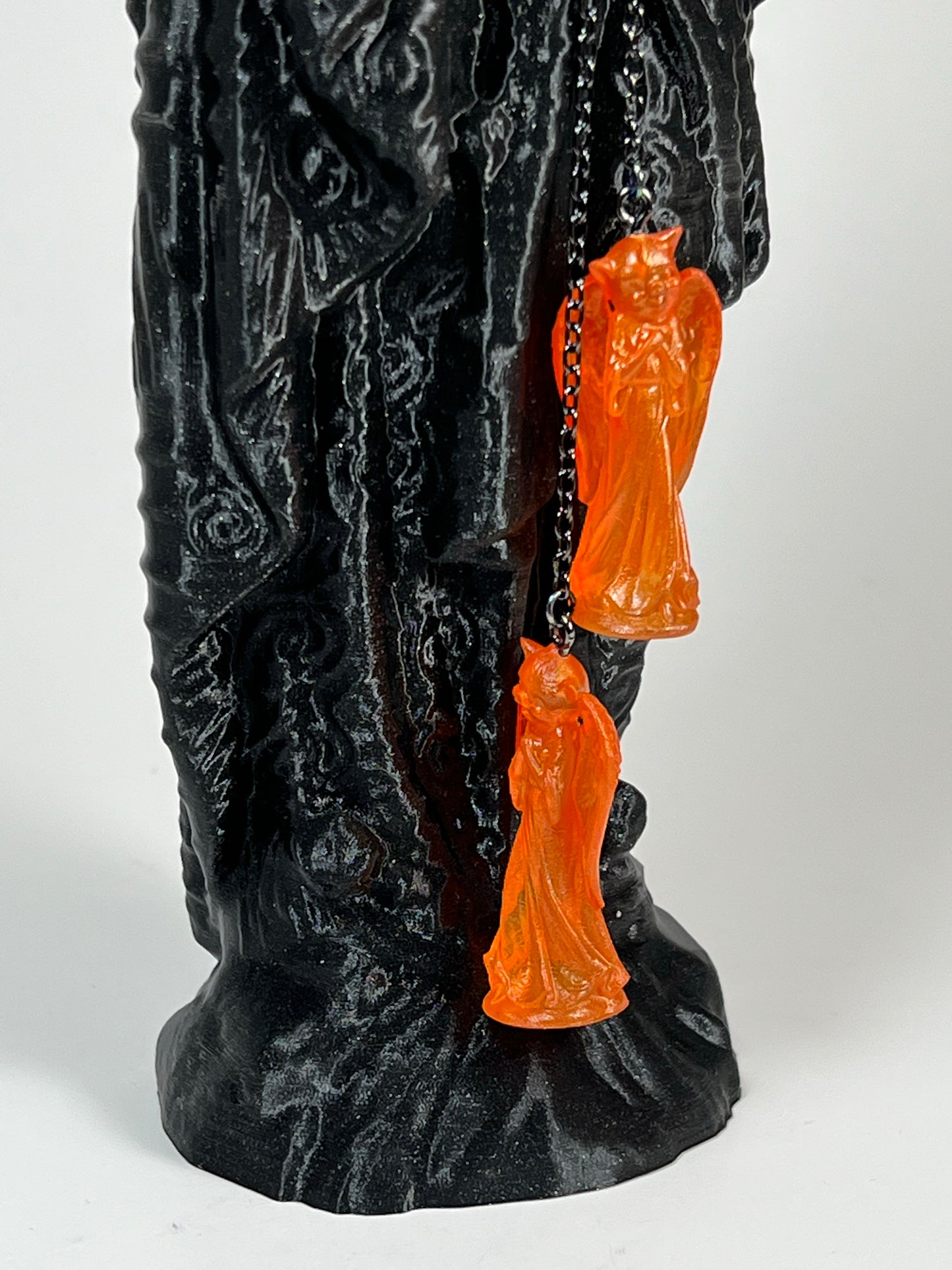 Printed in glitter black and highlighted in pearlescent orange. A pair of angel pigs hang from holy chains. About 10”