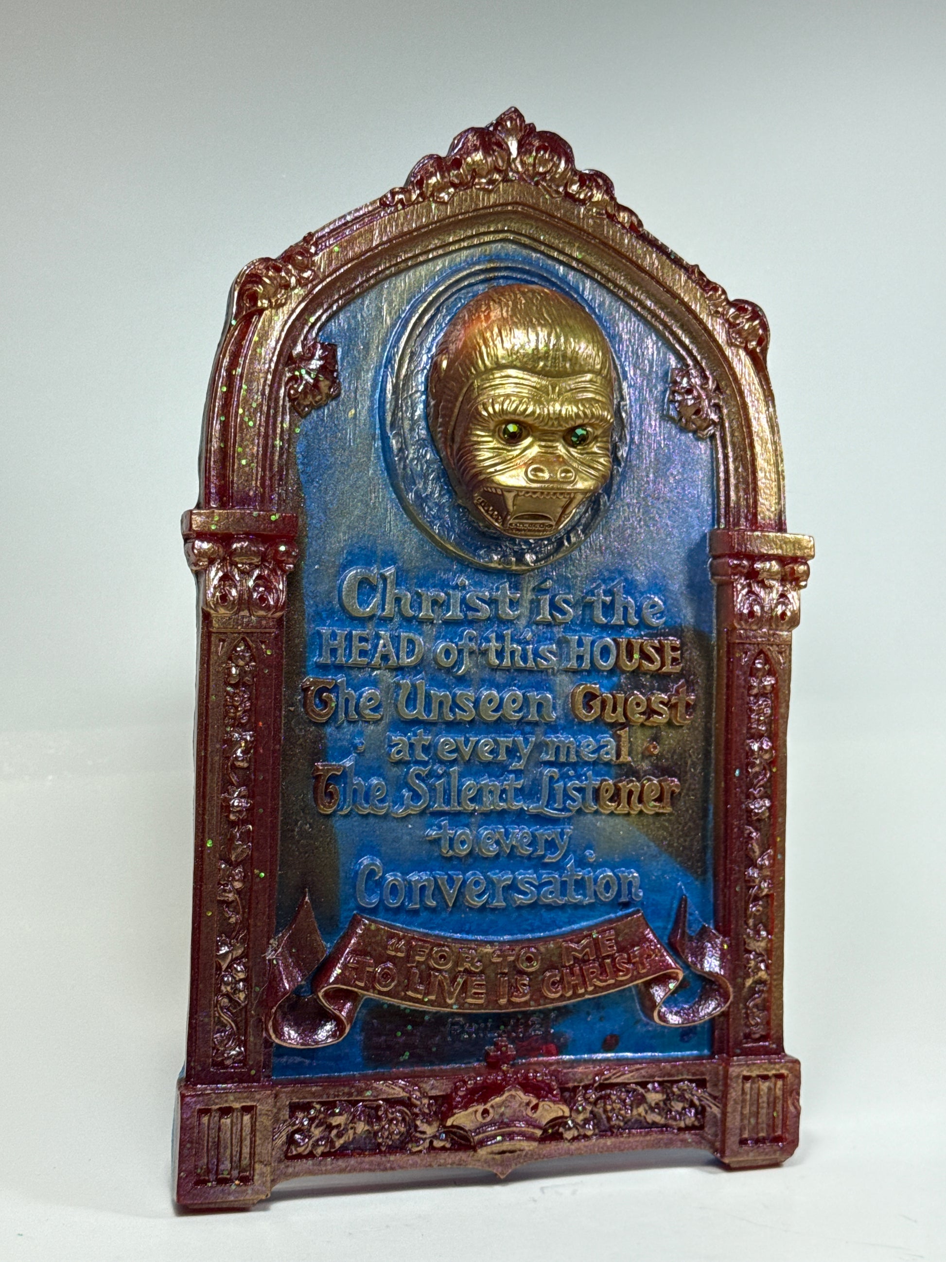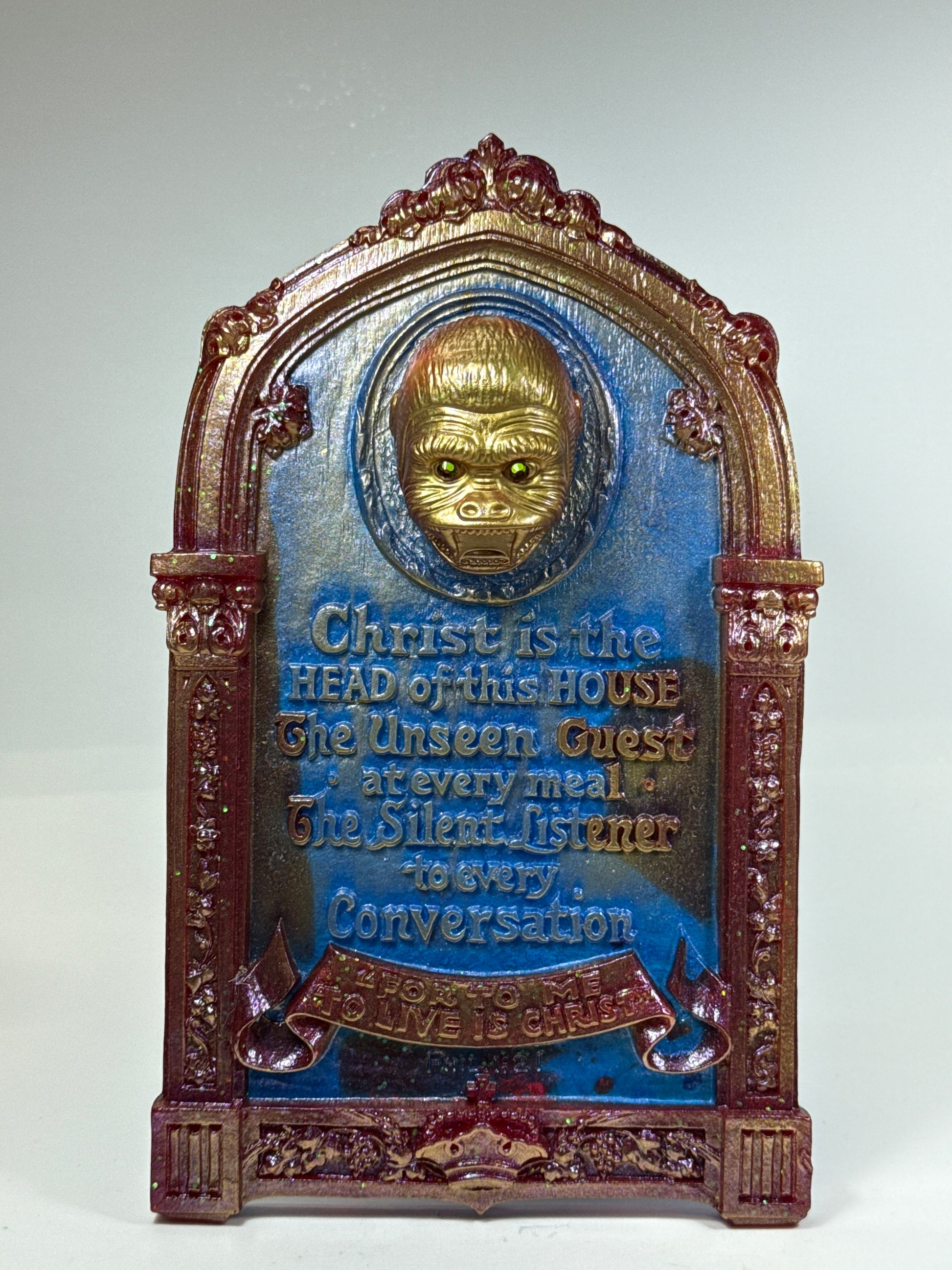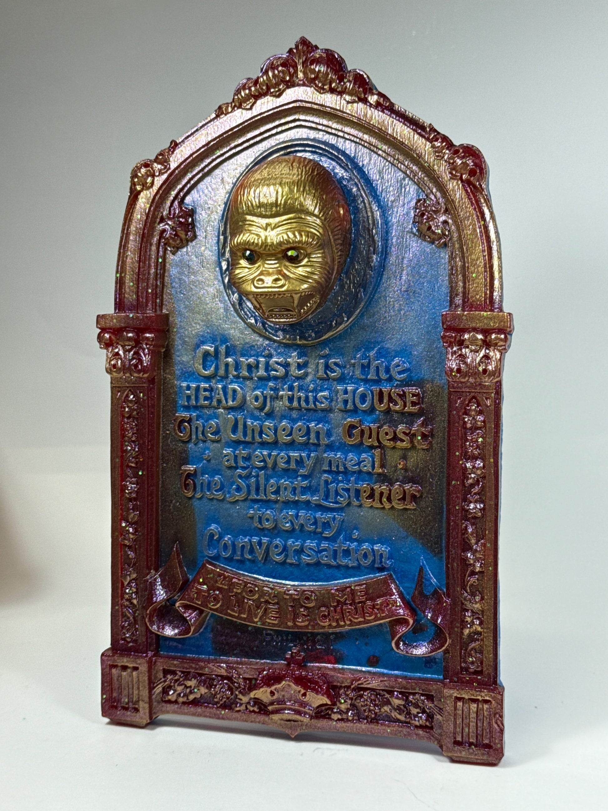 Jesus wall plaque with an ape head and threatening message.