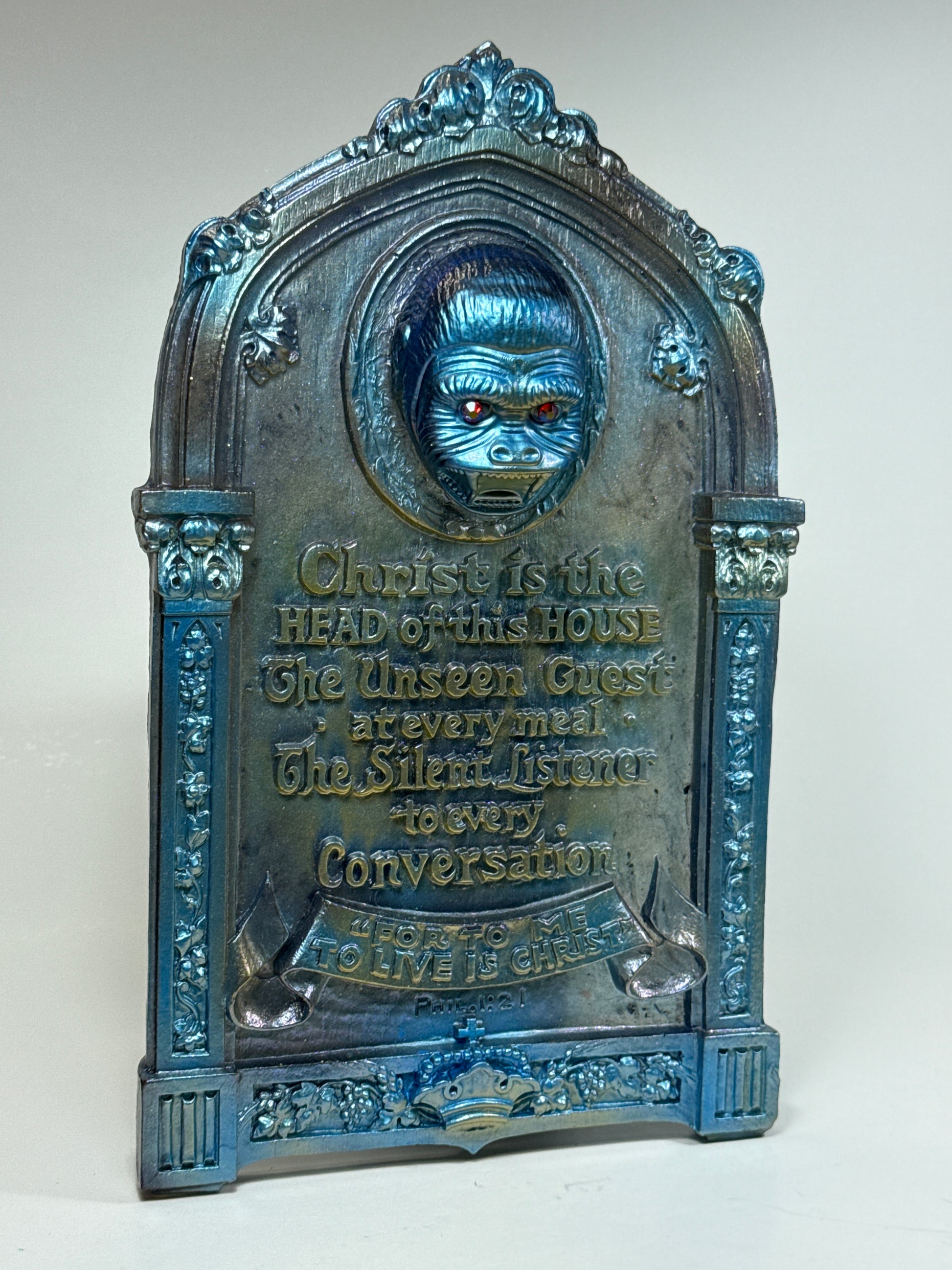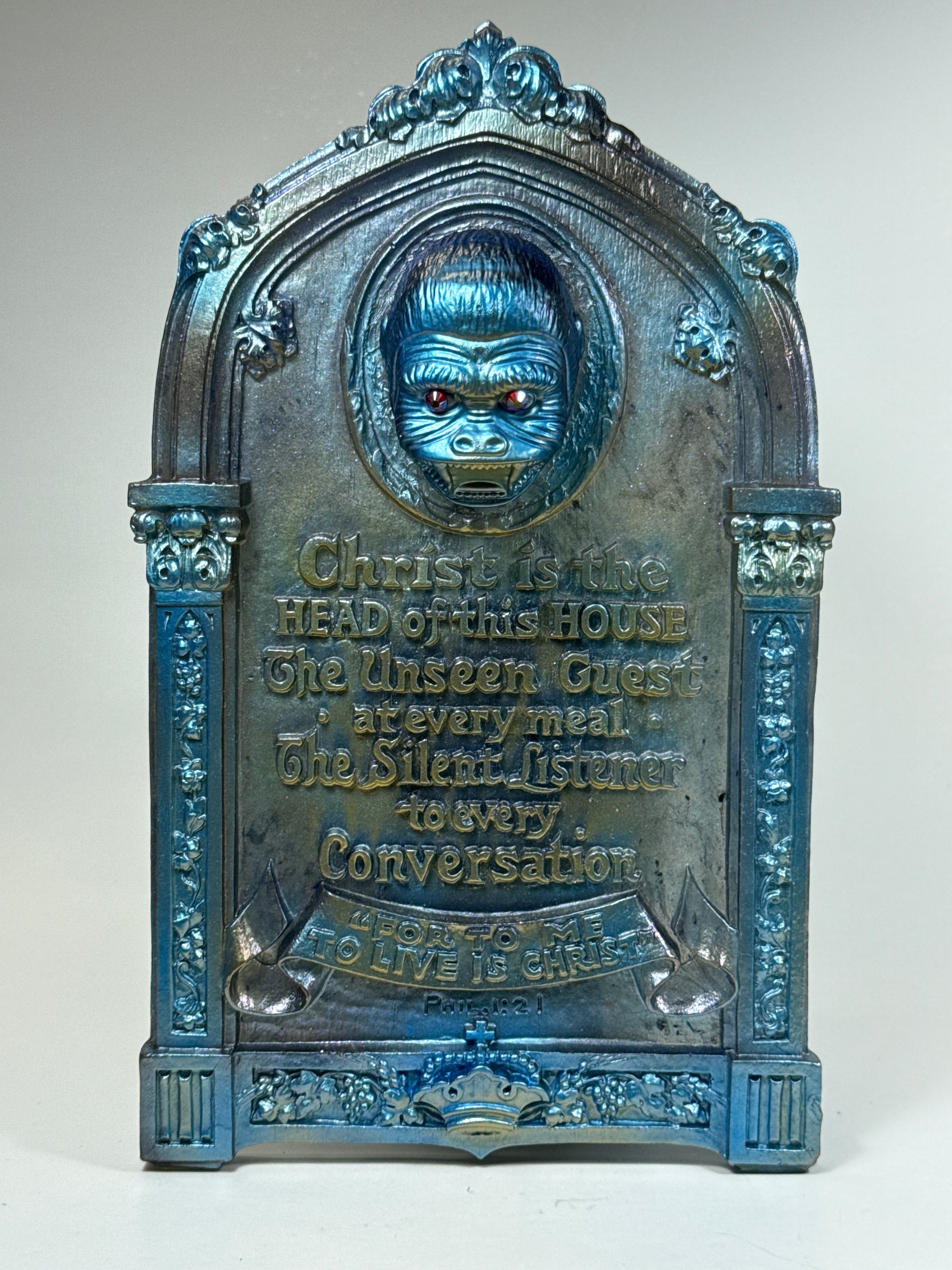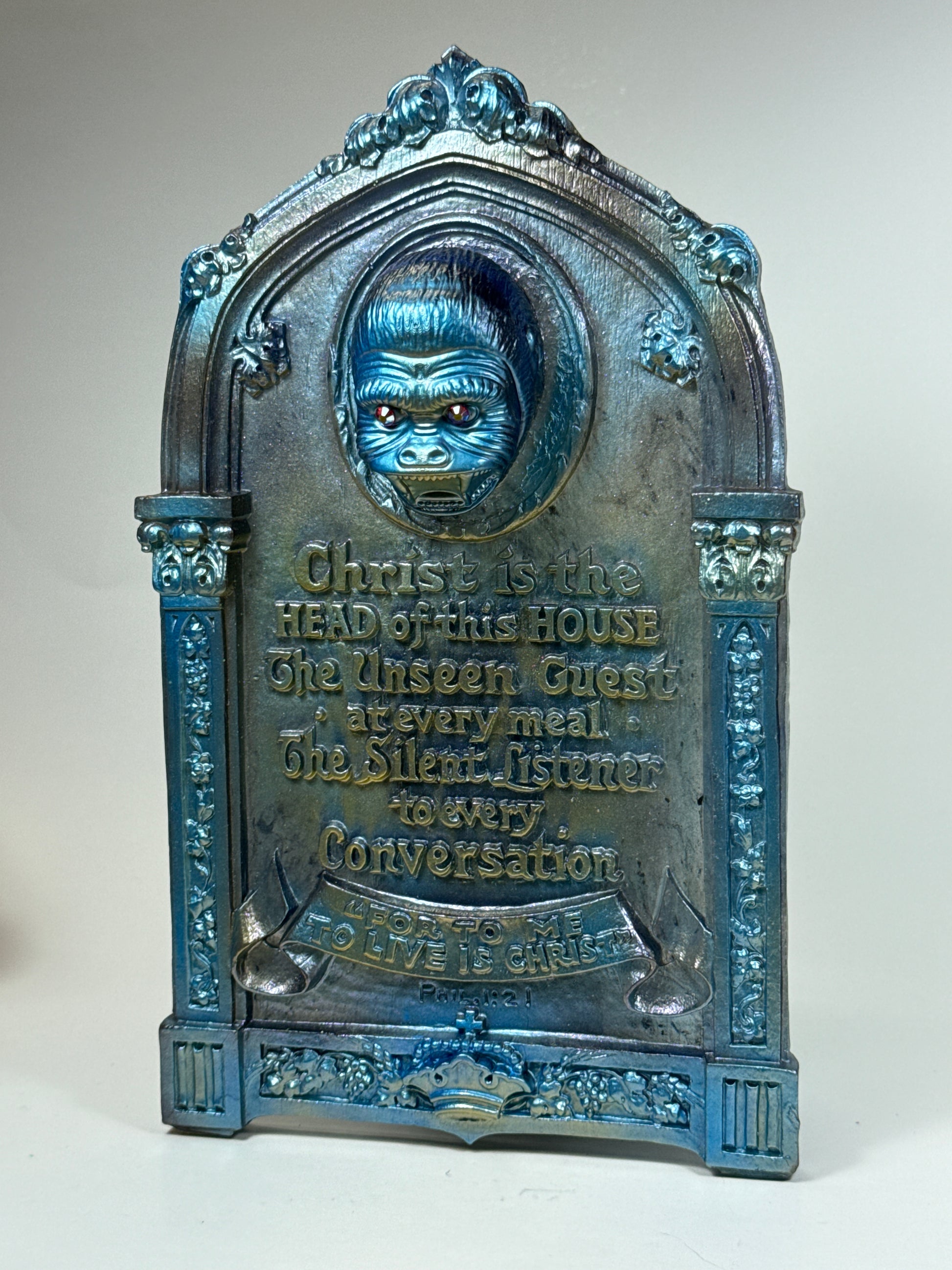 Jesus wall plaque with an ape head and threatening message.