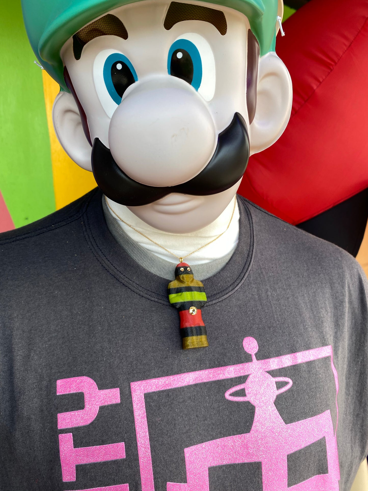 Flat ape necklace printed in 4 colors of glitter plastic. 3” tall. 18” chain. Perfect.