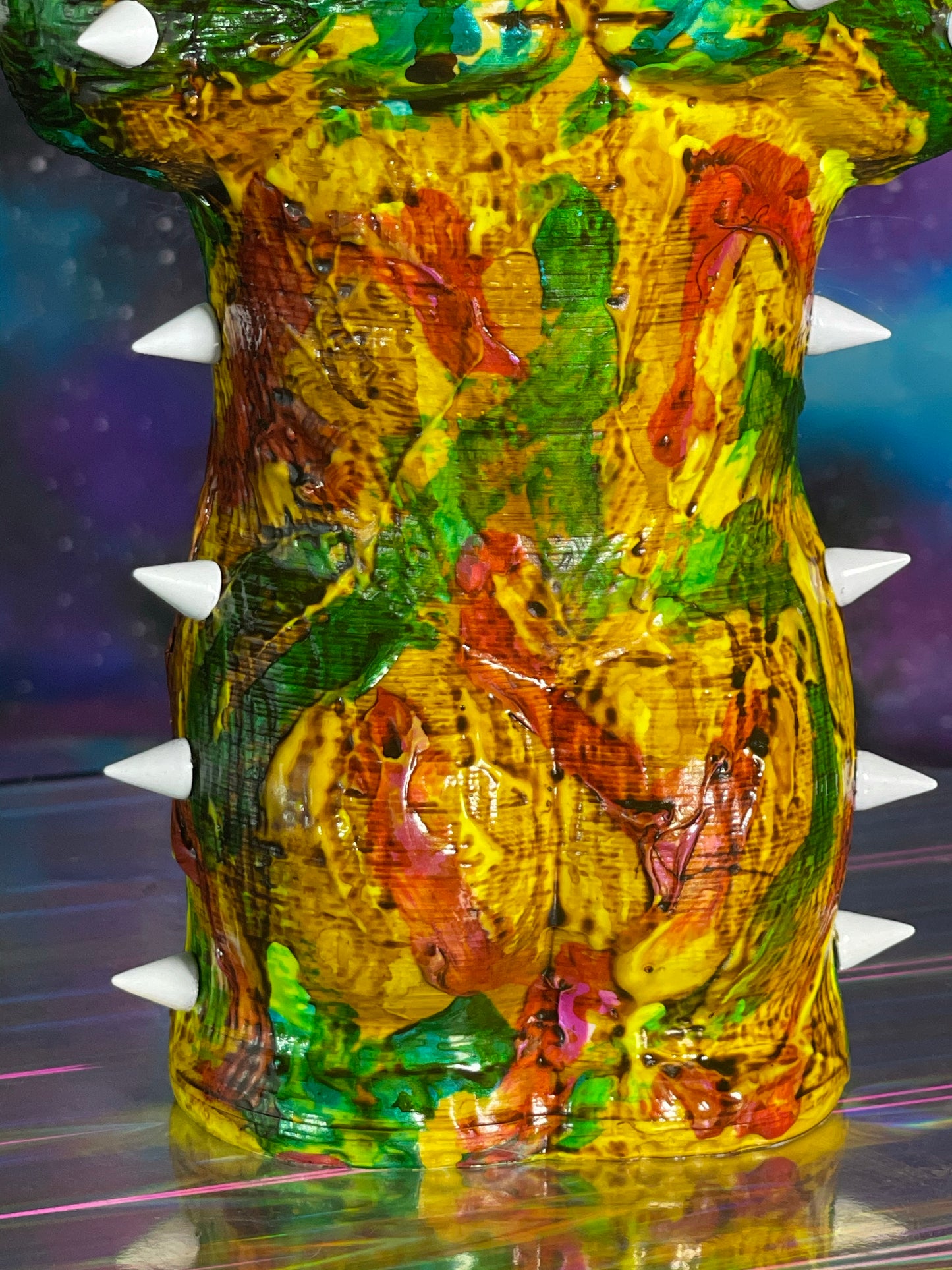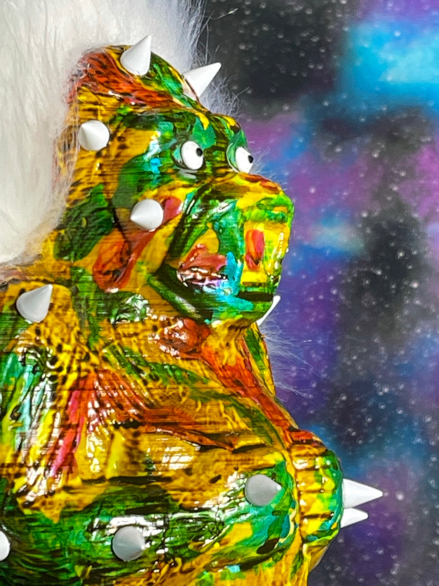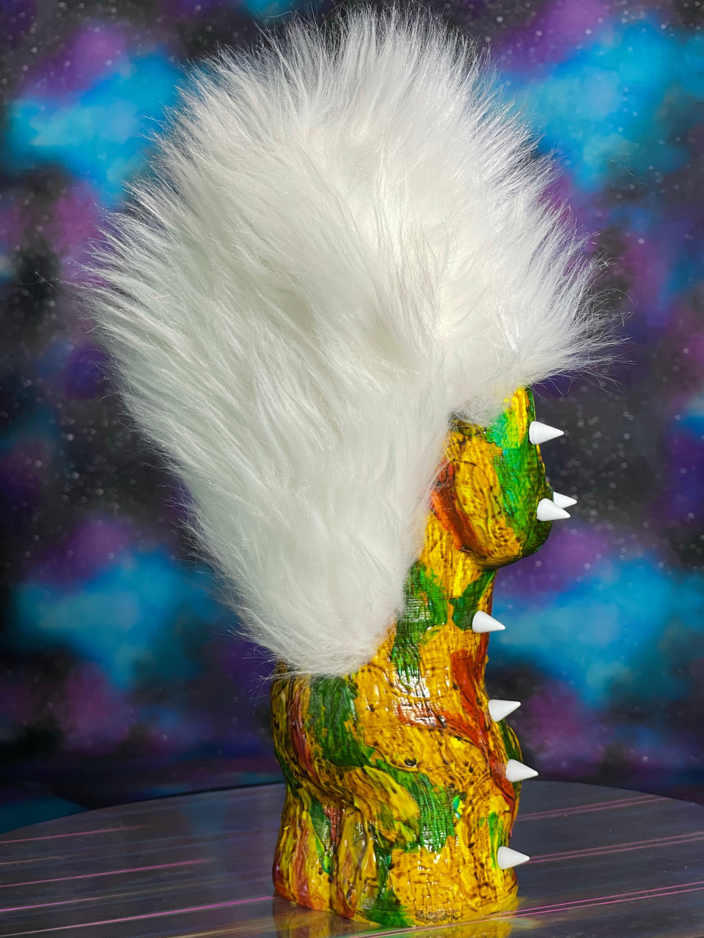 Ape printed in white, painted iridescent blue and pink, fluorescent yellow, stained with ink, etc etc.... a real rough and trouble adventure in ape making. Topped off with white things. About 11” tall.