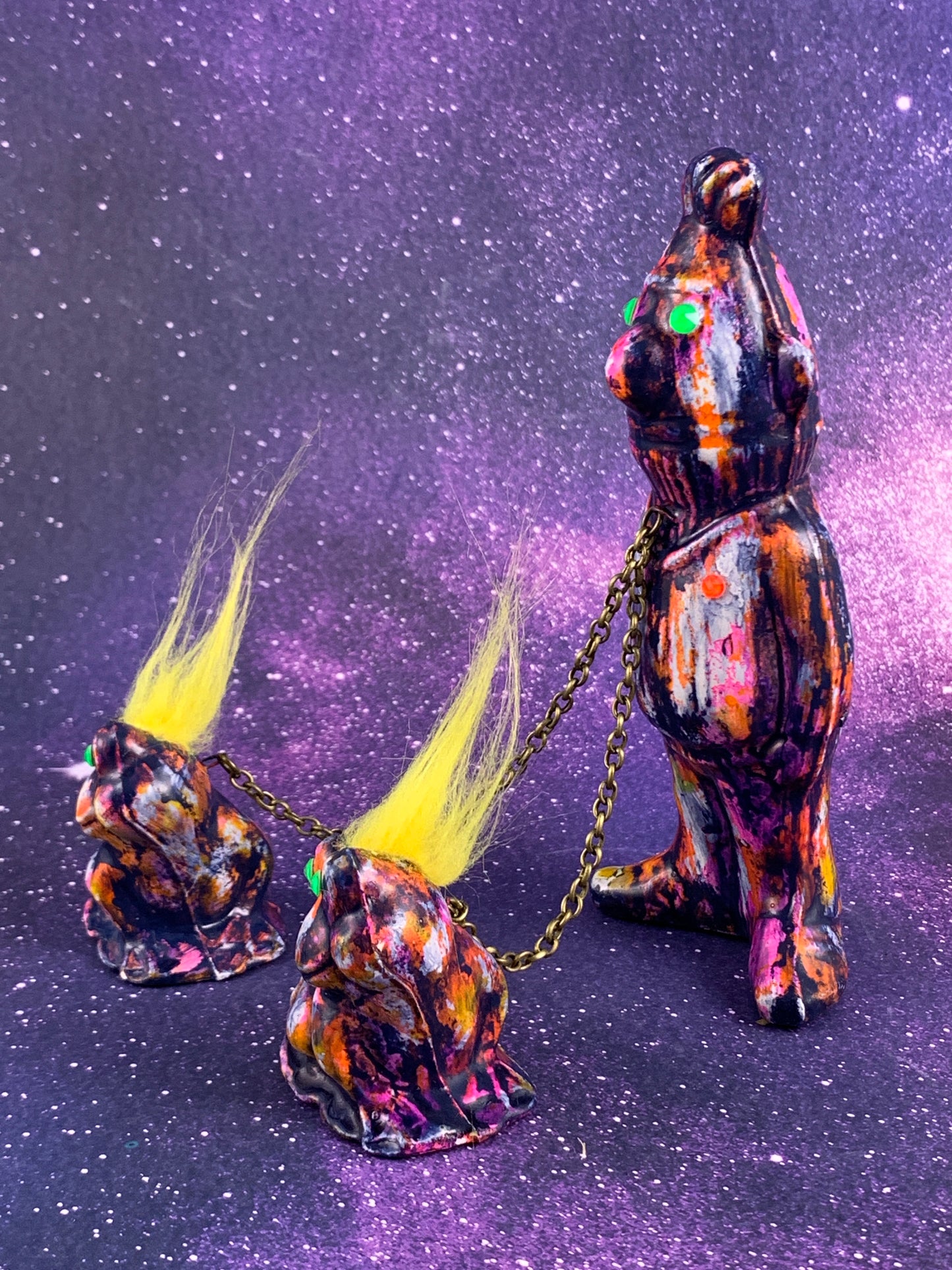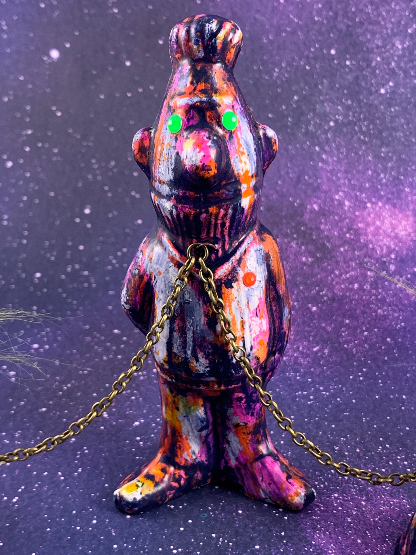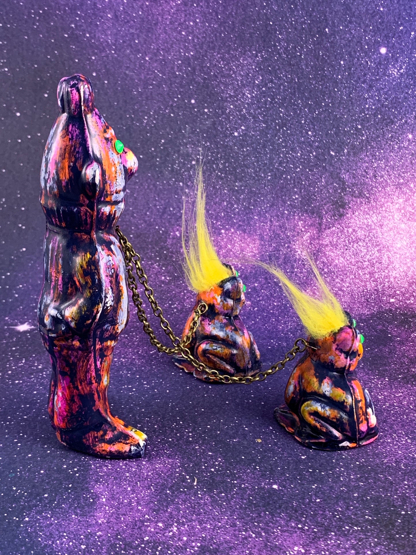 Bert is in charge of these two frogs. What can go wrong? Glazed in white, painted and treated with a few colors of ink. Finished with neon rhinestones.