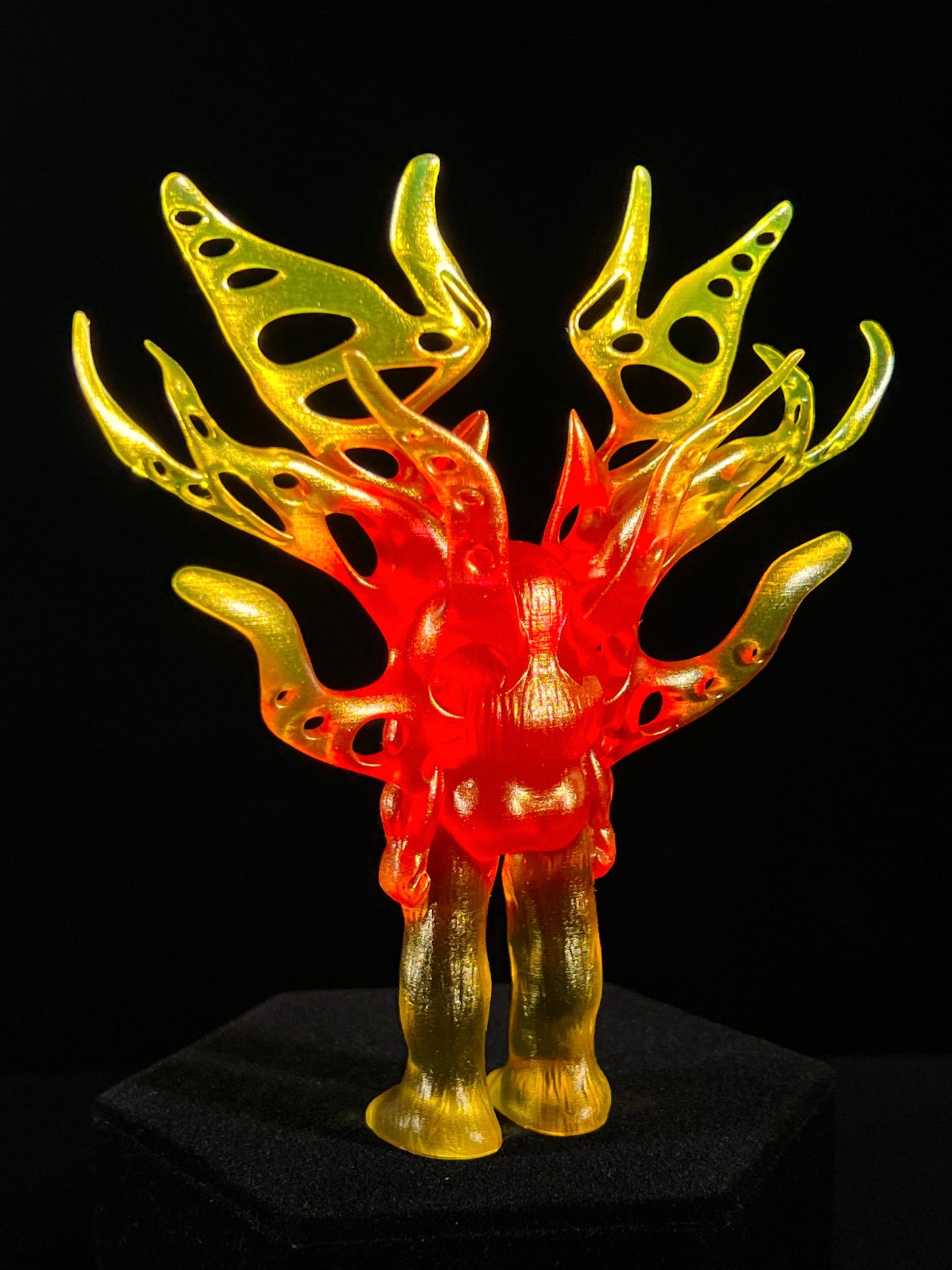 Resin printed, painted yellow/red and dusted gold chrome. About 5”