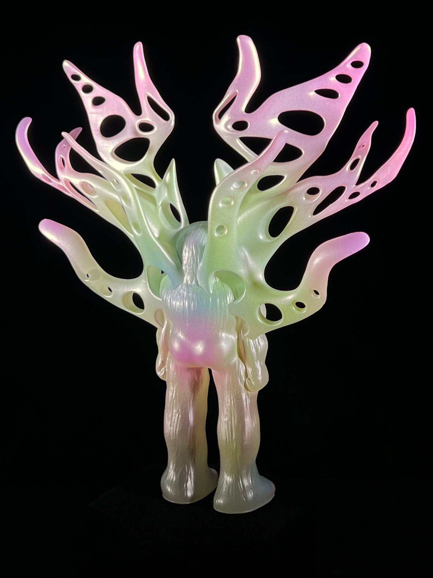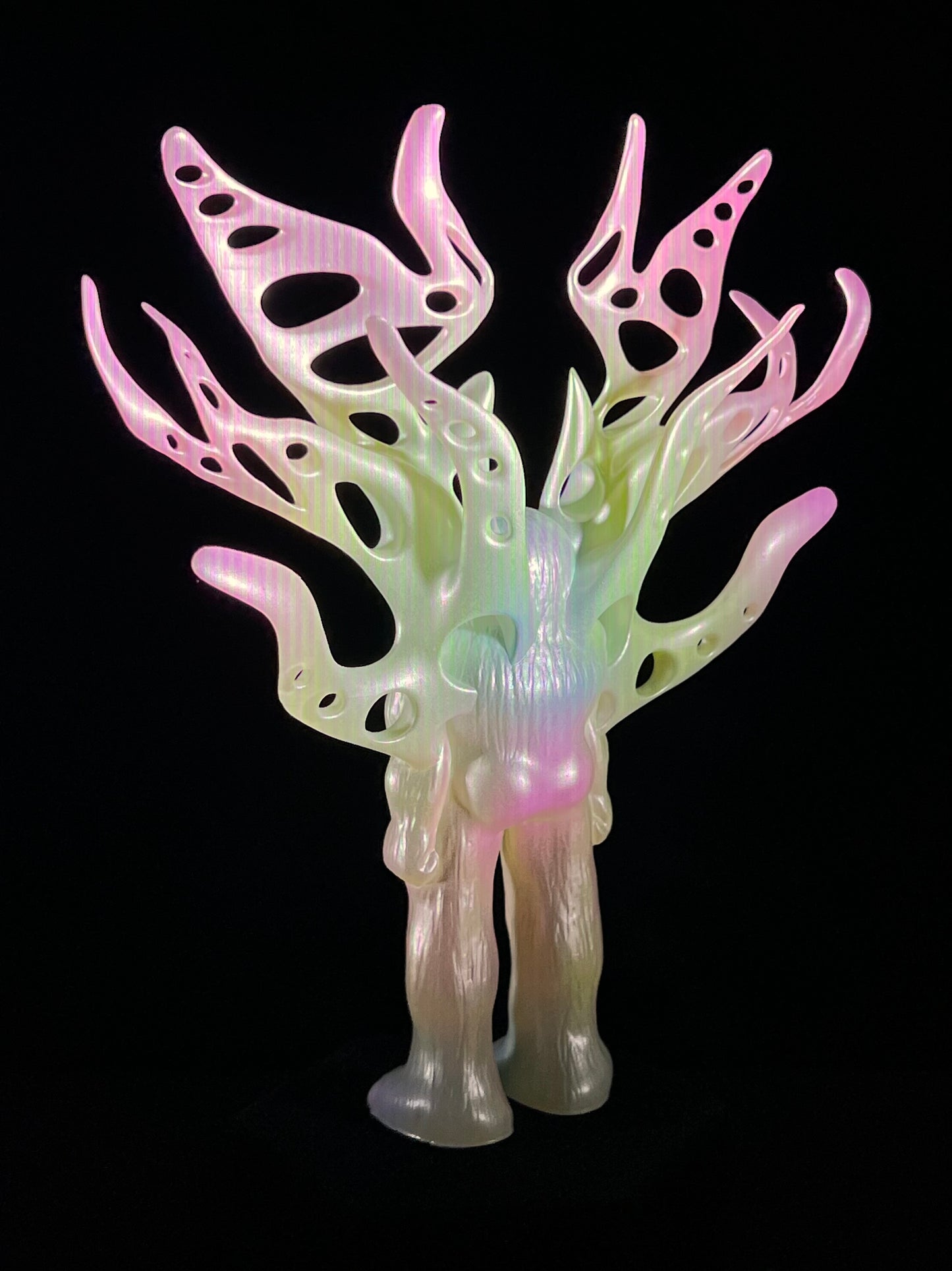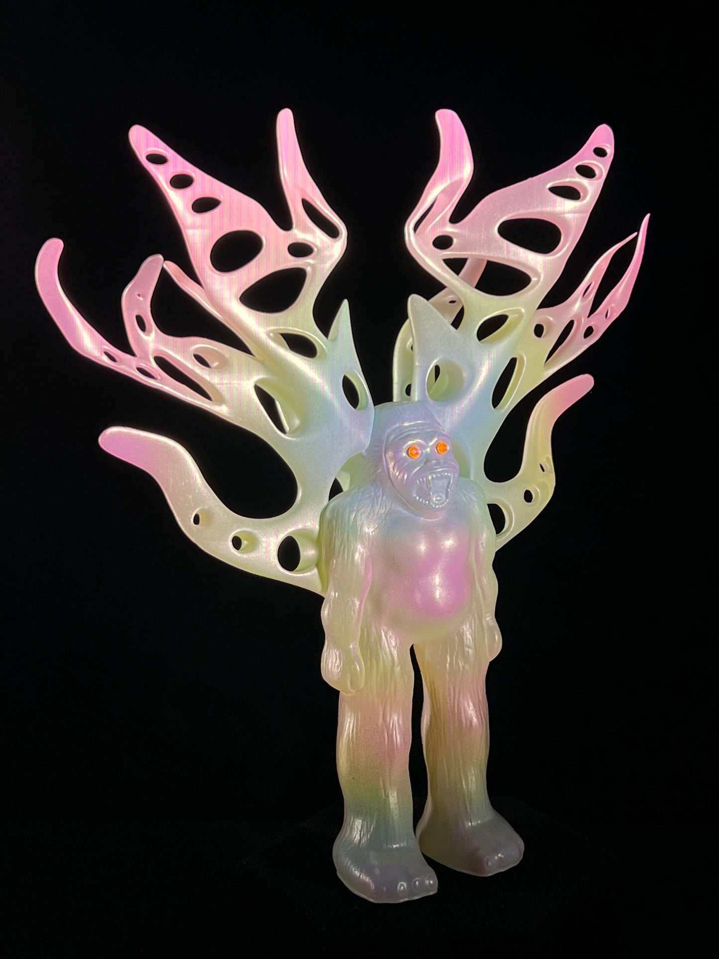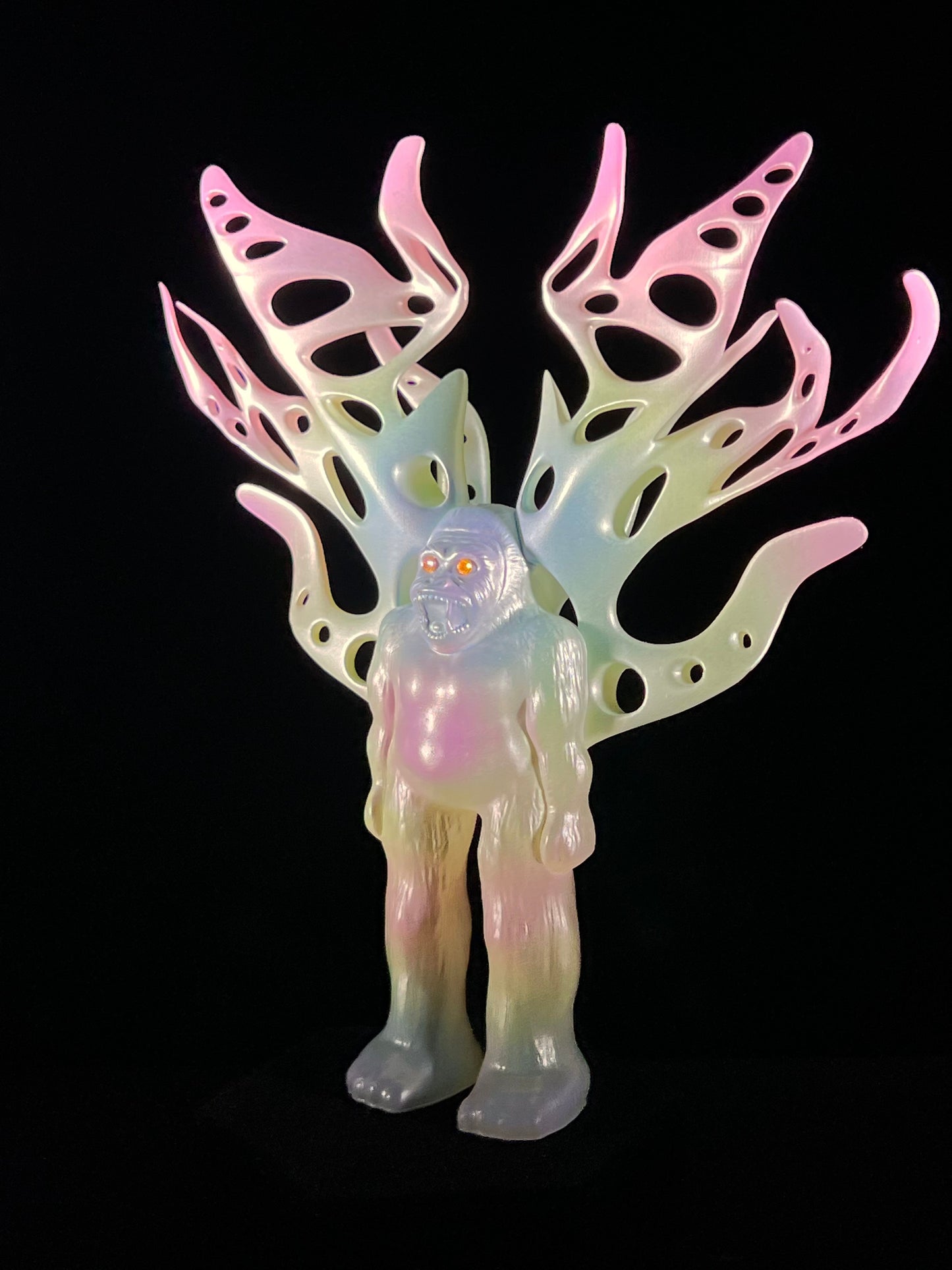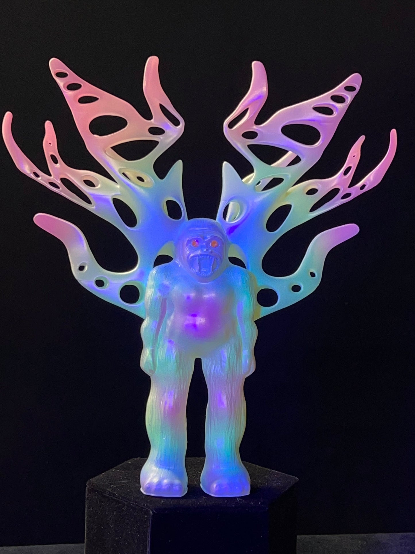 Resin printed, painted pastel and dusted chrome. UV reactive. About 8”