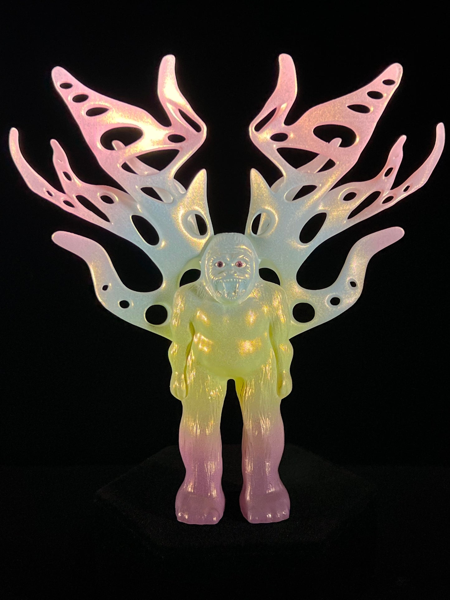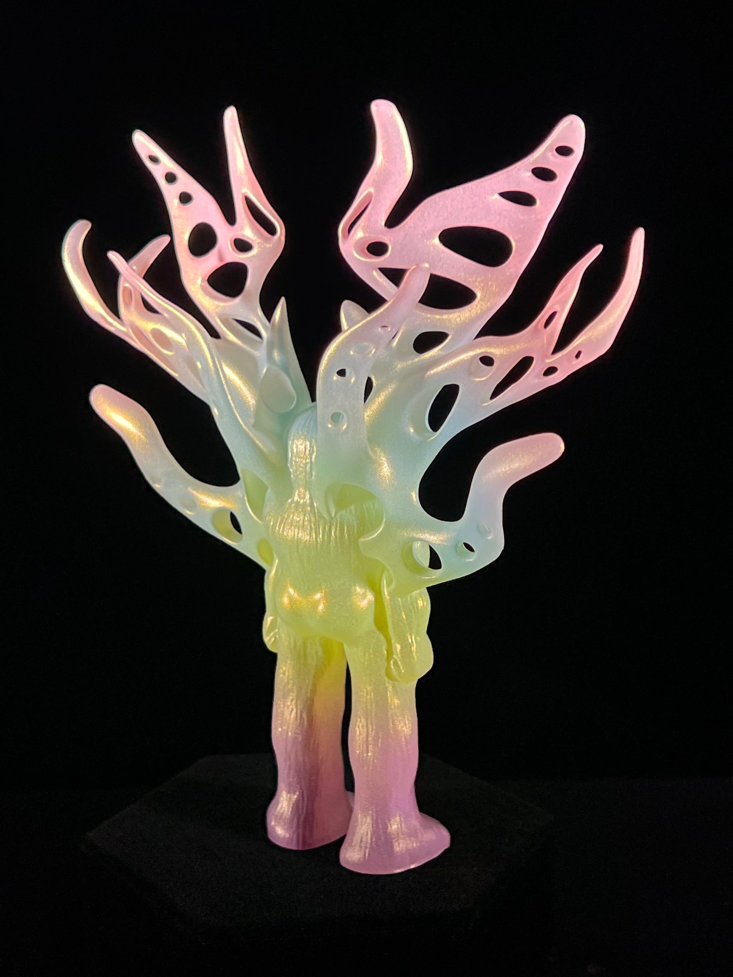 Resin printed, painted pastel and dusted gold chrome. UV reactive. About 6”